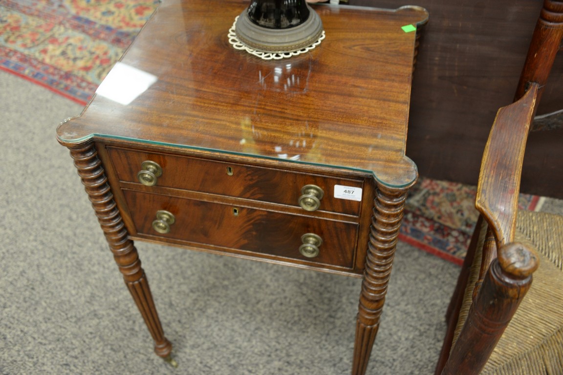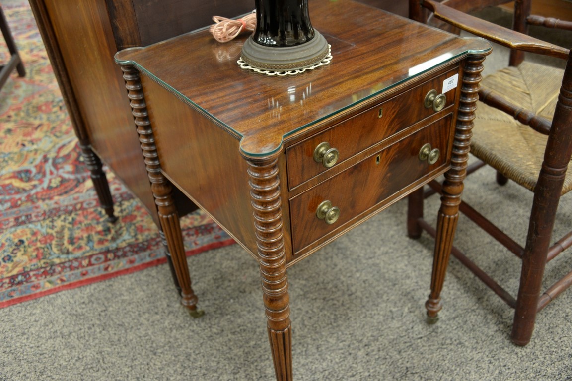 Lot 487: Sheraton mahogany work table with shaped top over two drawers on turned and fluted legs, circa 1830. ht. 30in., top: 16 1/2 x 18 3/…
