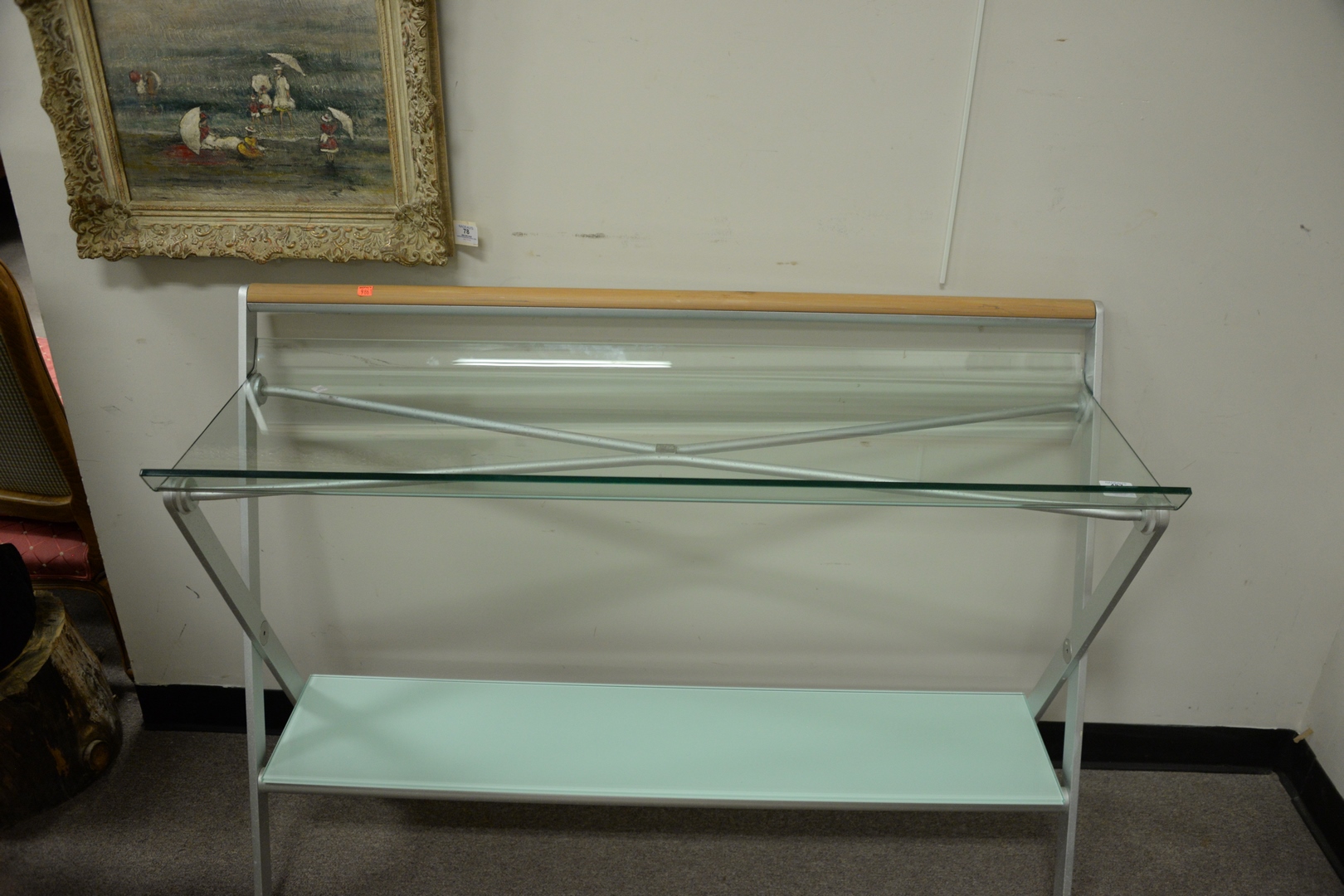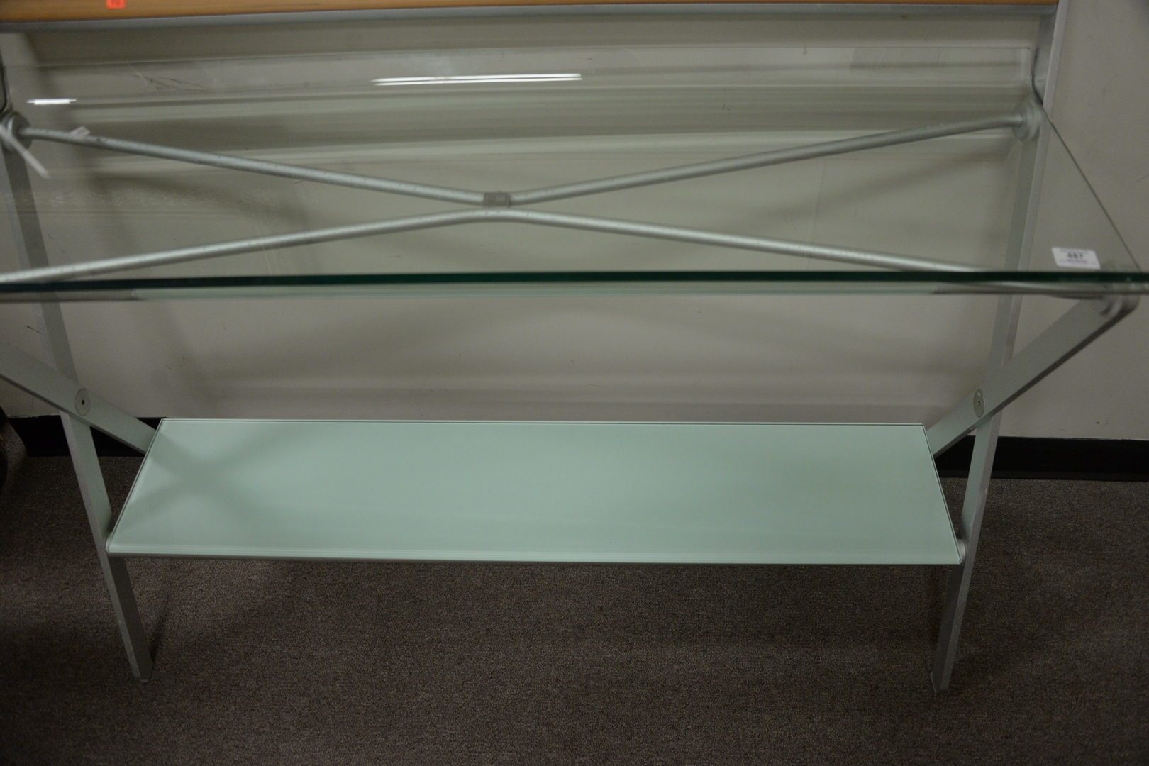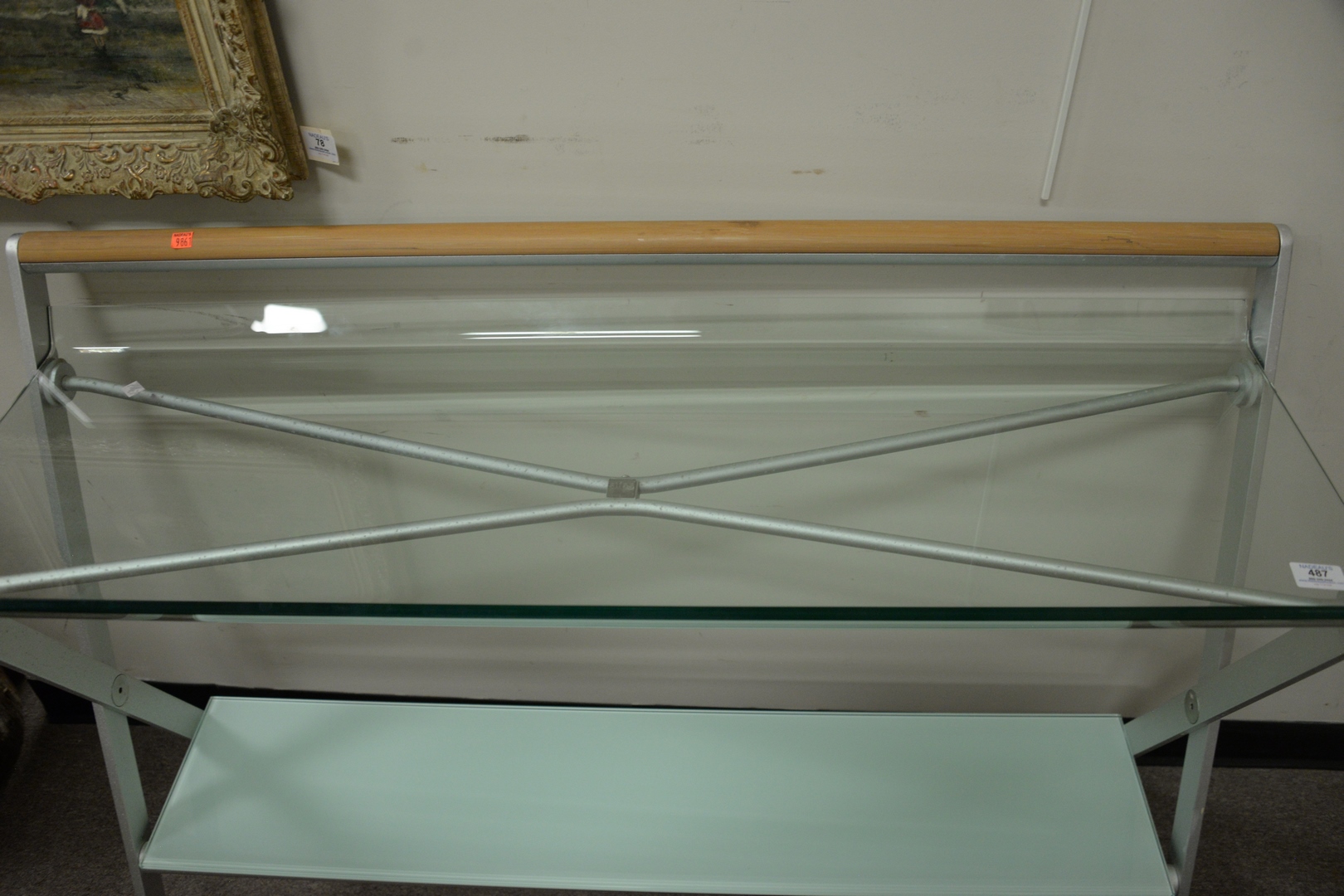 Lot 487: Sifas Indoor/Outdoor Oskar Wall Table, having carved glass top, height 32 inches, length 46 inches, depth 16 1/2 inches, retails $1,495 new. Provenance: David and Cynthia Kim, 22 Stoney Wylde Lane, Greenwich, Connecticut. View home by visiting: https://www.zillow.com/homedetails/22-Stoney-Wylde-Ln-Greenwich-CT-06830/177238281_zpid/