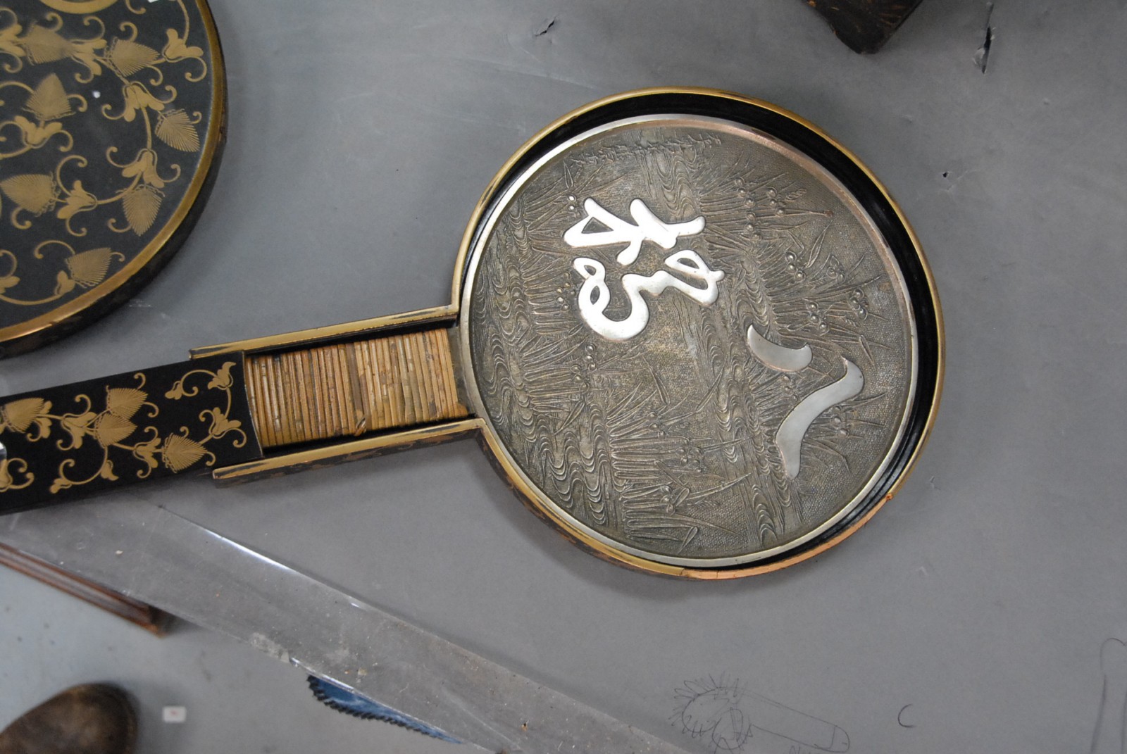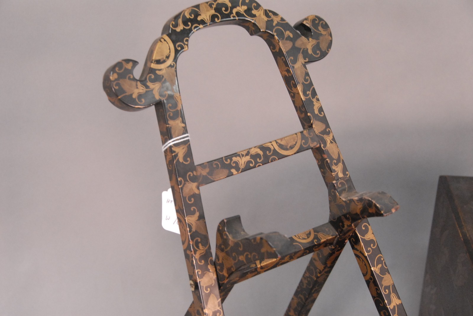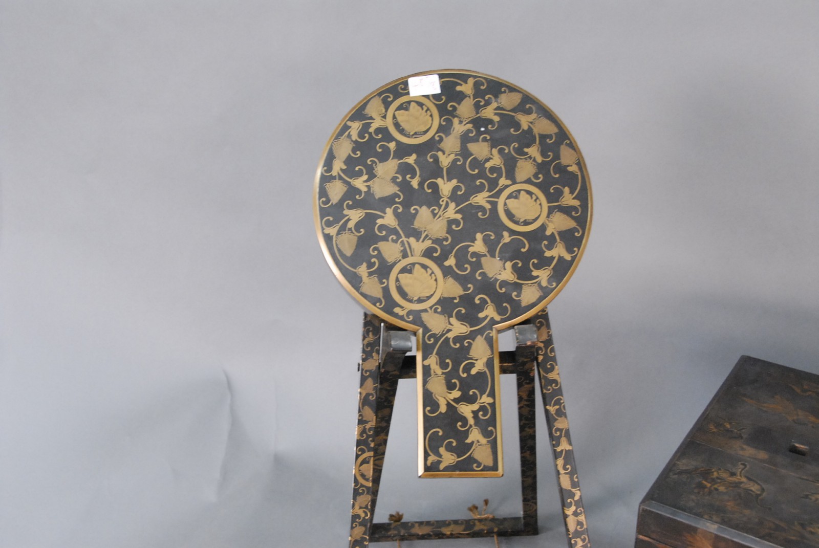 Small Japanese two drawered black lacquered travel box missing a handle, 20th century, and a Japanese metal mirror with lacquered and gold case and stand.