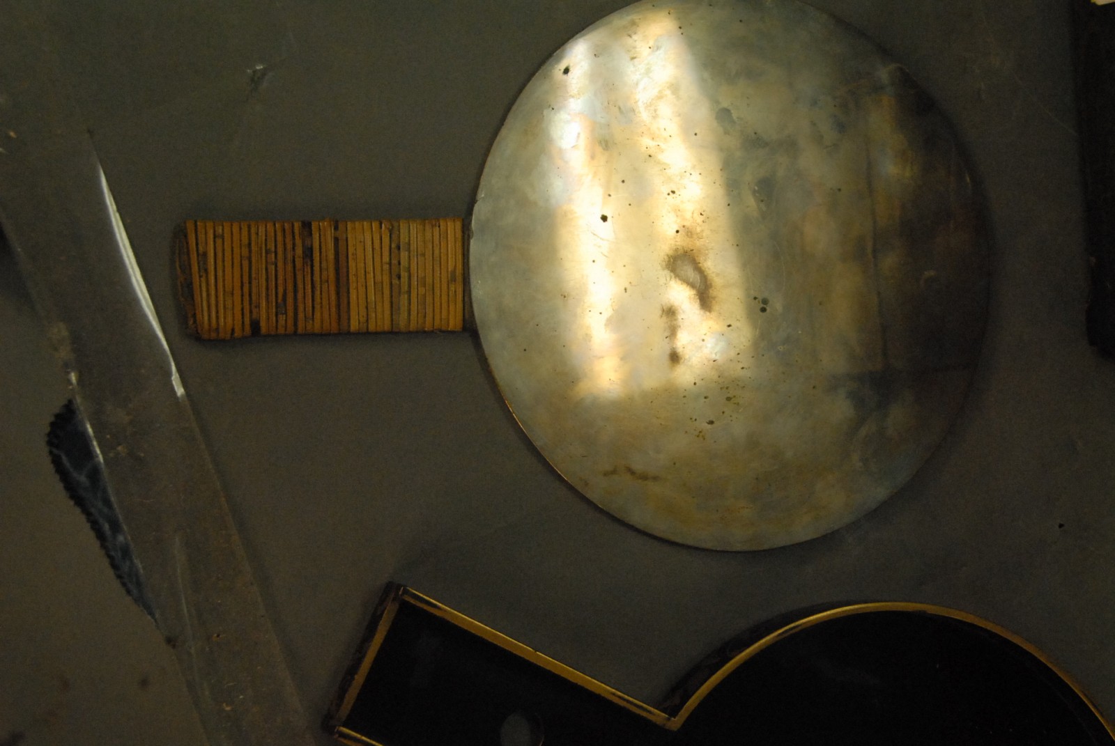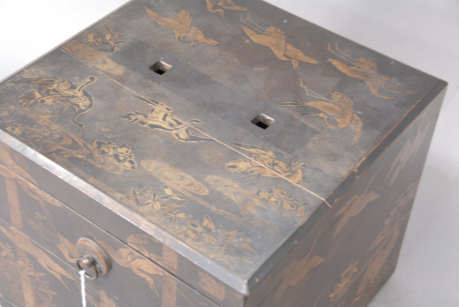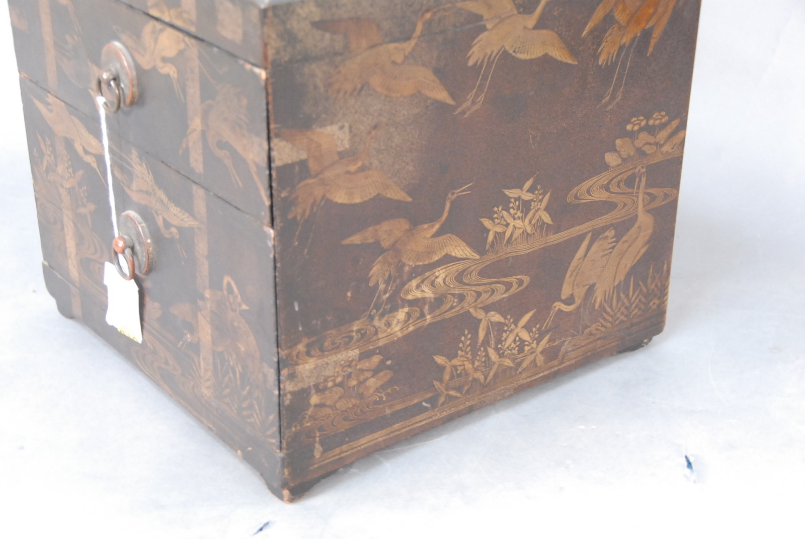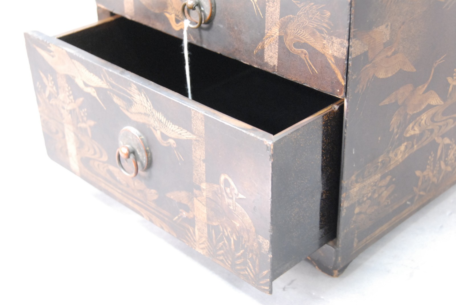 Small Japanese two drawered black lacquered travel box missing a handle, 20th century, and a Japanese metal mirror with lacquered and gold case and stand.
