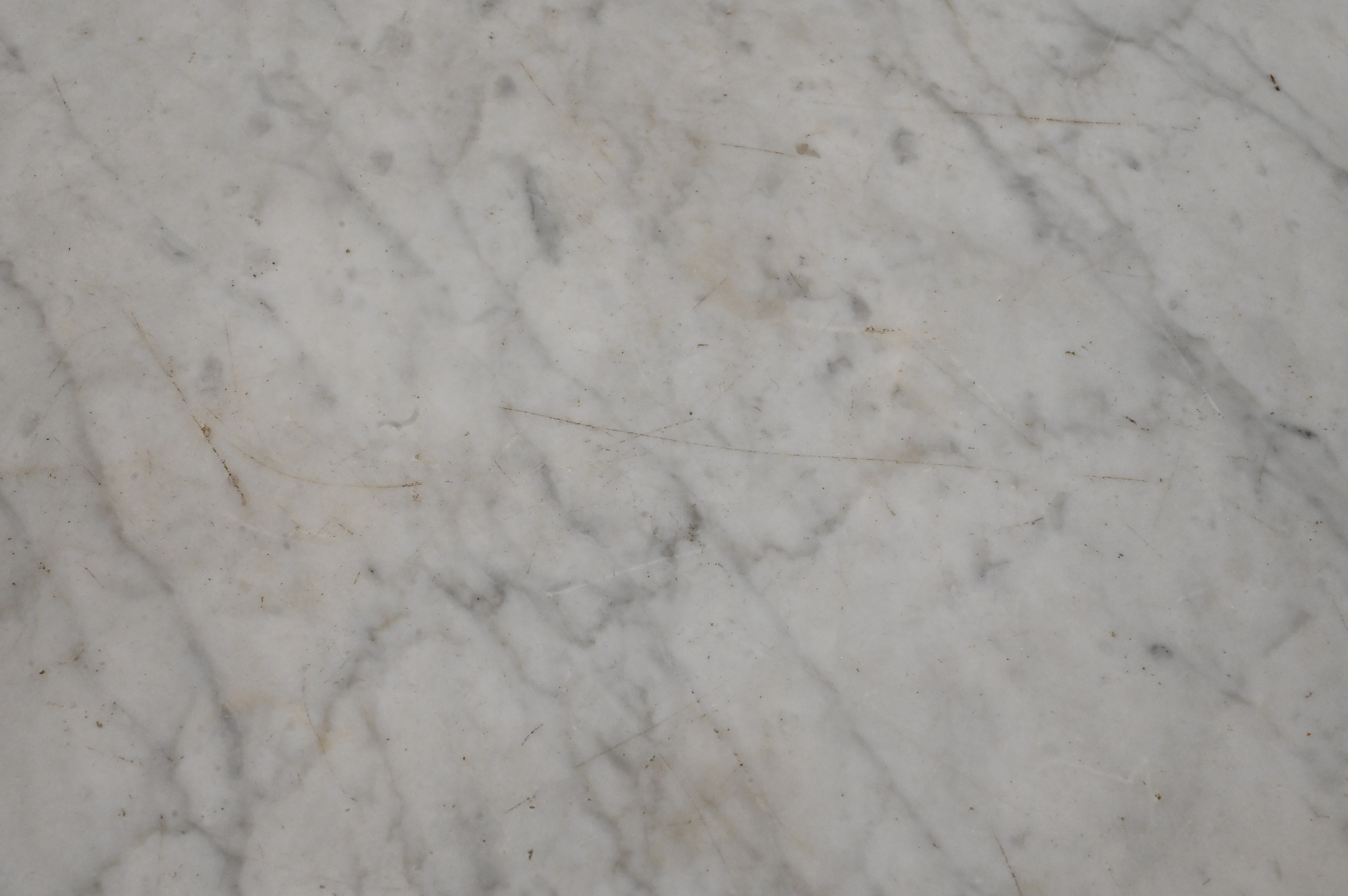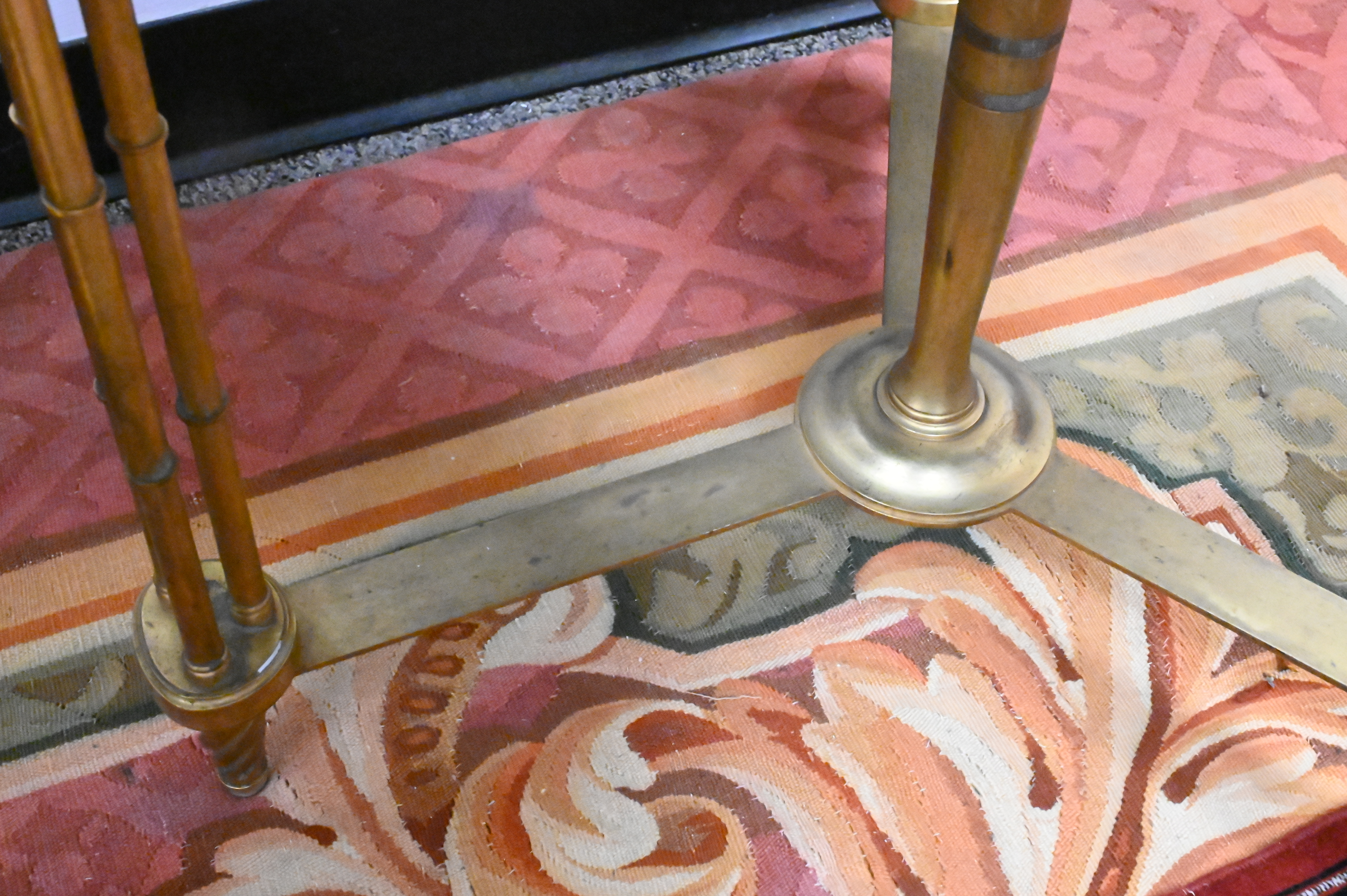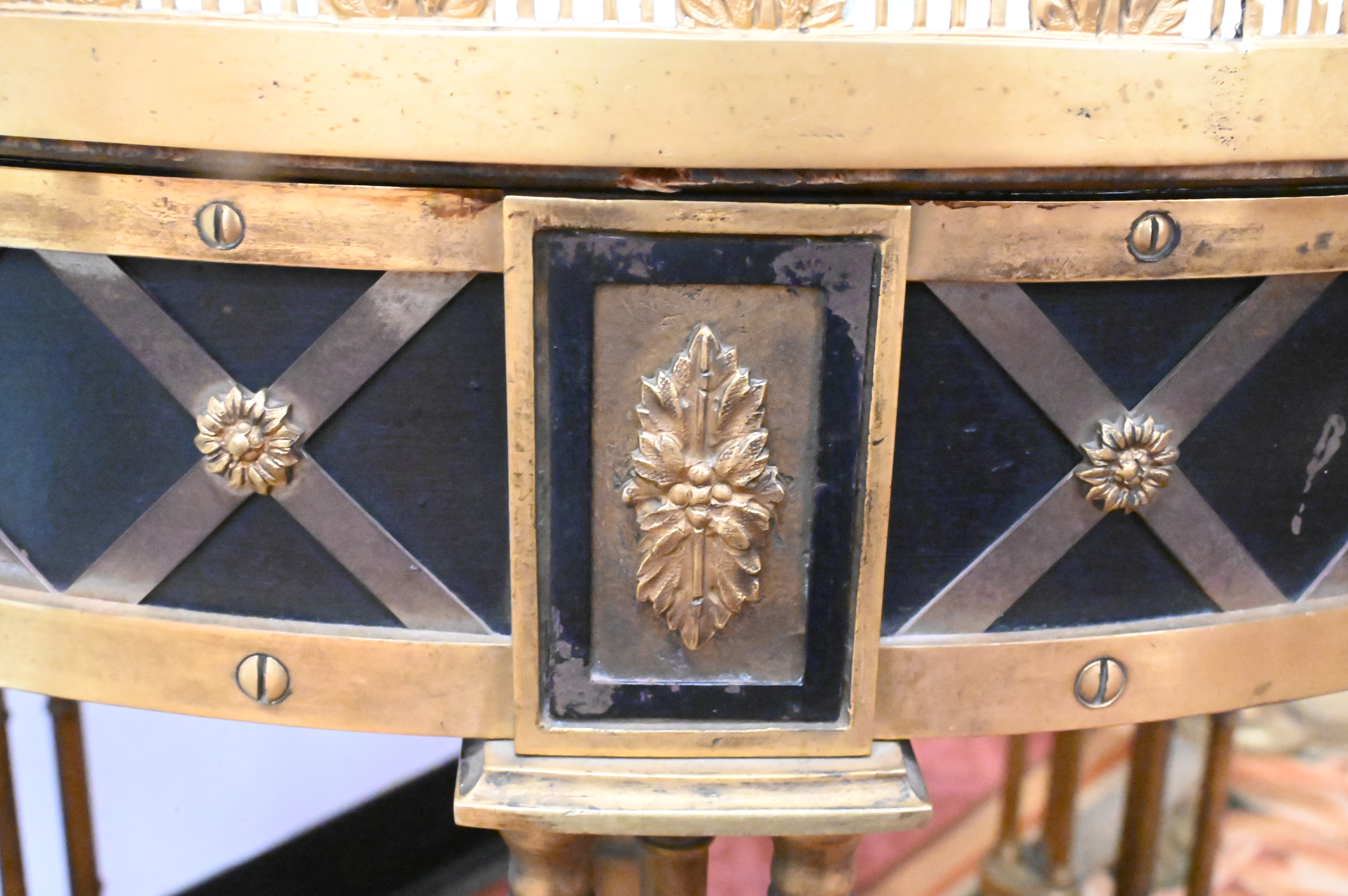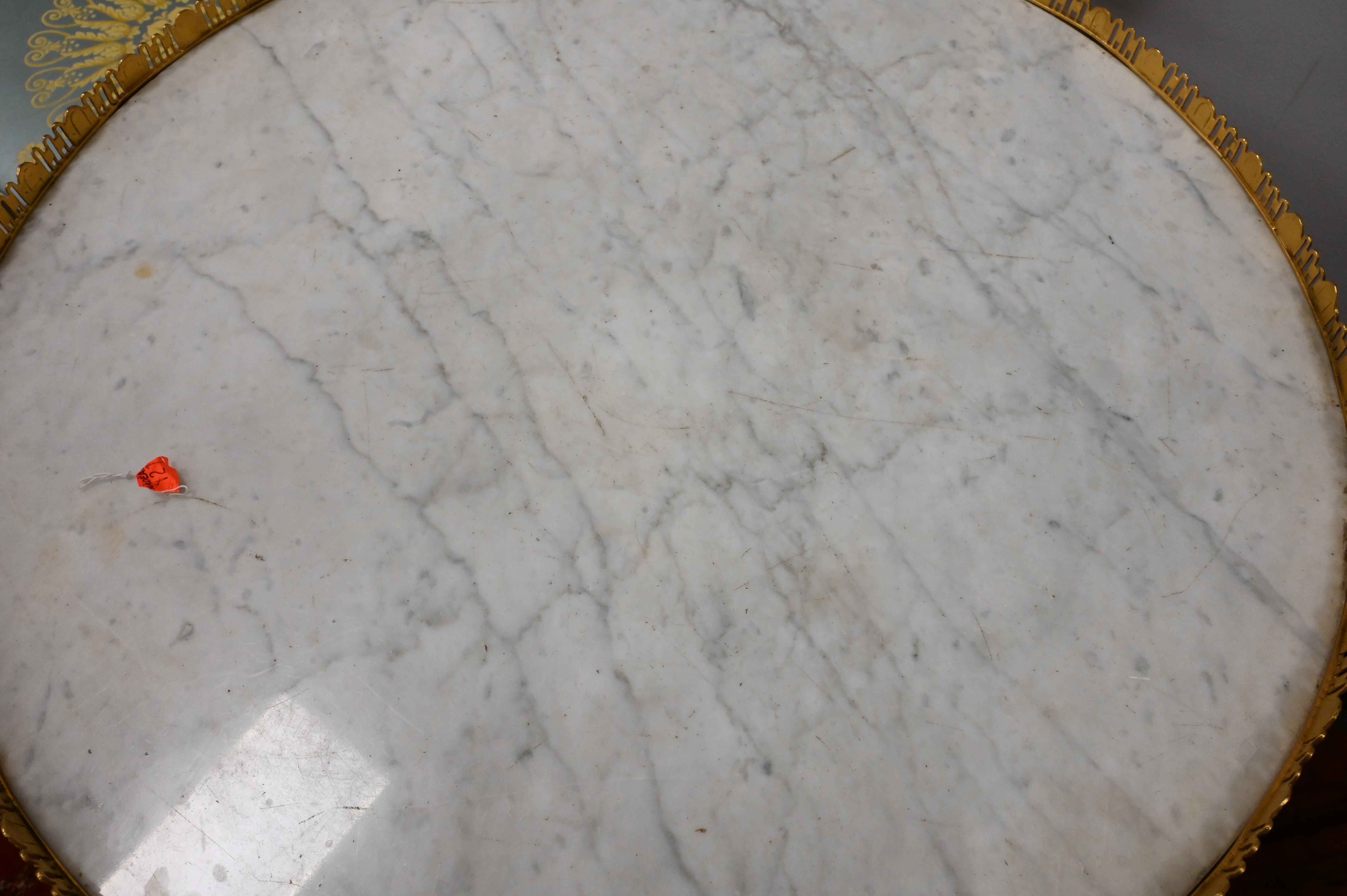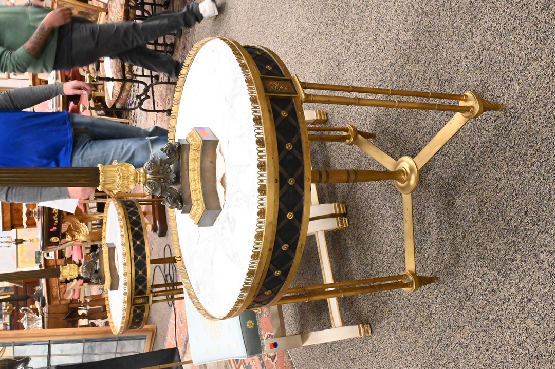 having circular marble top, each with circular galleried top above a frieze with applied gilt-metal and patinated-metal lattice decoration, raised on three cluster-column legs united by a stretcher, surmounted by a baluster support, the whole raised on gadrooned toupie feet