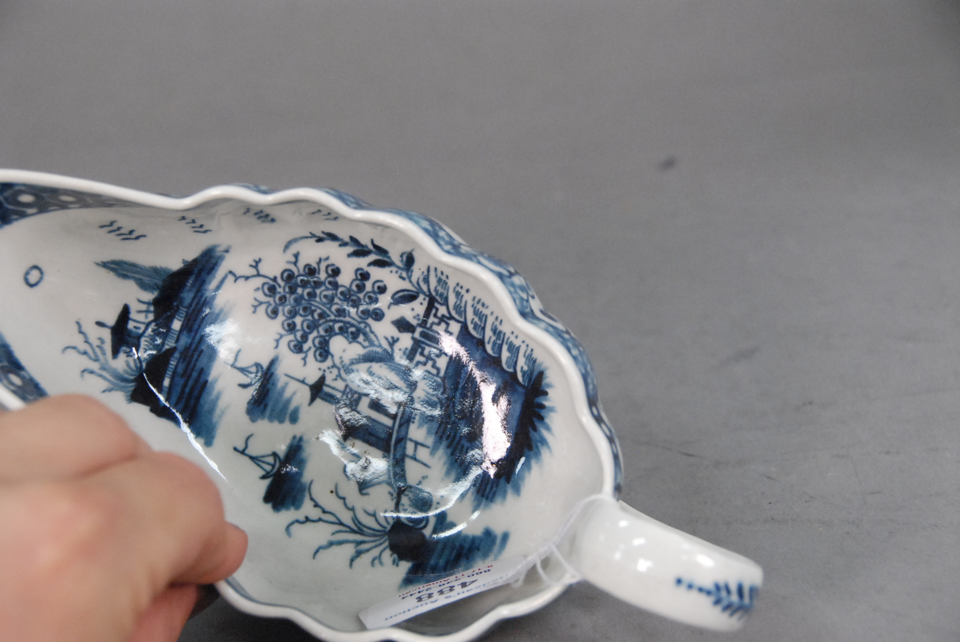 A Worcestershallow fluted sauceboat painted in blue with The Full Moon pattern, the exterior with an elaborate lambrequin border, circa 1775-1780.