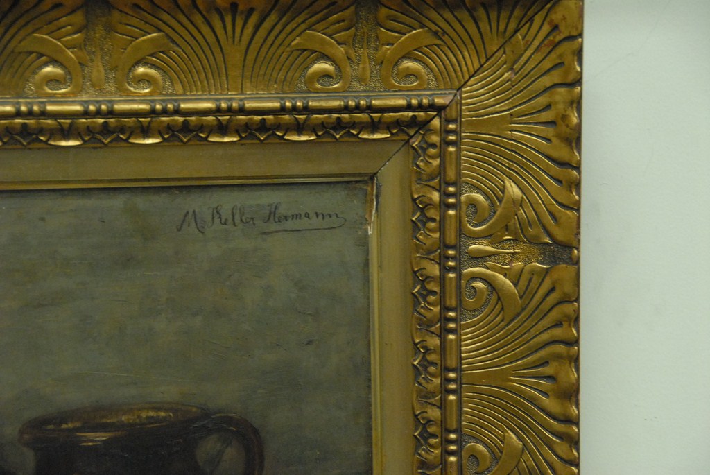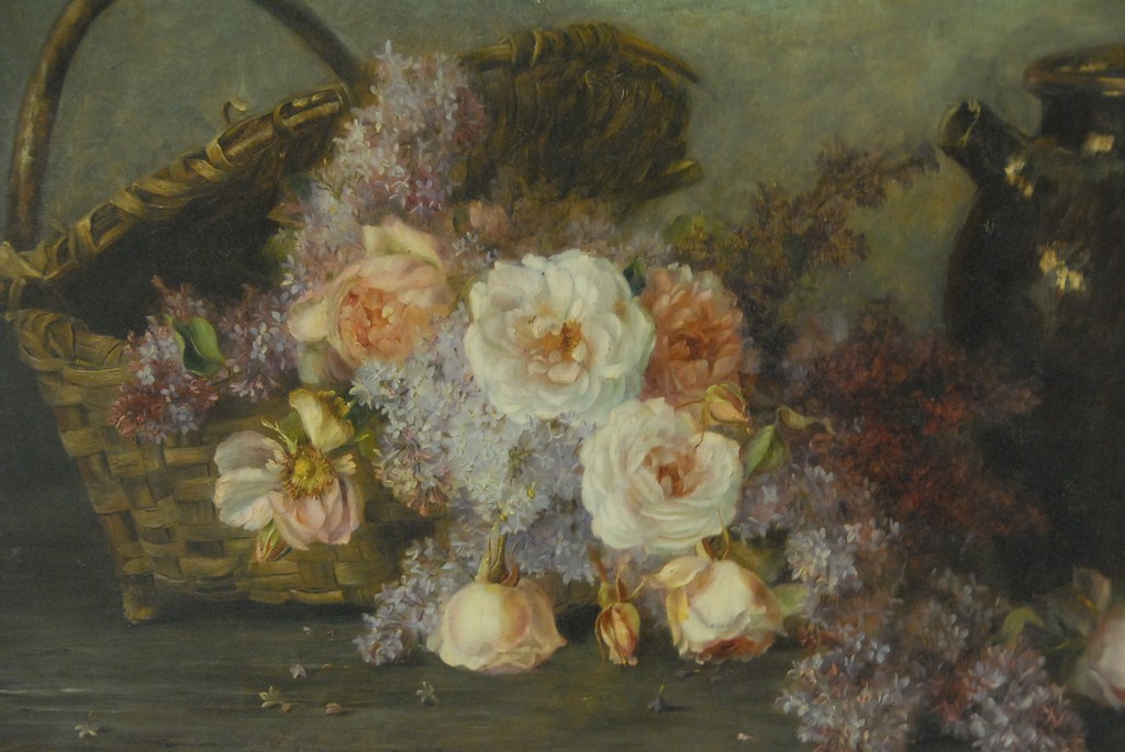 Marie Keller – Hermann 1868-1952 BROKEN BASKET OF FLOWERS NEXT TO A JUG oil on board signed top right M. Keller Hermann 23 x 32