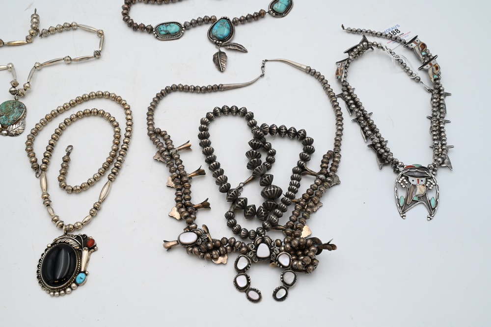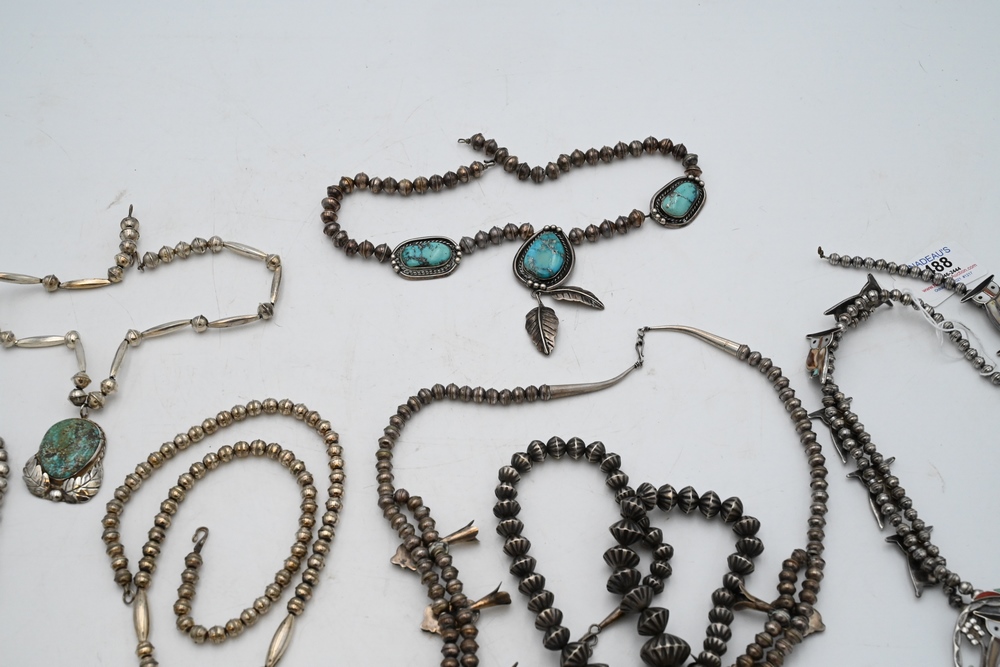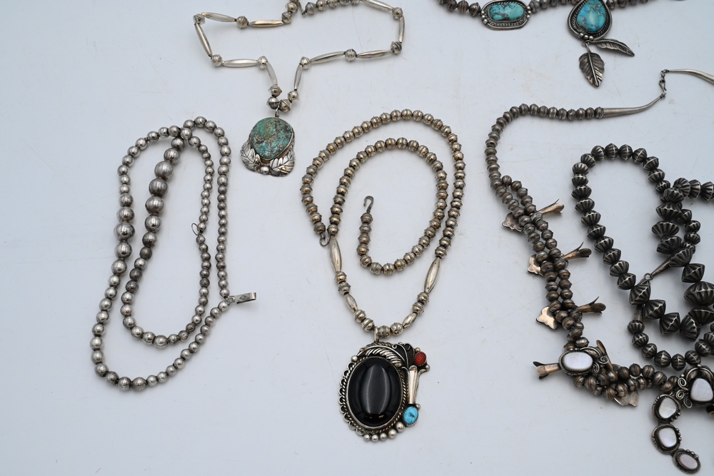 Lot 488: Seven Silver Bead Necklaces some mounted with stones Southwest, US or Mexico longest 24 inches