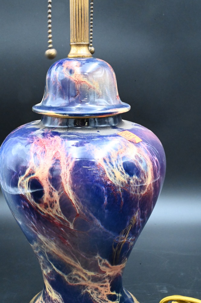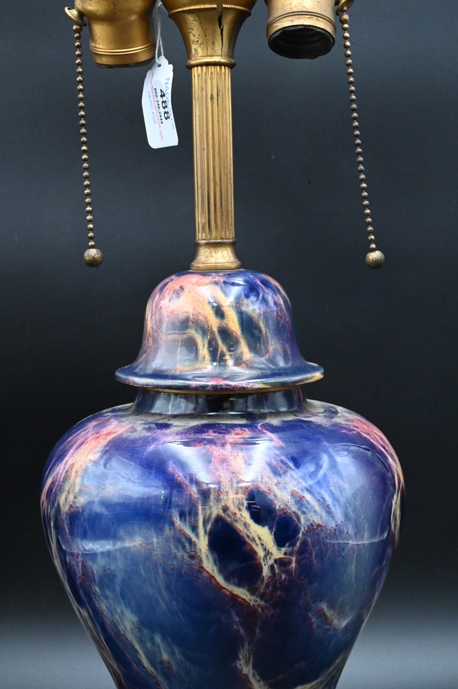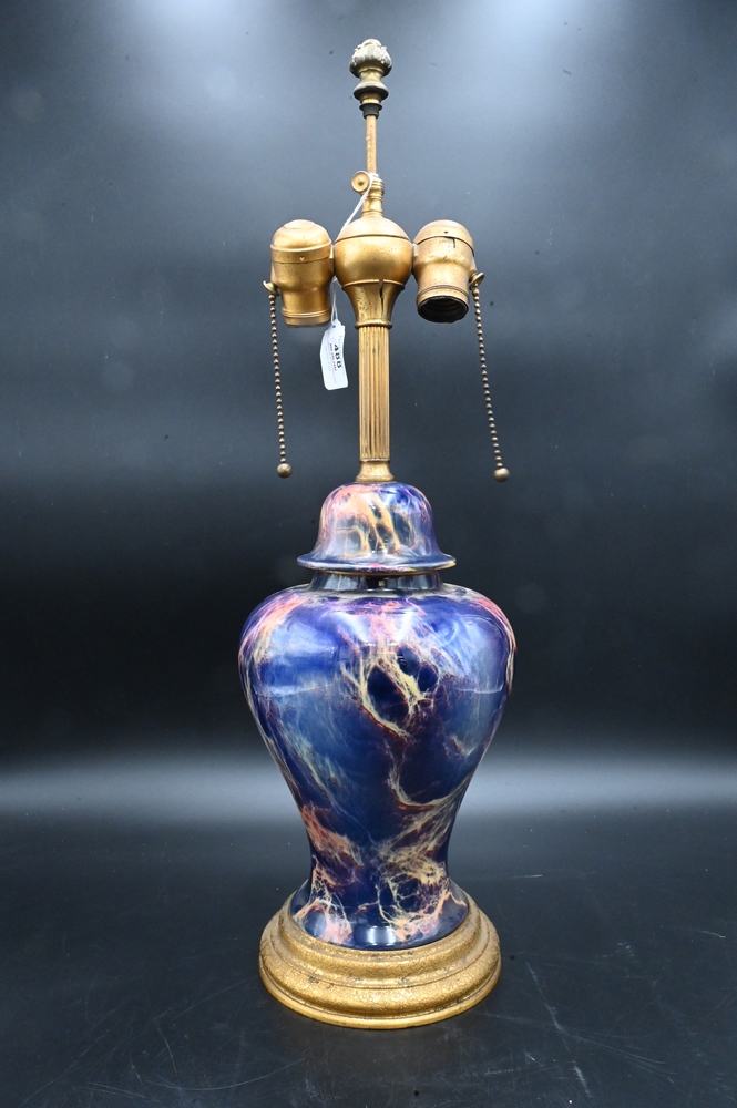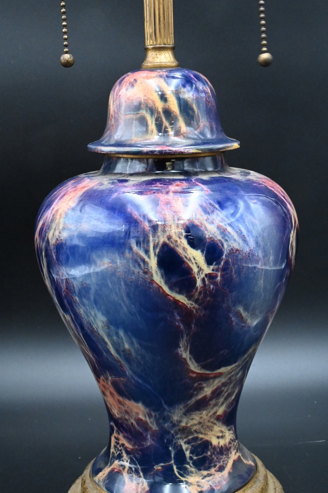 Tiffany Studios Pottery Lamp Base, having urn with cover form on gold bronze round base, marked “Mounted by Louis Tiffany Furnaces”, height 23 inches.
