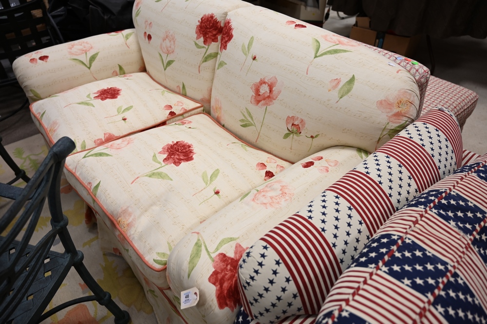 Lot 488: Two cushion sofa in floral upholstery, length of sofa 67 inches.
