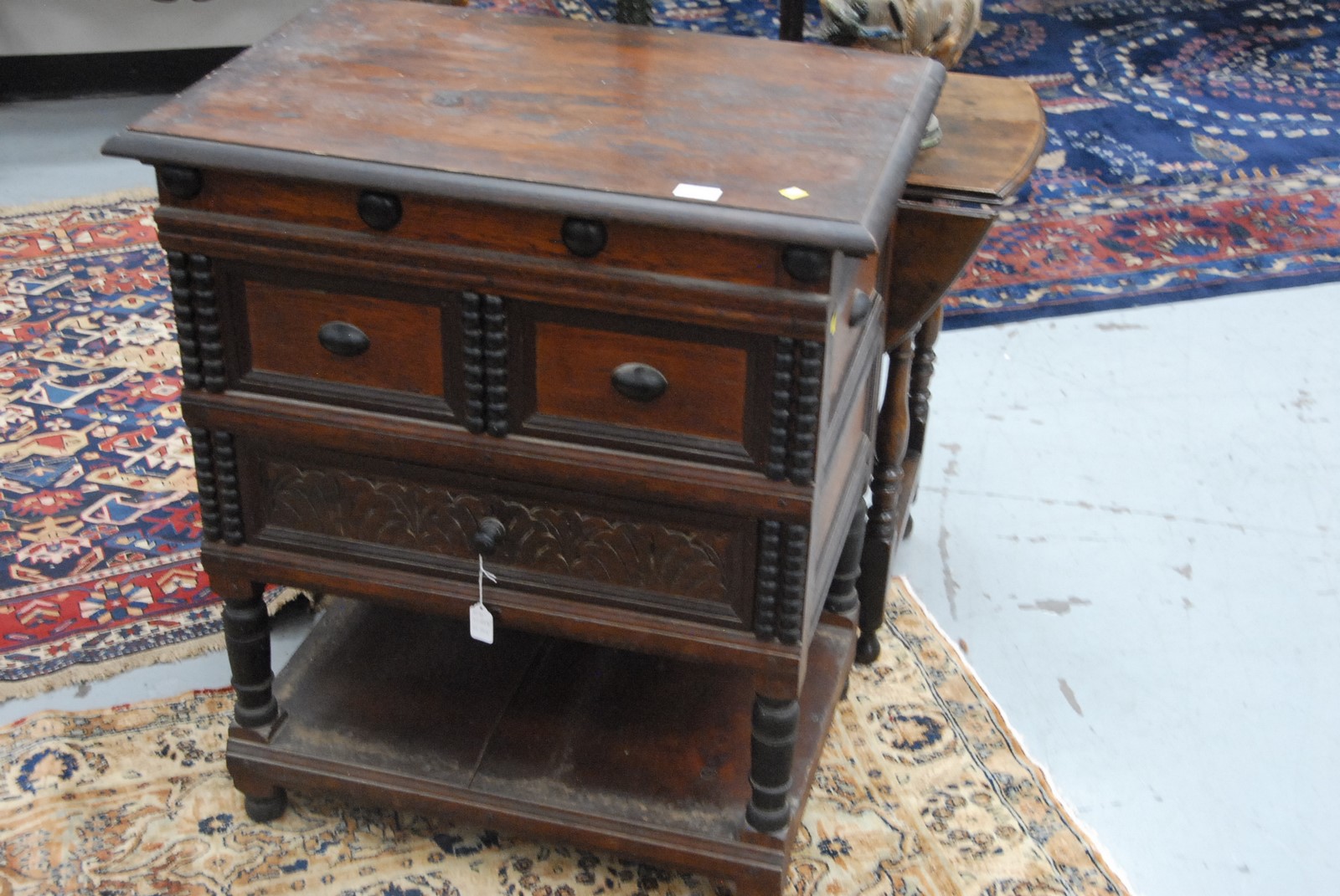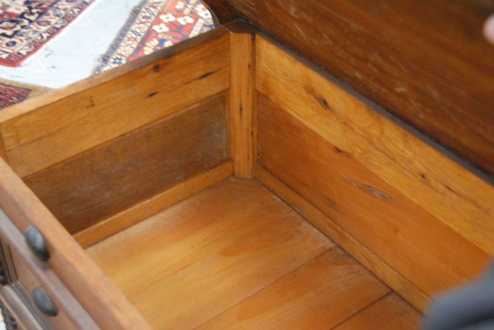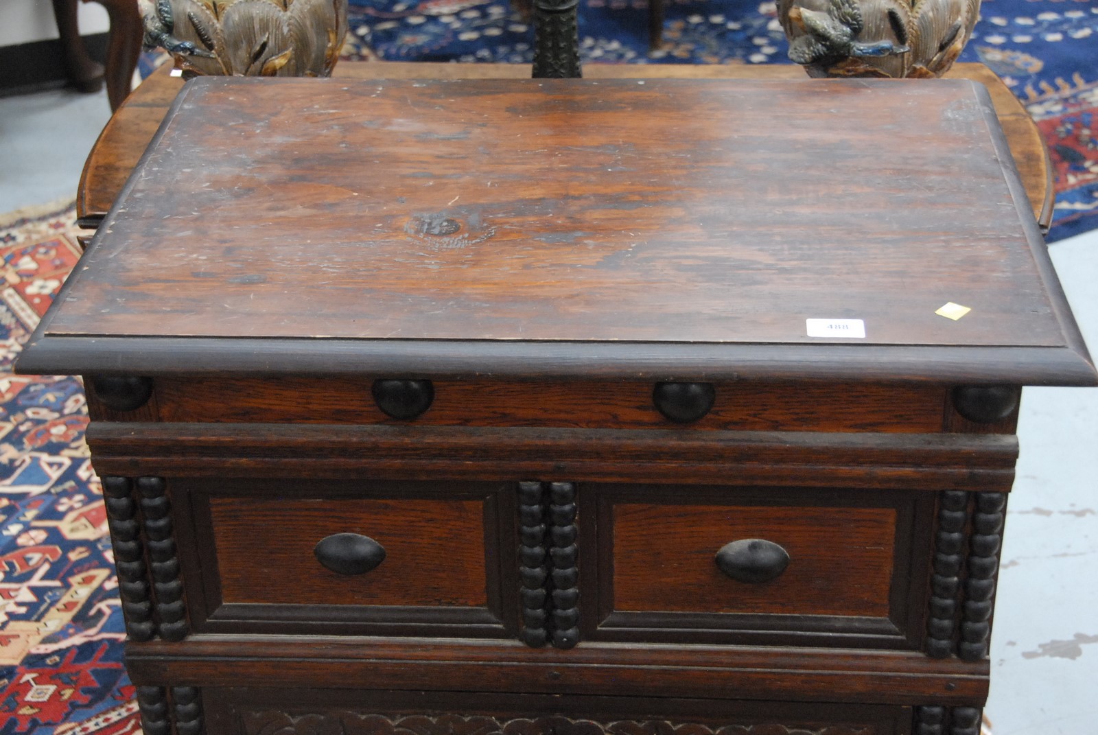 Lot 488: Wallace Nutting Pilgrim century style chest with lift top and one drawer over lower shelf on turned legs, signed on back in block letters. ht. 34 in. wd. 25 3/4 in. Provenance: Property from The Estate of Margaret Oliphant of Old Lyme, Conne