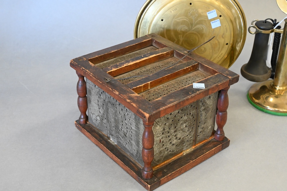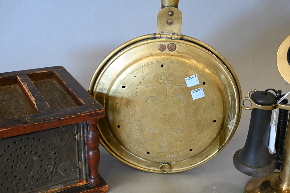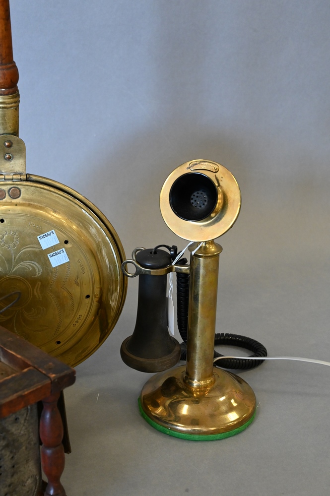 Lot 488A: Three Piece Group, to include antique brass stick phone having modern wire, bed warmer, and foot warmer.