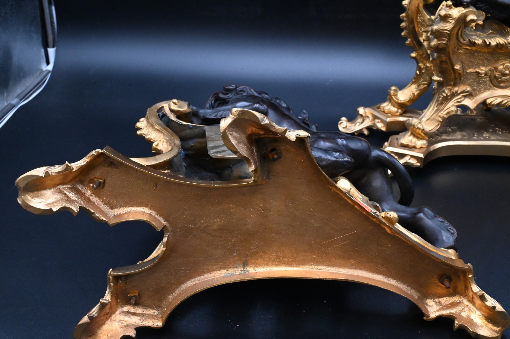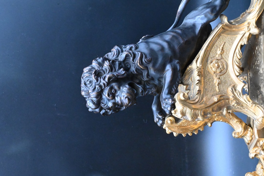 each in the form of a rearing lion on a scrolled rocaille and foliate support raised on shaped plinth and scrolled cabochon-molded feet, stamped R.C. 29, regilt with patinated bronze lion