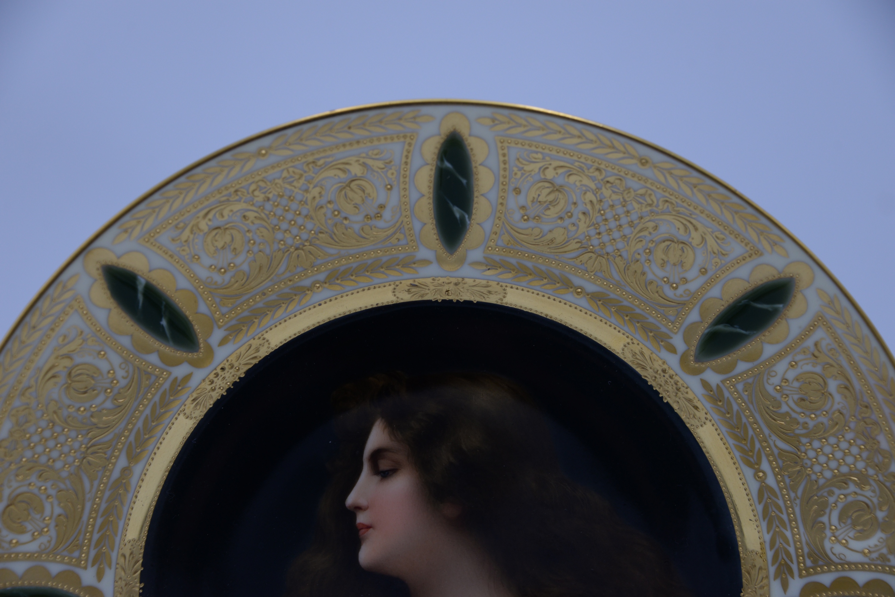Dresden Wagner Porcelain Portrait Plate, depicting a young woman, having high relief gold border with eight enameled marquis design and signed “Wagner” lower left, stamped German Dresden on reverses, along with title “Erbluhen” (bloom), diameter 10 inches.