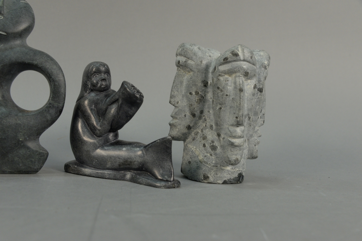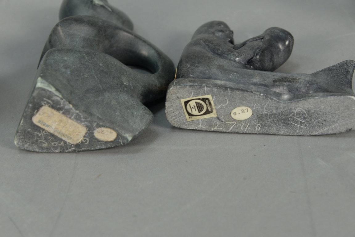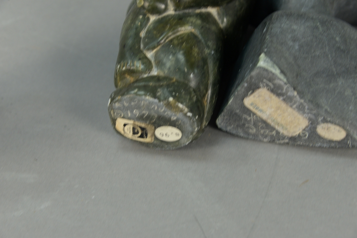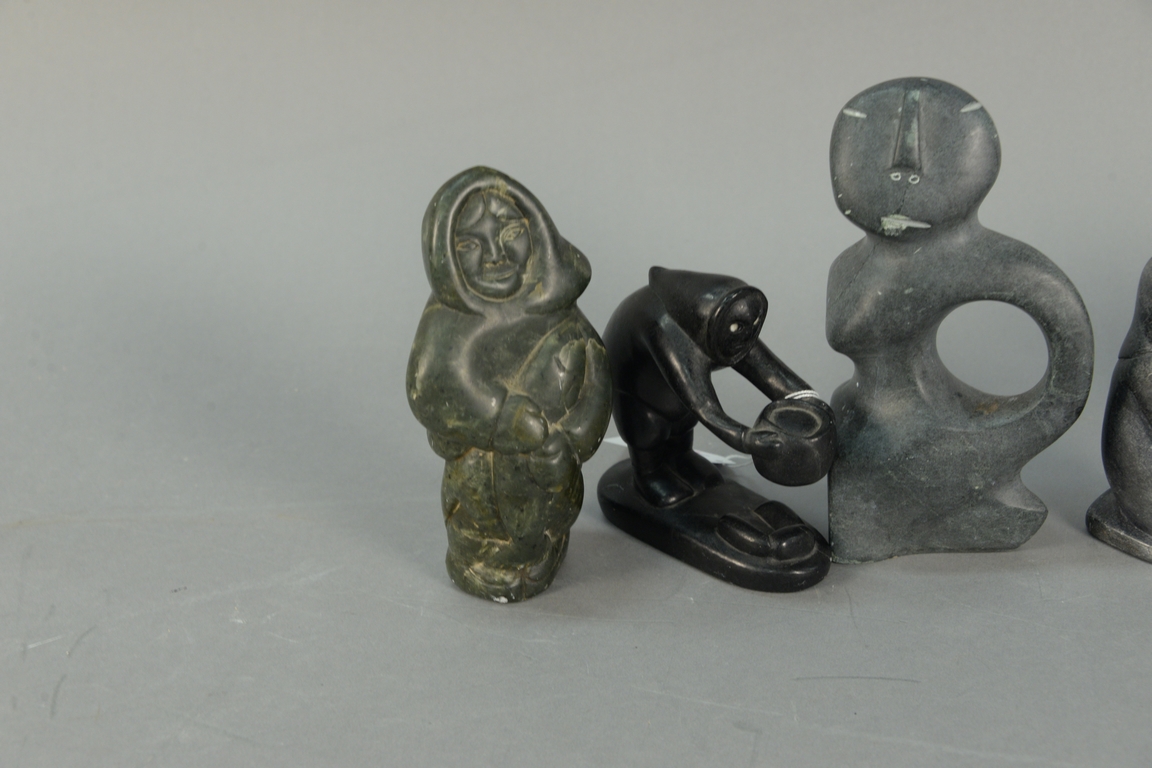 Lot 489: Five Inuit Eskimo carvings including George Arluk 1949 Rankin Inlet/Arviat/Eskimo Point basalt Woman abstract, soapstone Woman w…