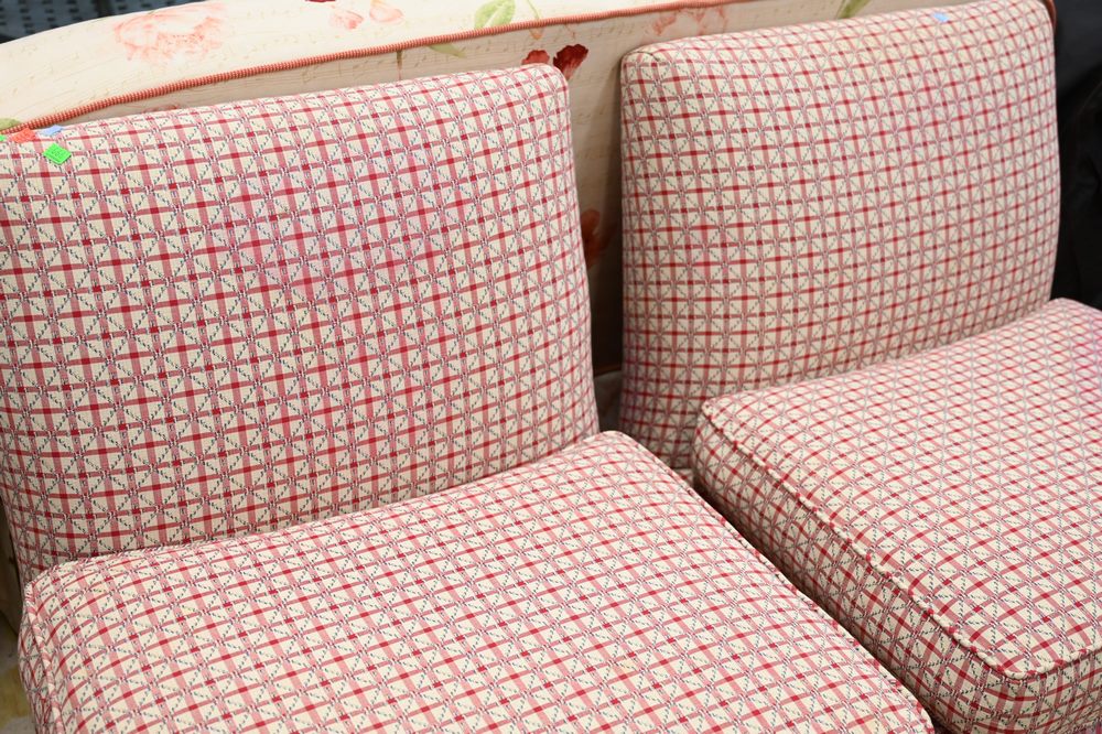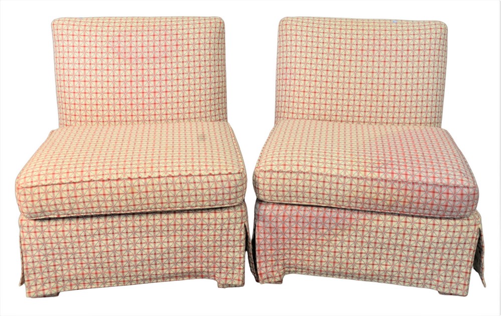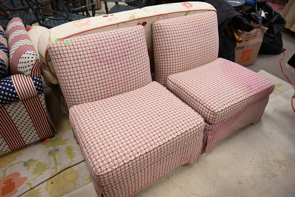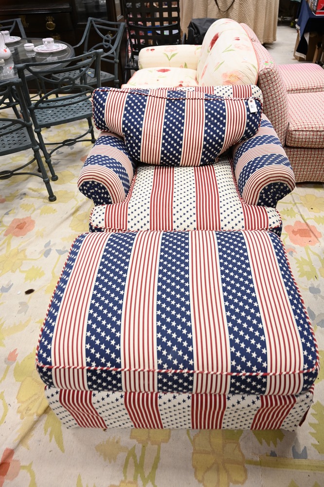 Lot 489: Four Piece Lot, to include custom upholstered easy chair, in Patriotic upholstery and matching ottoman, along with two armless chairs, height 27 inches.