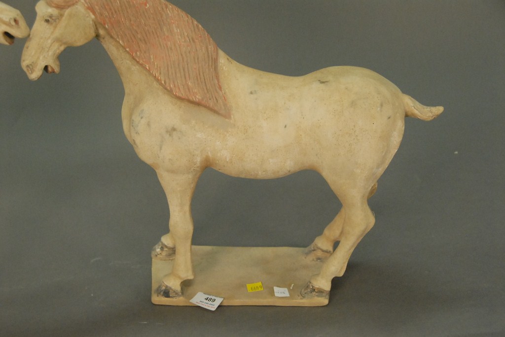 Lot 489: Pair of Tang Dynasty type horses on rectangular bases repairs. Provenance: From prominent Woodbridge, Connecticut family collec…..