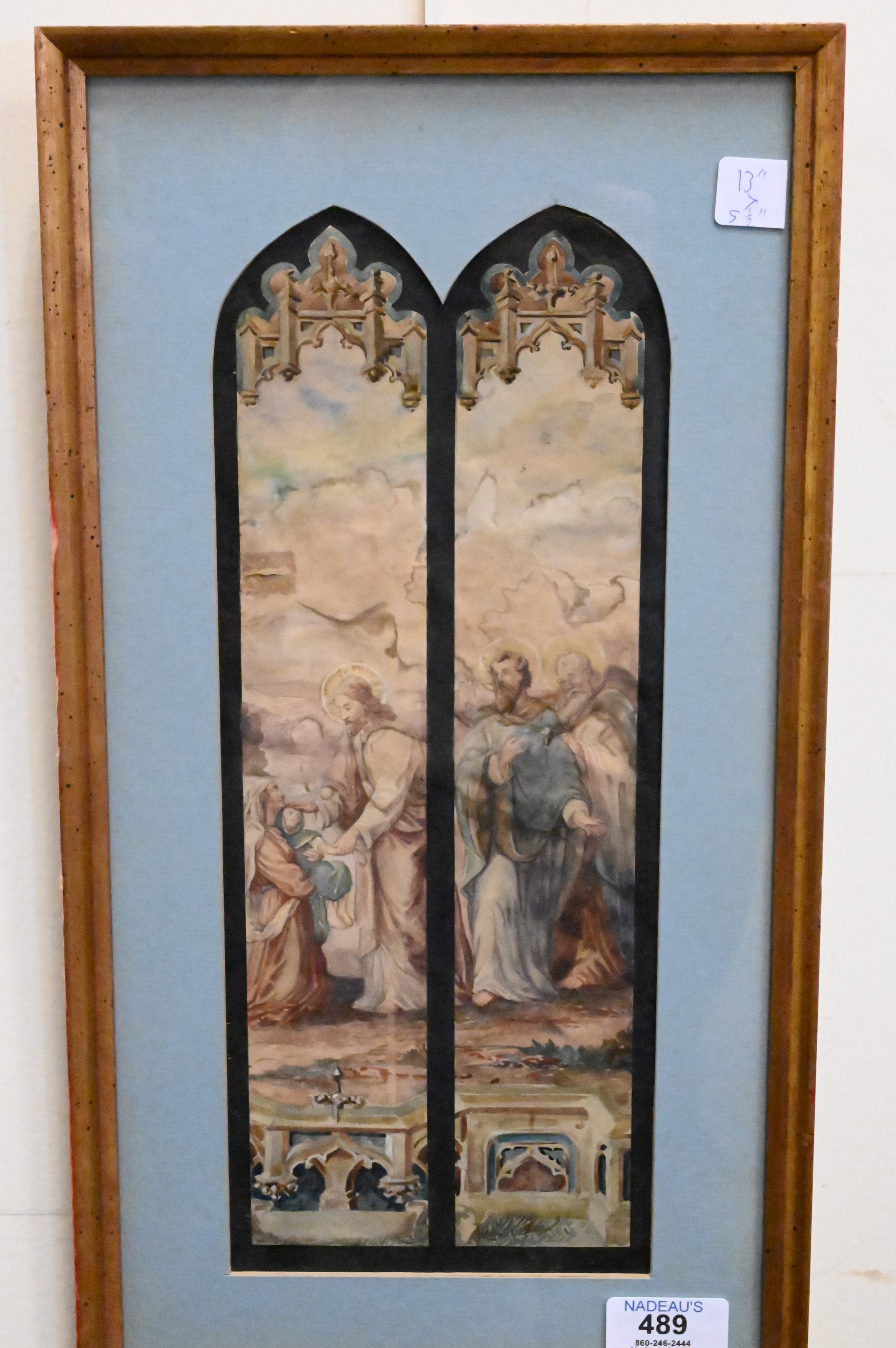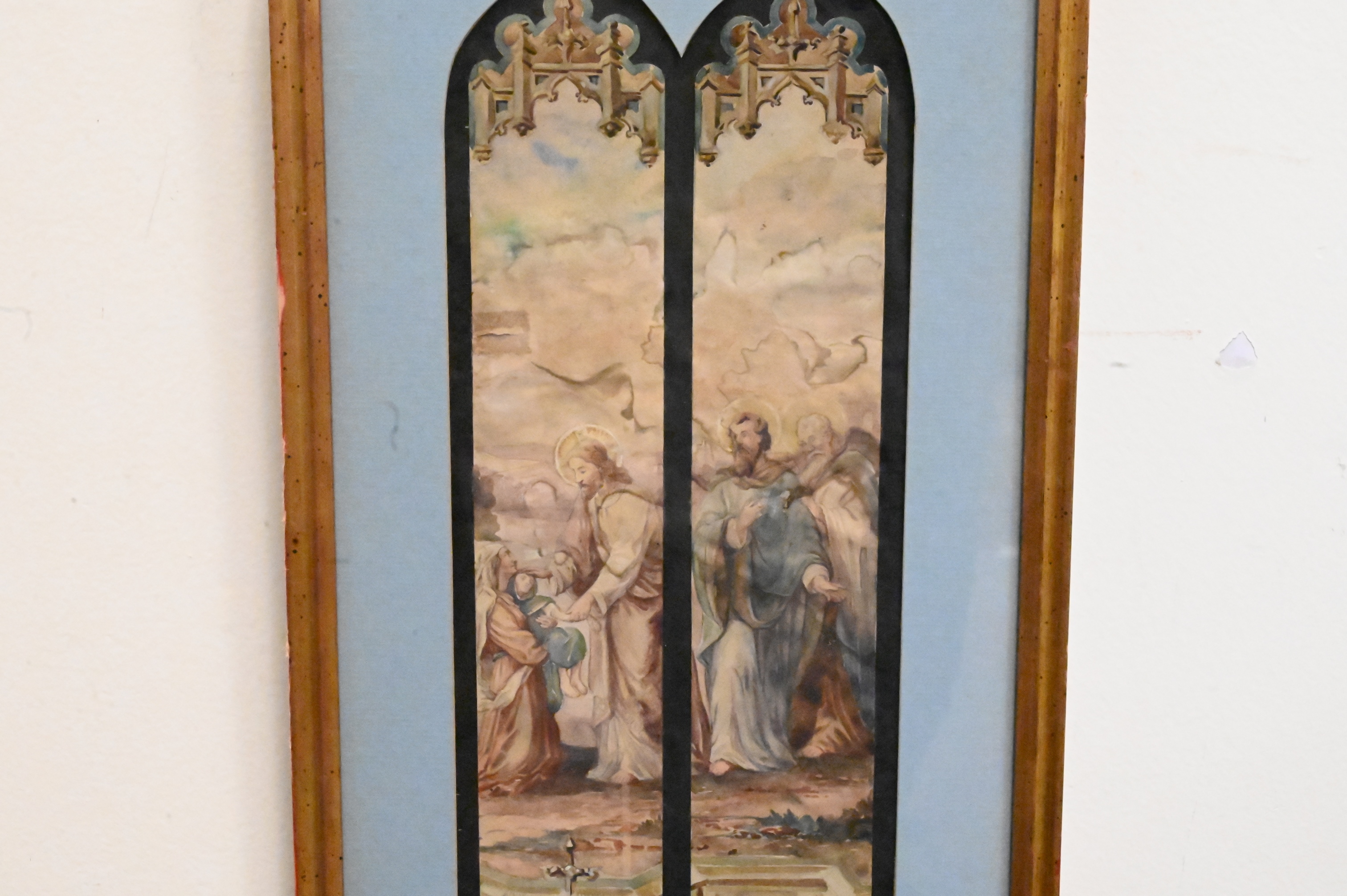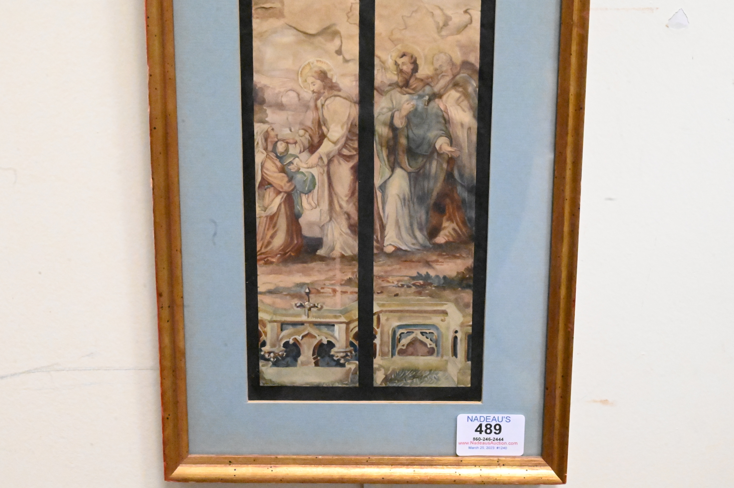 Religious Scene, artist unknown, figures, arched windows, top possibly in the form of stained glass windows, watercolor on paper, 18th century or later, unsigned, (as is), 13″ x 5″.
