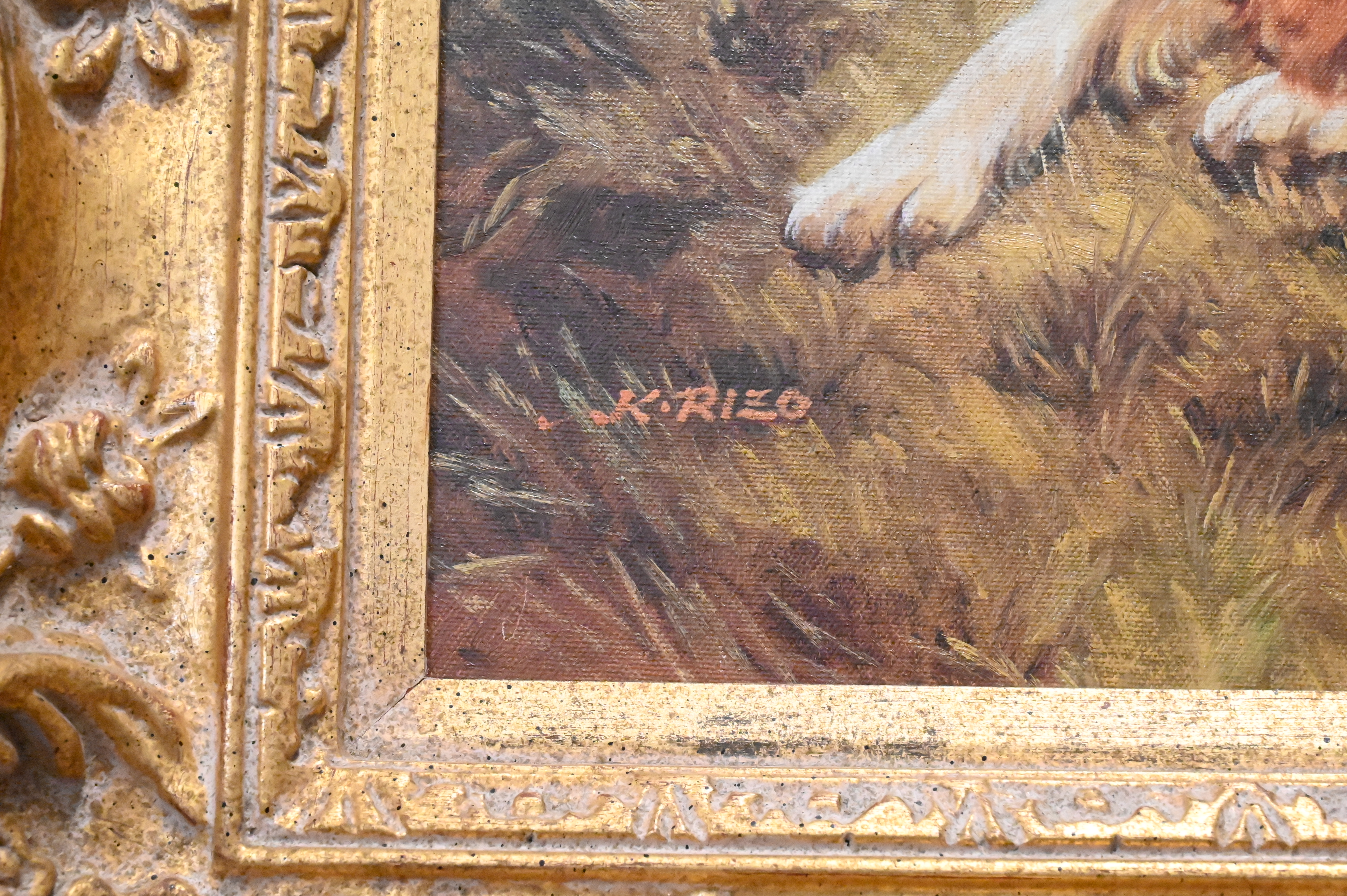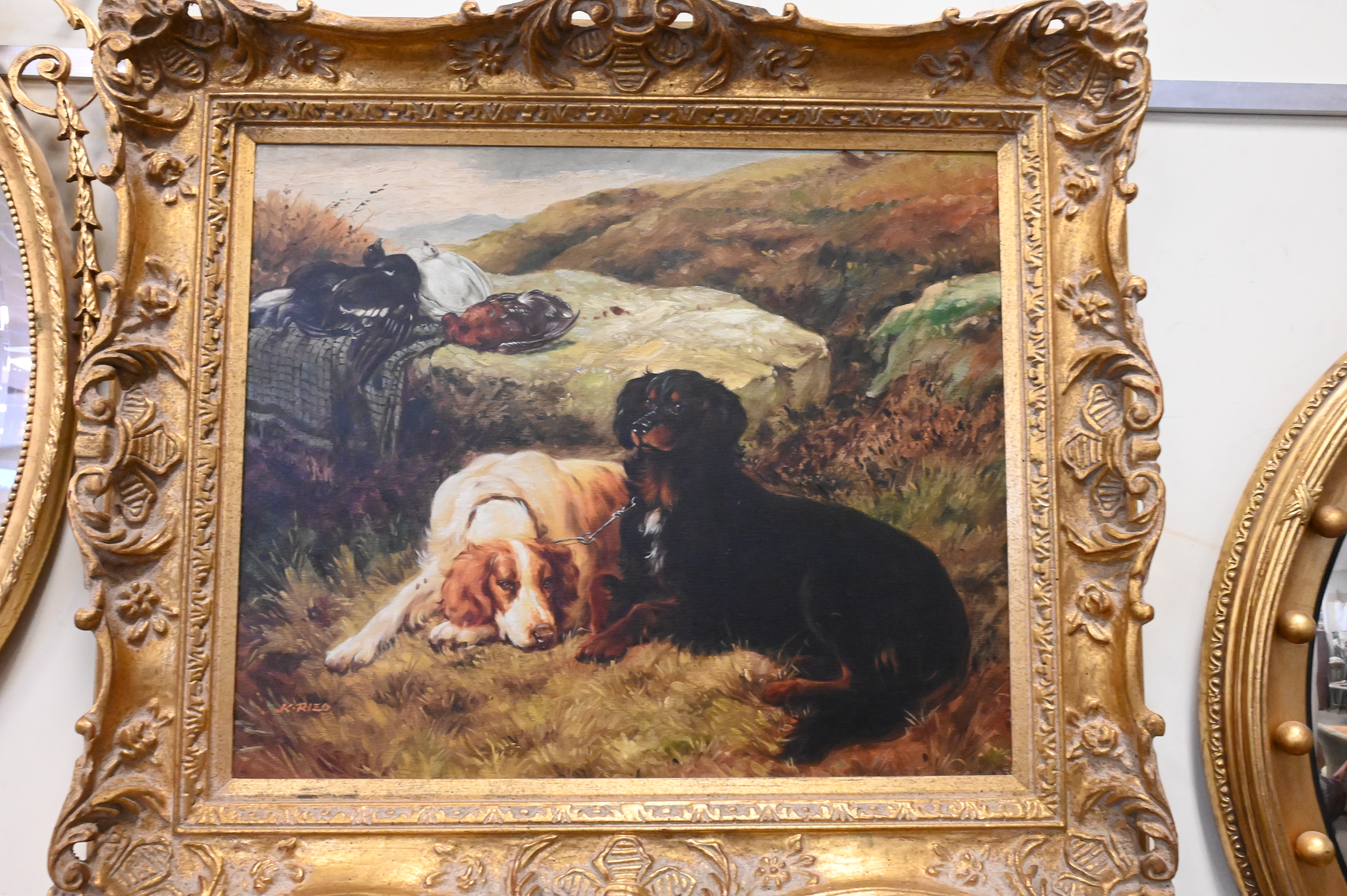 two hunting dogs with birds, signed lower left “K. Rizo”