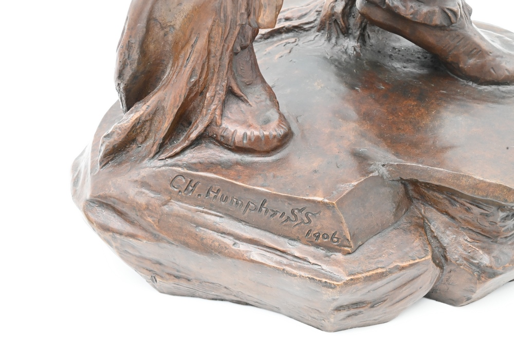 CH Humphriss Bronze Sculpture of an American Indian, having outstretched arms, Appeal to the Great Spirit, having Gorham Company Foundery Mark on base, signed CH Humphriss, 1906, height 31 inches.