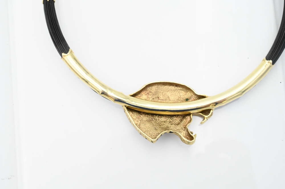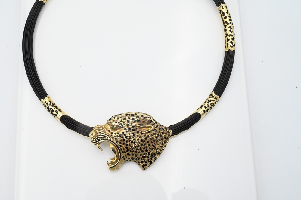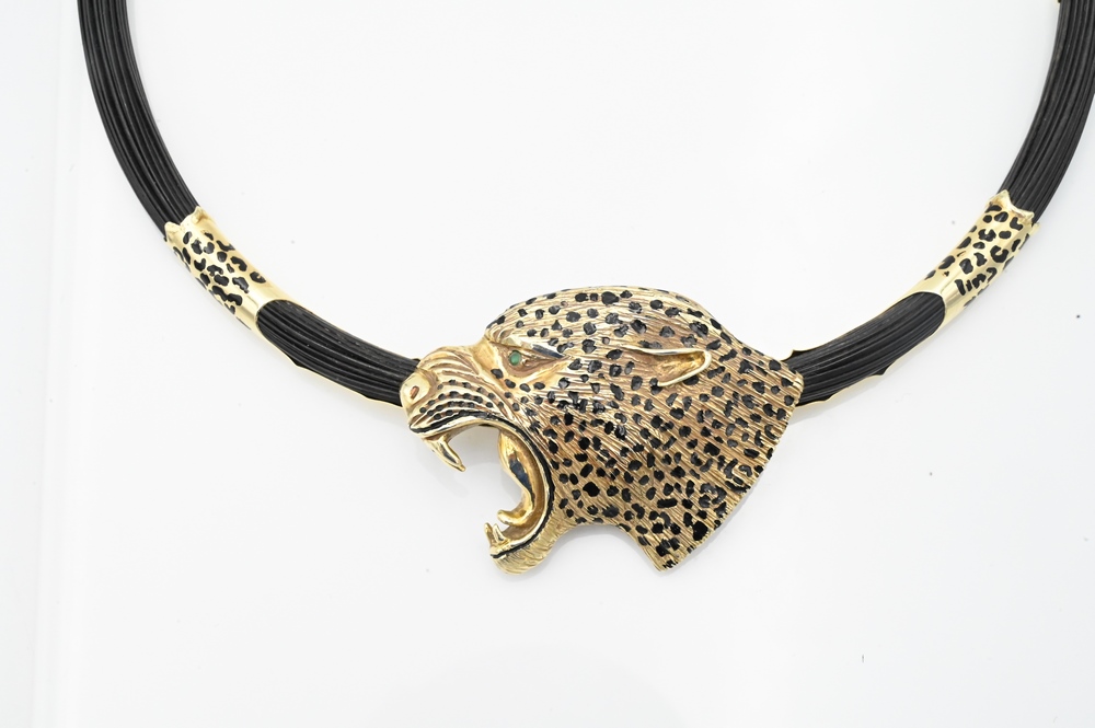 Lot 49: 14 Karat Yellow Gold Leopard Head, having green eyes, on choker of brown strands, mounted with 14 karat yellow gold, length 15 inches.