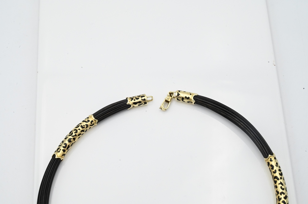 14 Karat Yellow Gold Leopard Head, having green eyes, on choker of brown strands, mounted with 14 karat yellow gold, length 15 inches.