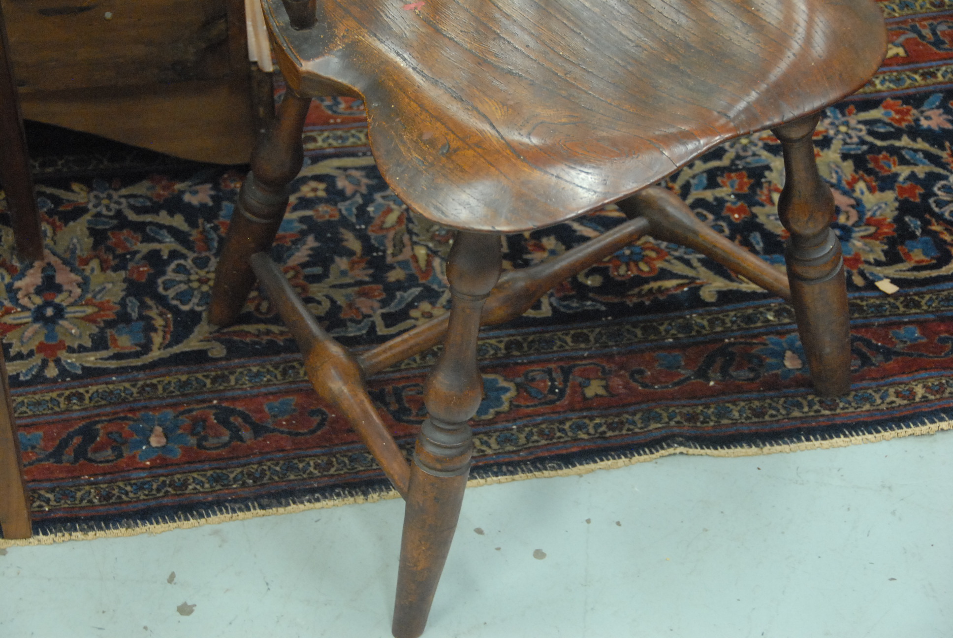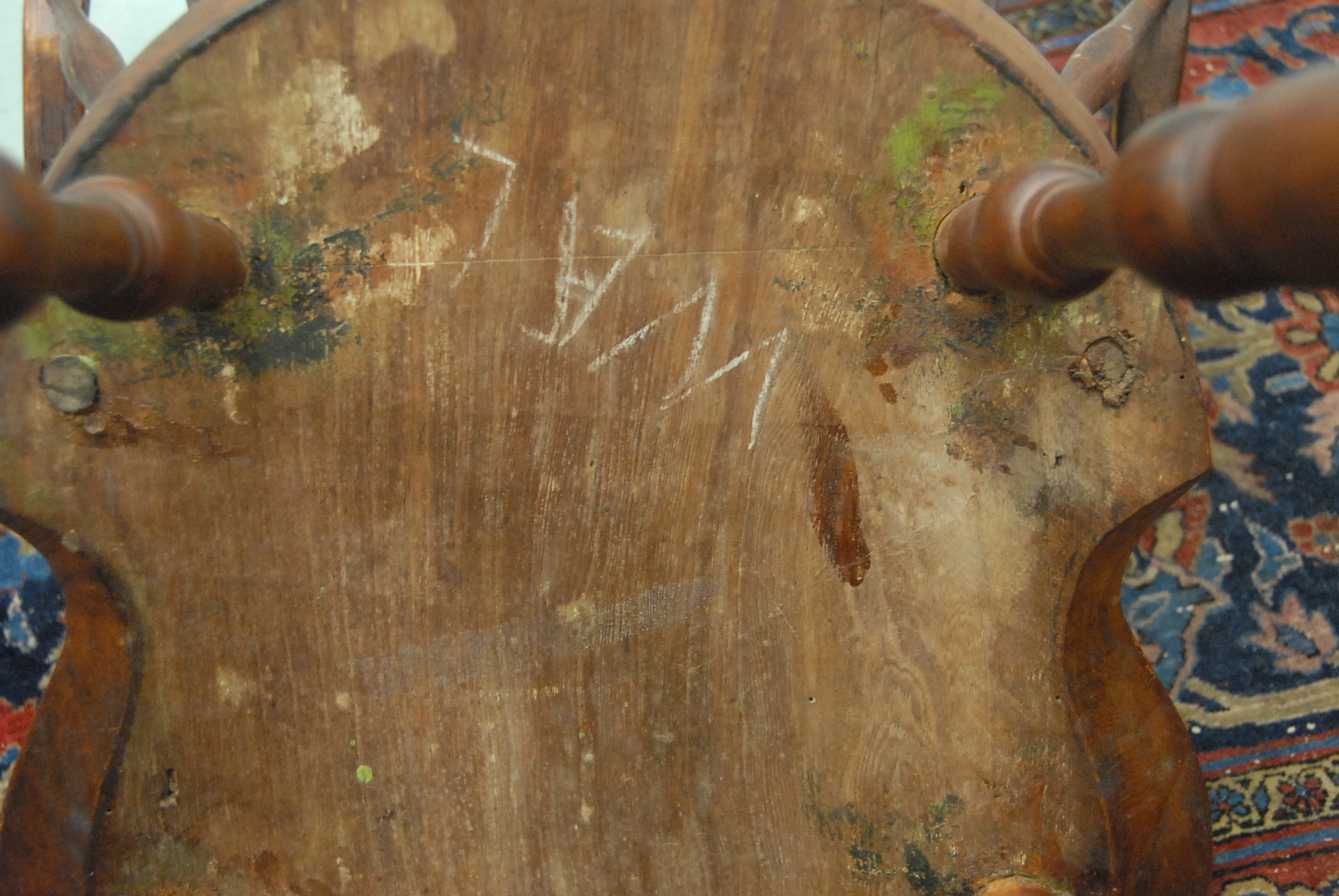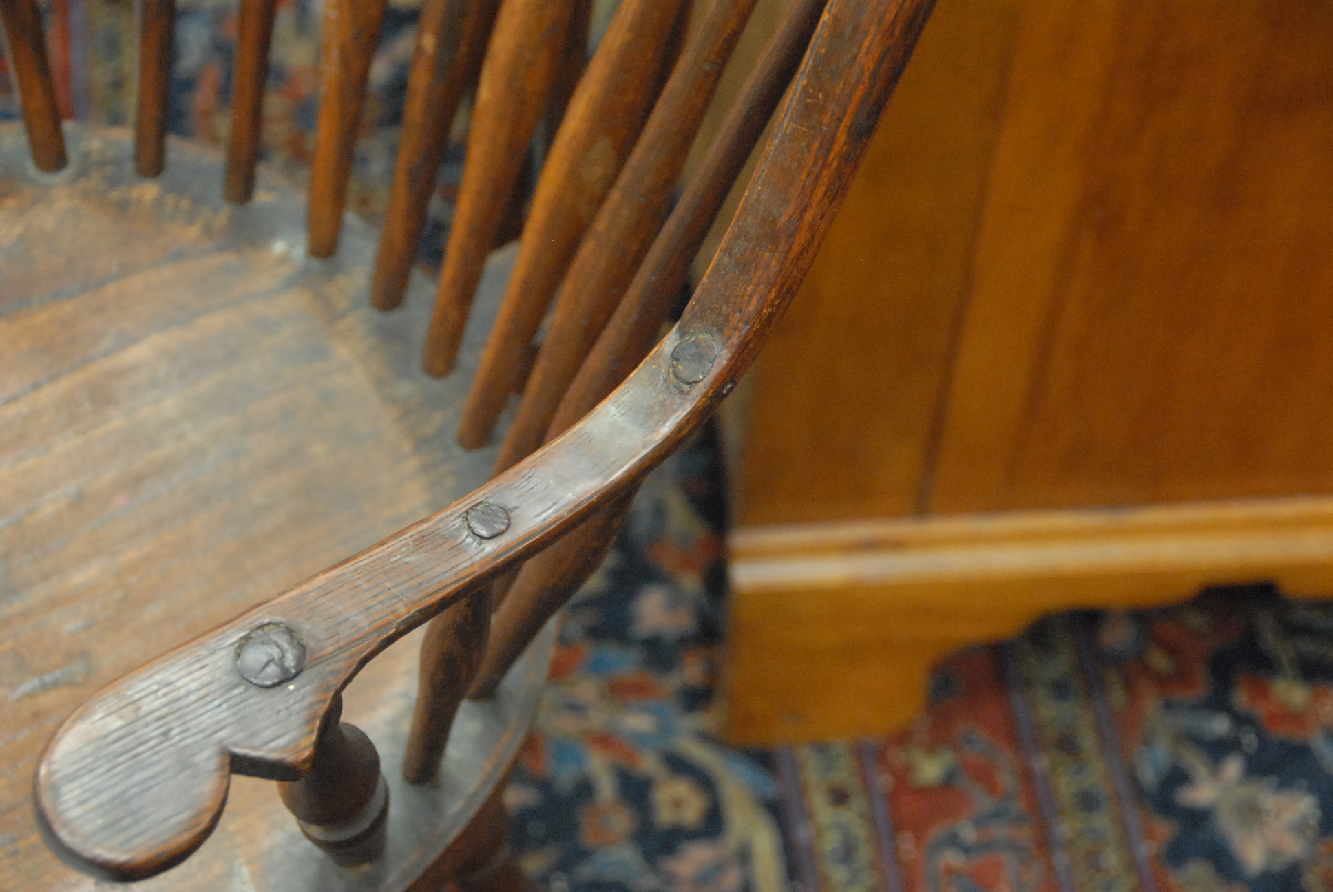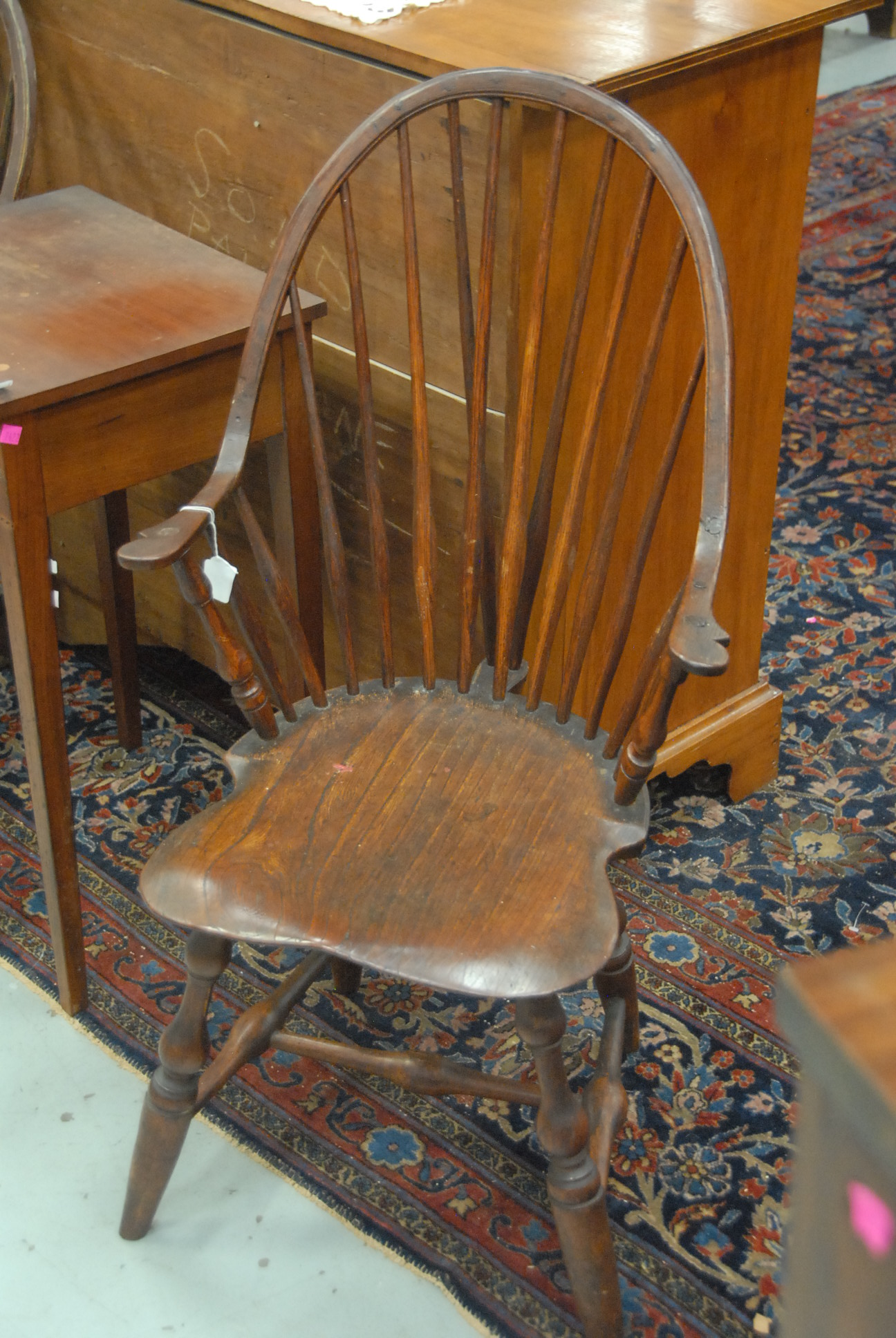 Lot 49: Continuous arm Windsor chair with brace back having bold turned arm supports, legs, and stretchers. seat ht. 17 in. total ht. 38 1/2 in. Provenance: Property from the Estate of Elizabeth and Edward Wallace of The Tracy House in Meriden
