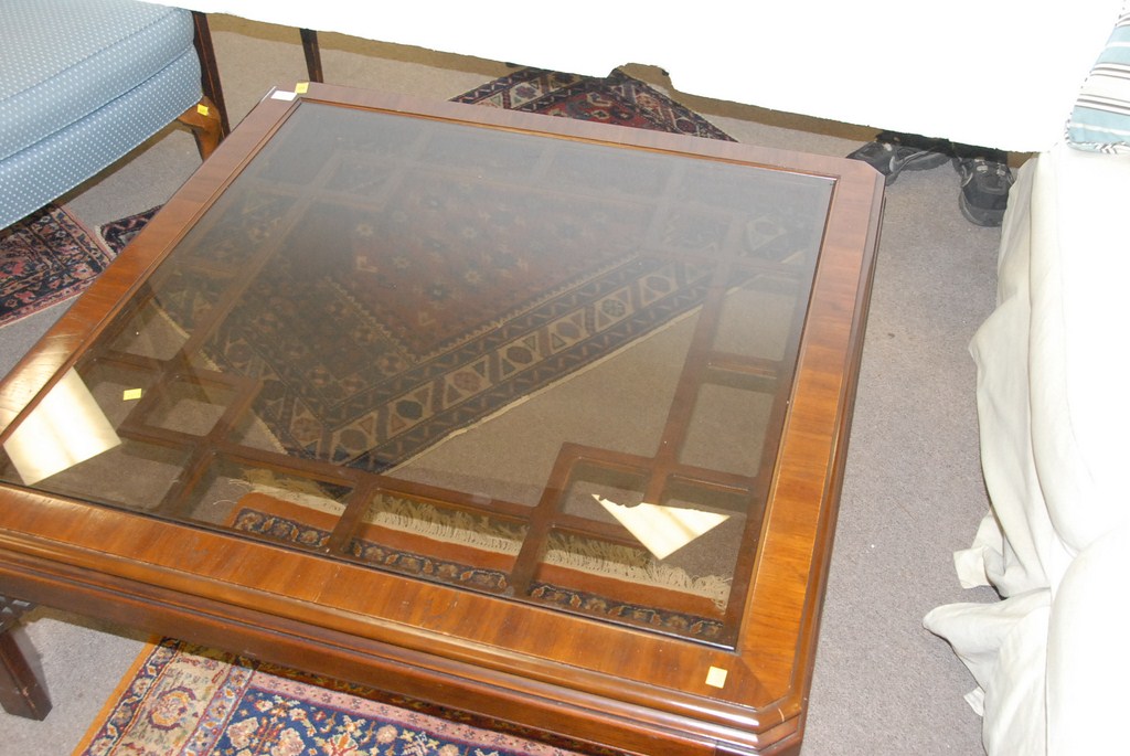 Drexel Heritage glass top mahogany coffee table.