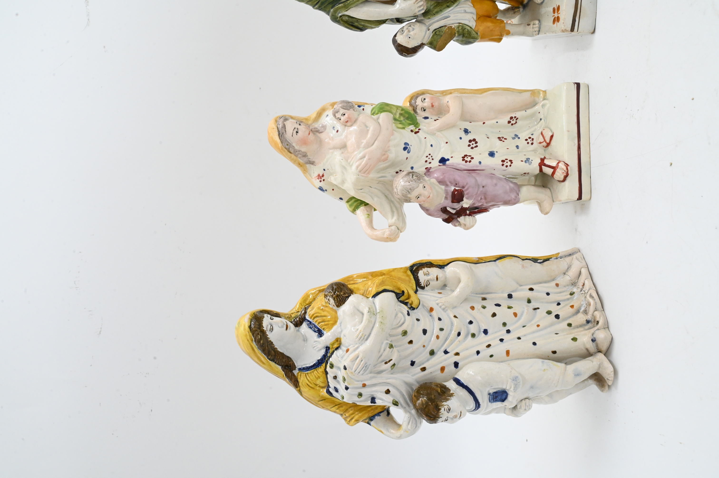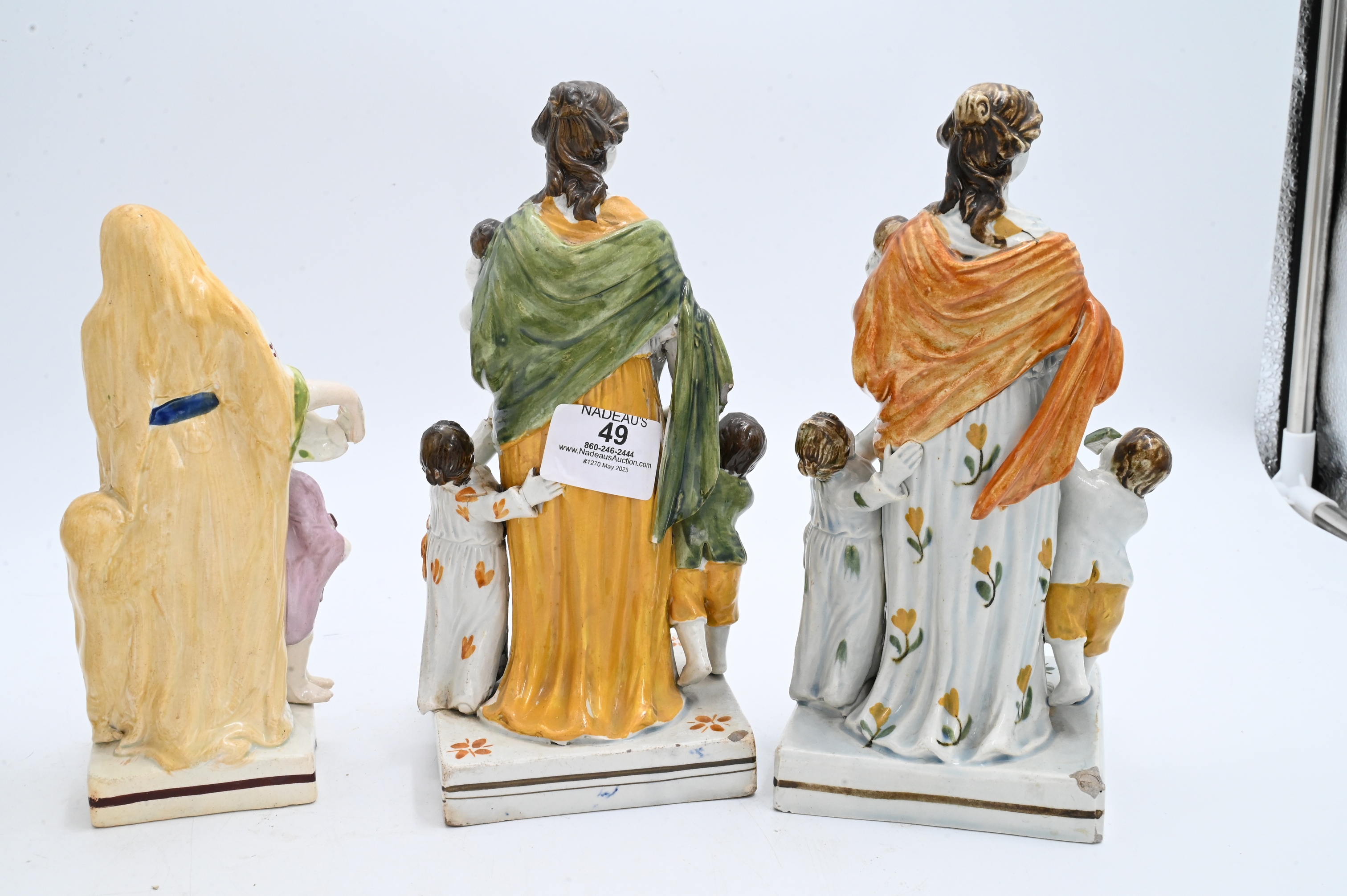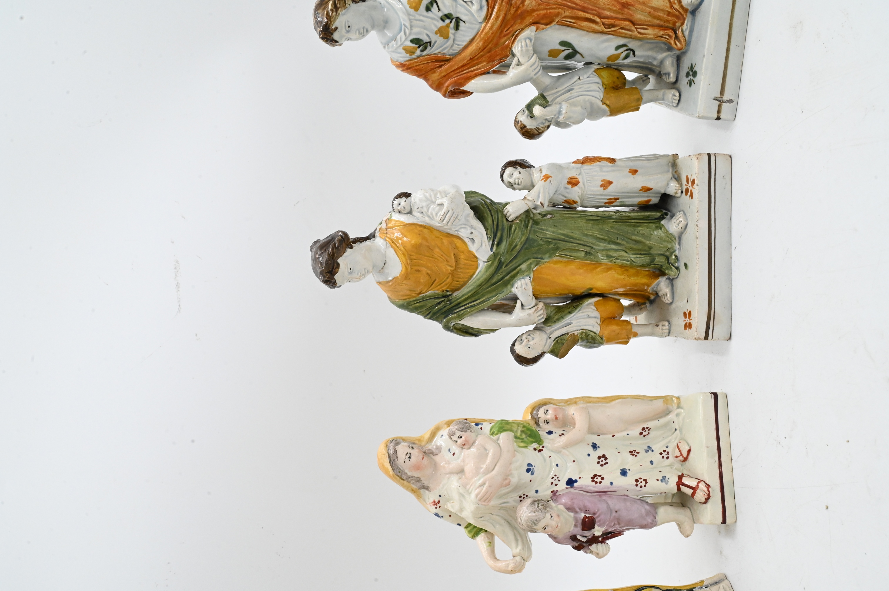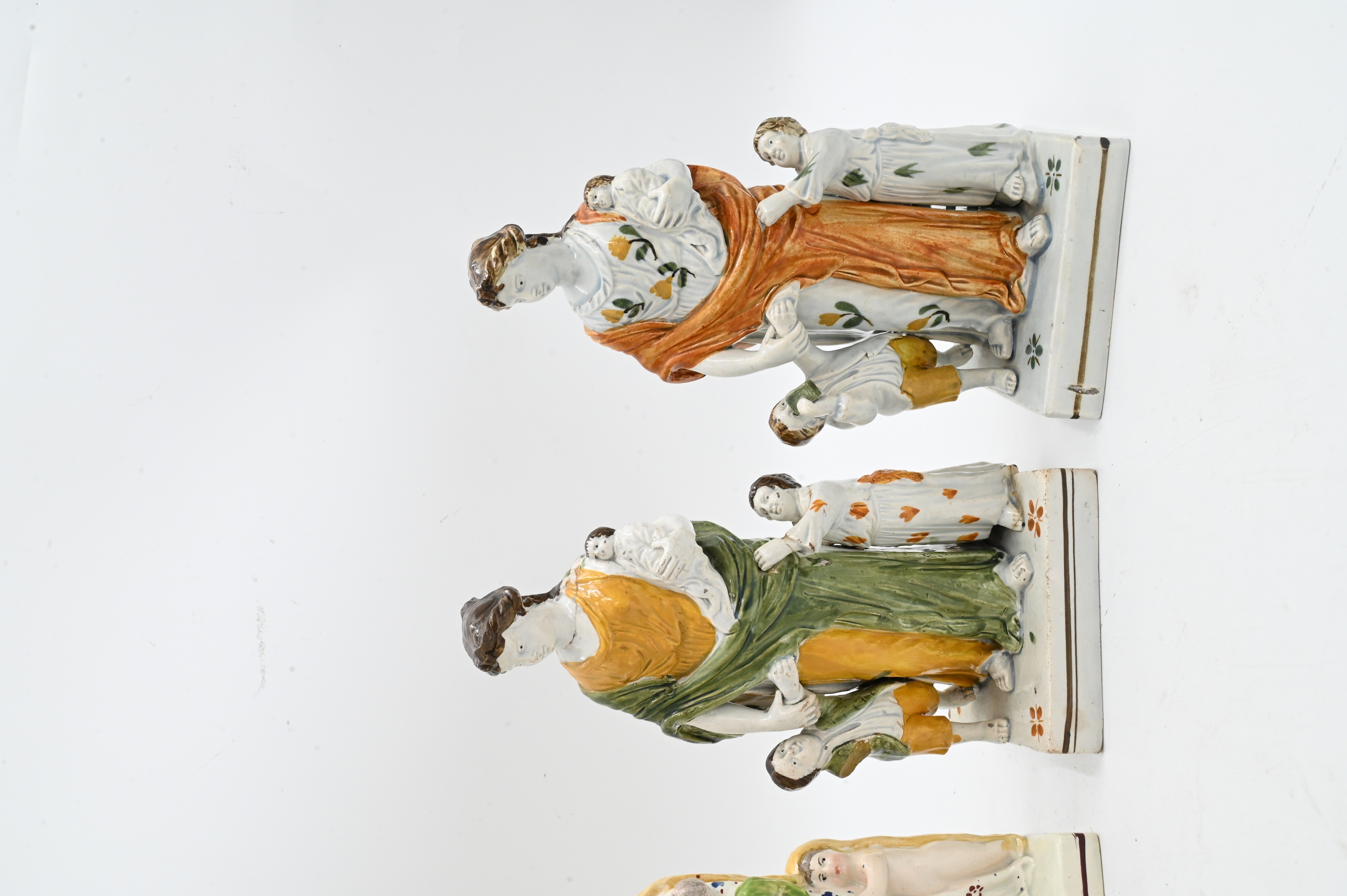 each depicting different models of “charity” to include version of a veiled woman holding a baby with two children on square base circa 1790, one larger version without base, two figures without veil dressed in togas and holding children both on square bases, early 18th century