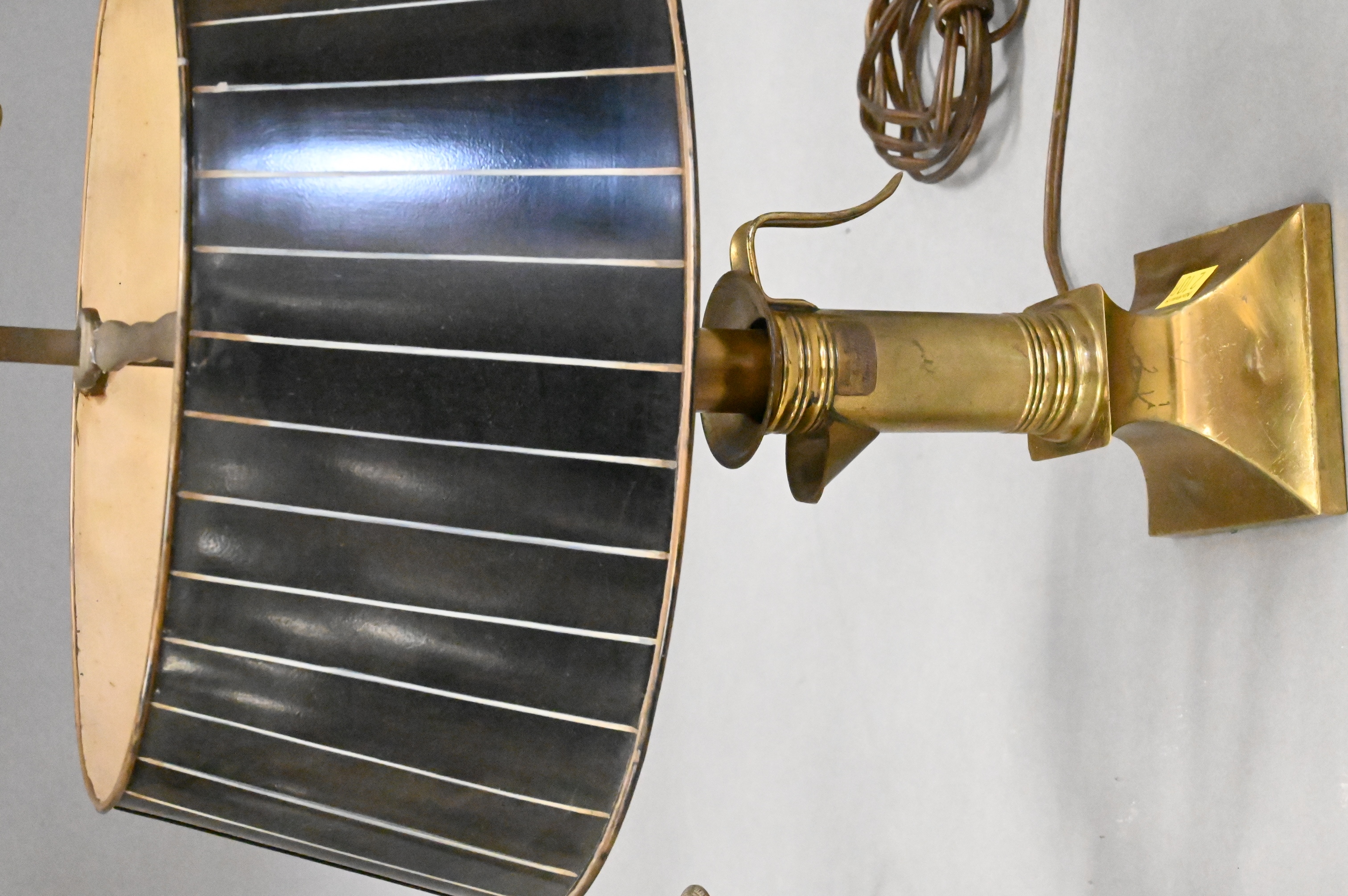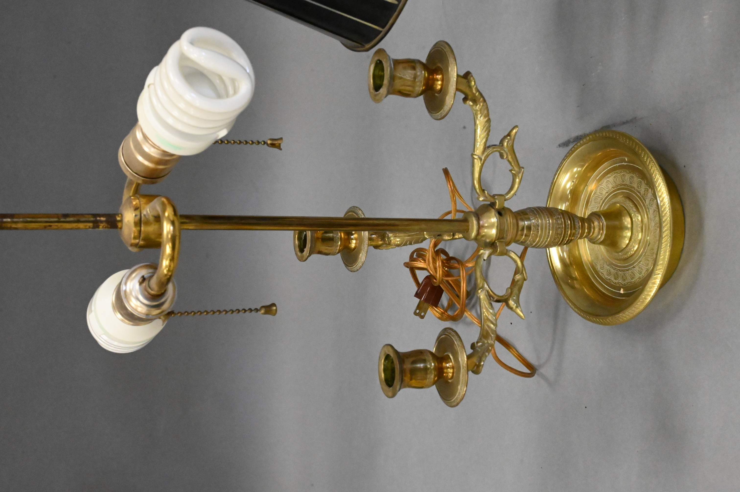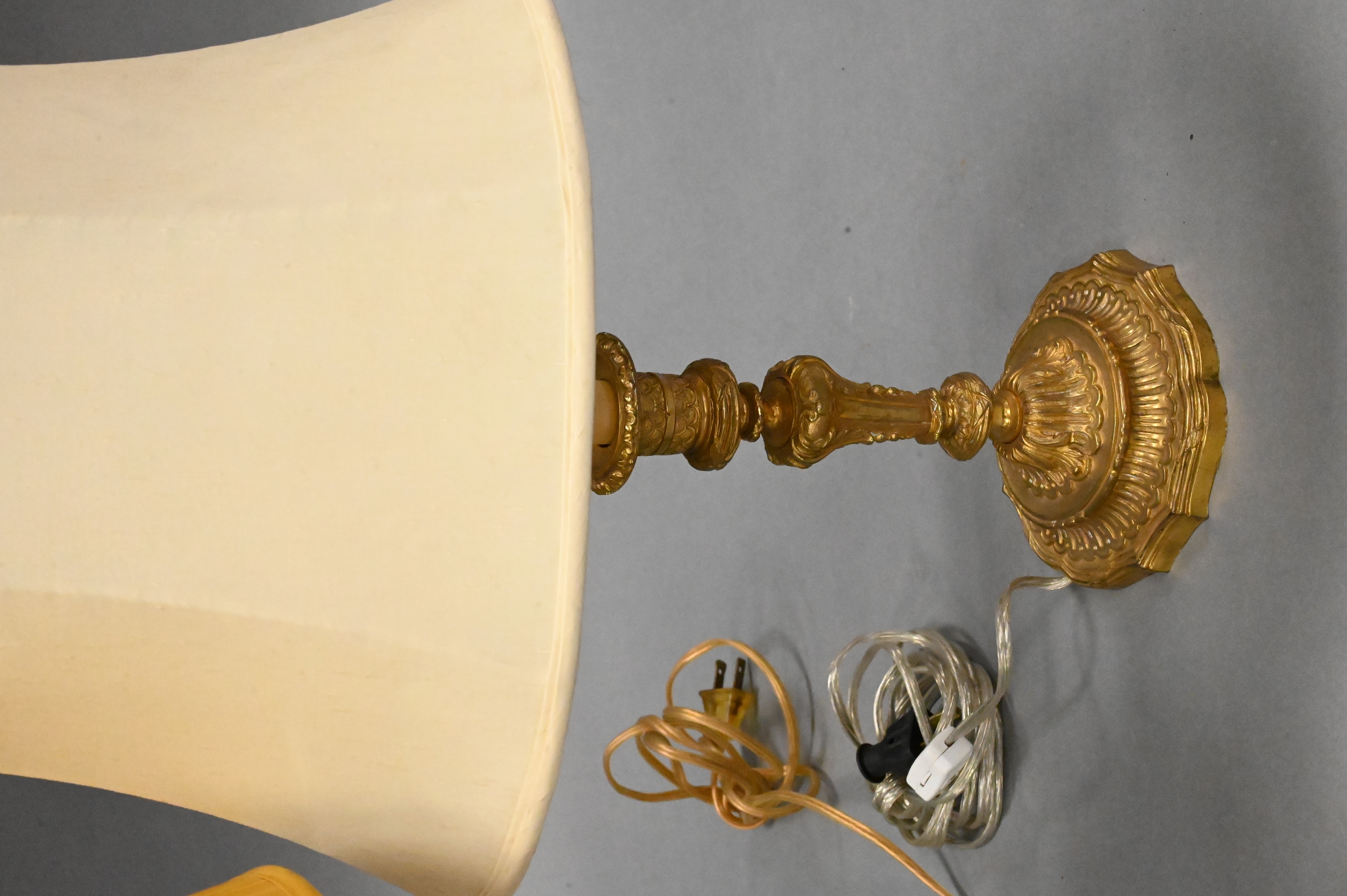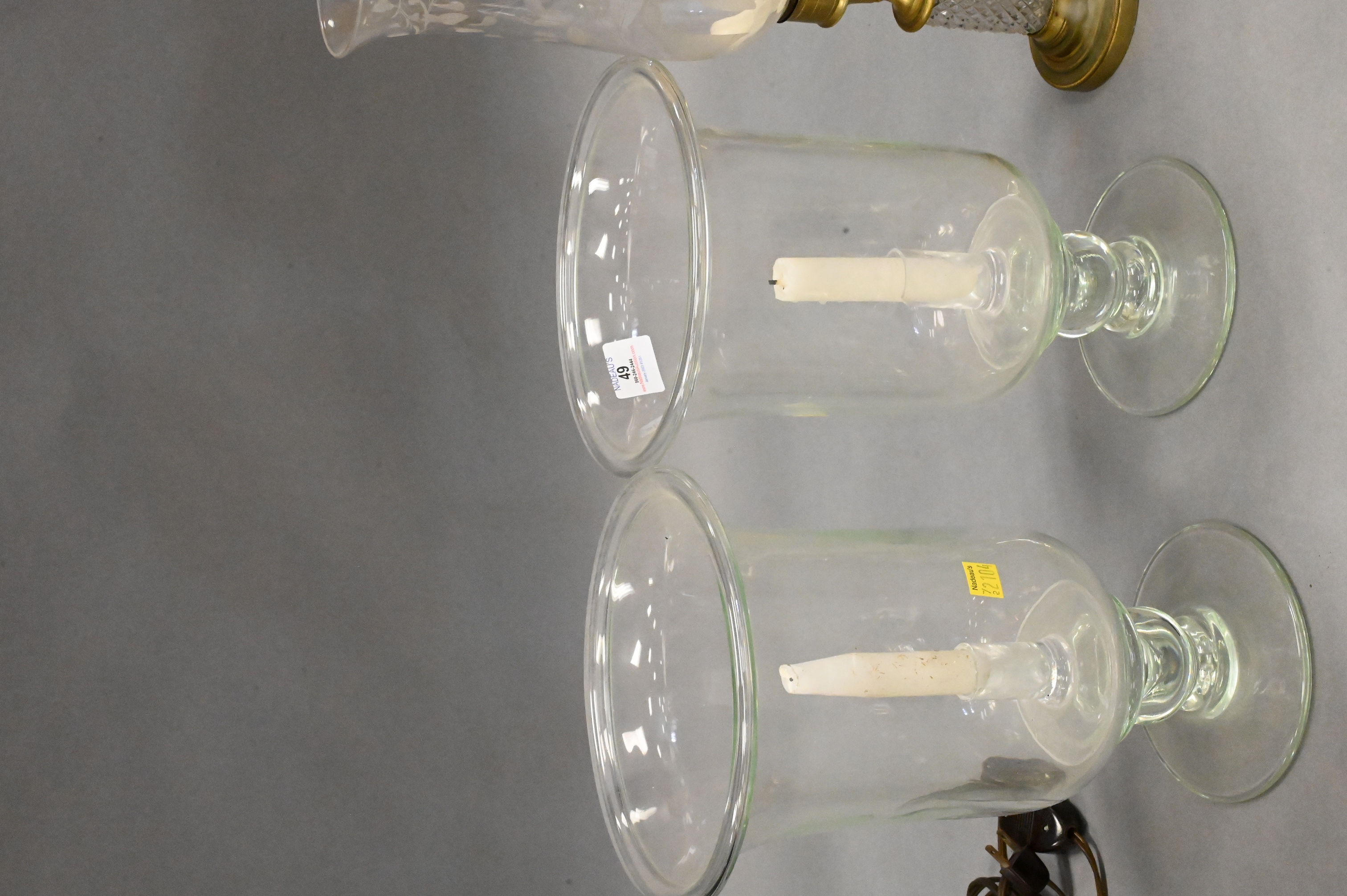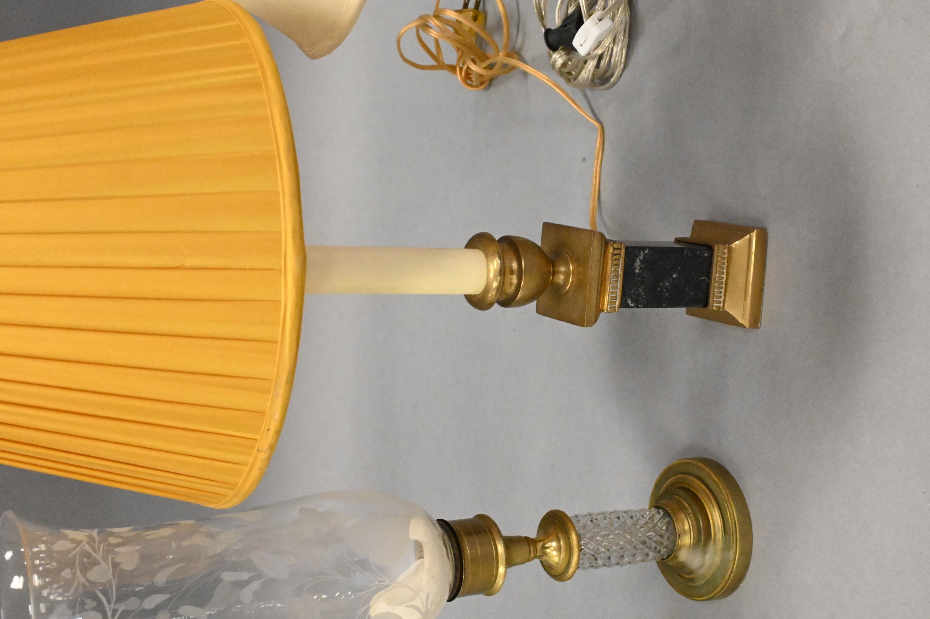 to include table lamp with arrow finial, marble pedestal lamp, converted brass candelabra, a pair of signed Simon Pearce hurricane glass candle holders, along with two additional brass and glass lamps