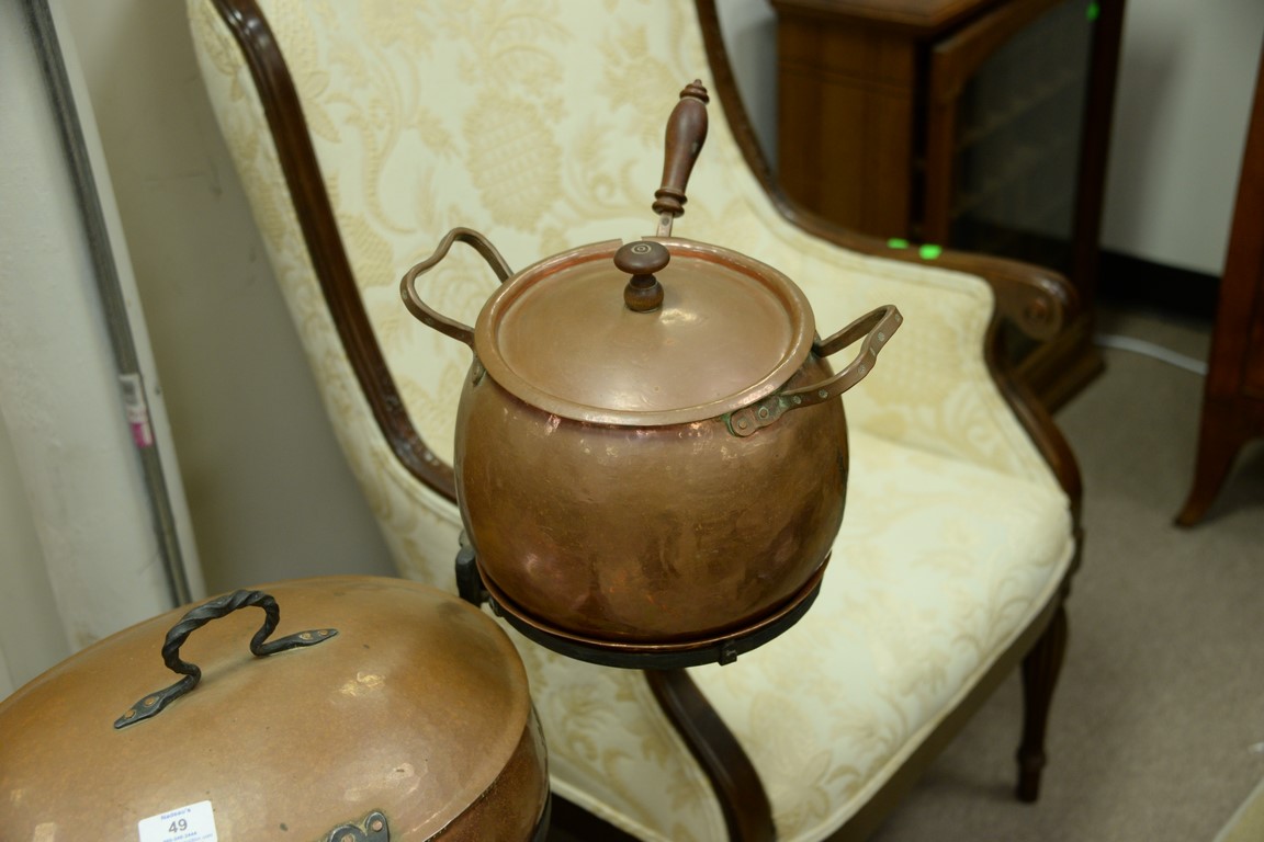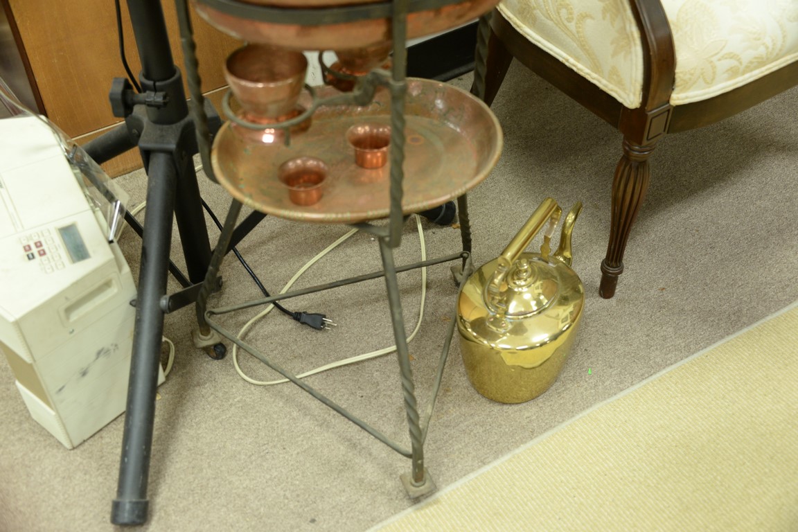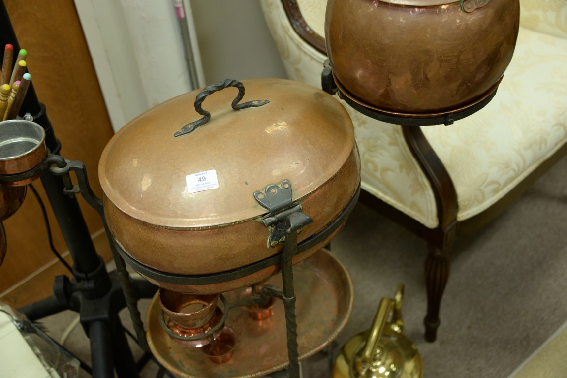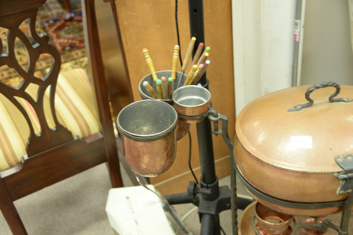 Lot 49: LA Monda copper fondue set on turned iron stand having center oval pot with iron hinges over burners, hand hammered. ht. 39in., wd….