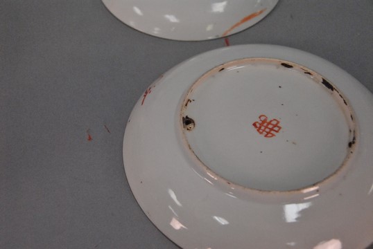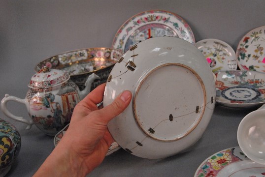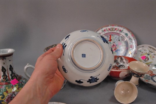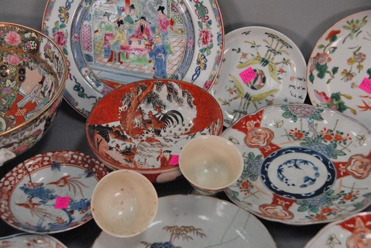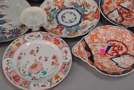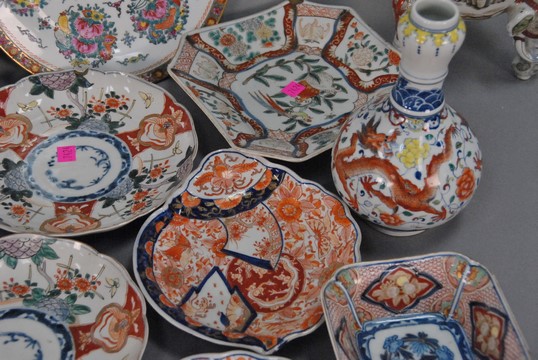 Lot 49: Large group of Imari, Famille Rose, and Chinese export to include group of Rose Famille plates, Imari leaf dishes and small plates, …