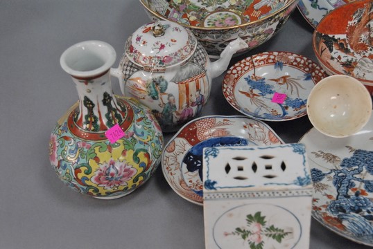 Large group of Imari, Famille Rose, and Chinese export to include group of Rose Famille plates, Imari leaf dishes and small plates, Rose Famille bowl, Chinese export tea pot, and two Oriental vases, etc. largest ht. 11 in.