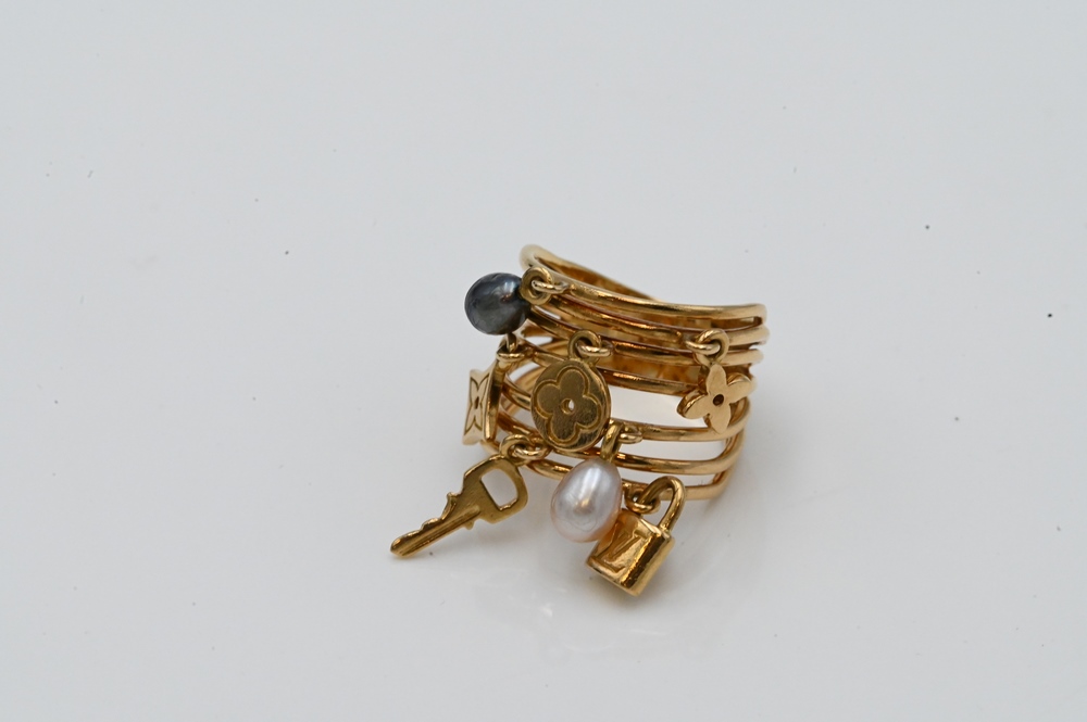 Lot 49: Louis Vuitton 18 Karat Gold Ring with Charms, #KCA260, size 4 3/4, 8.3 grams.