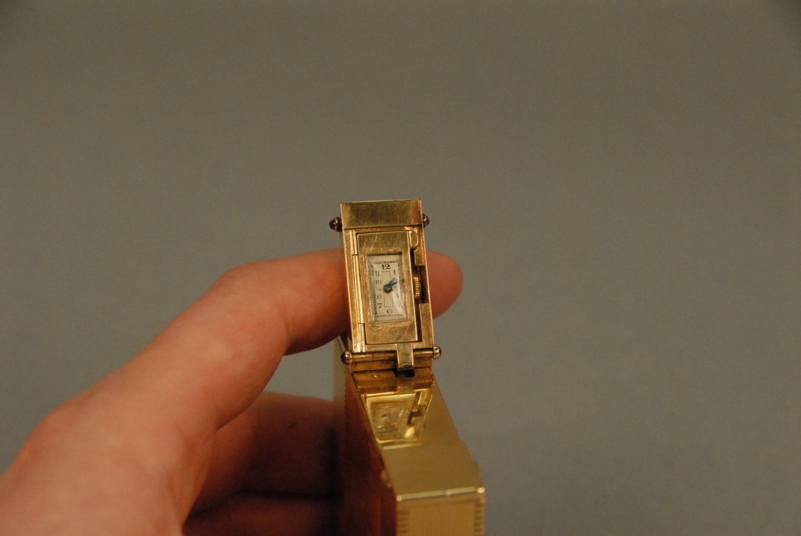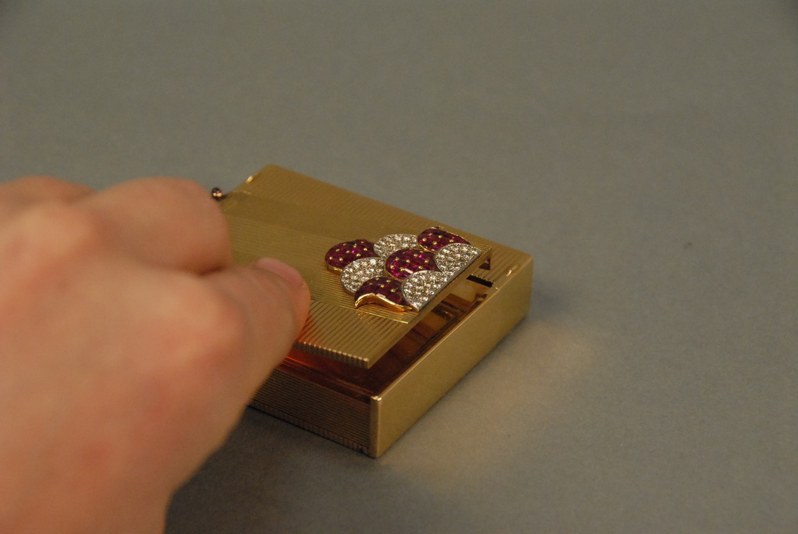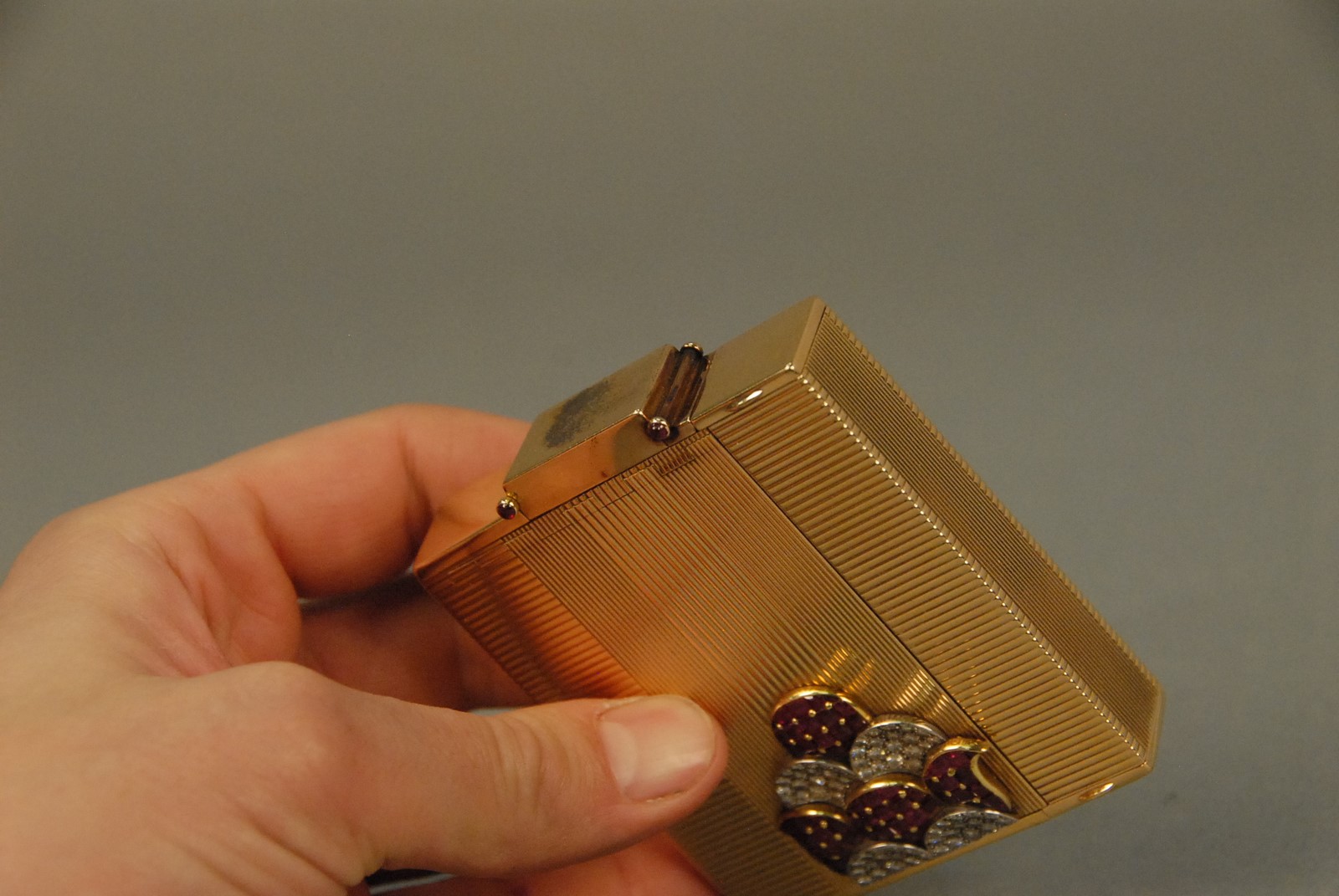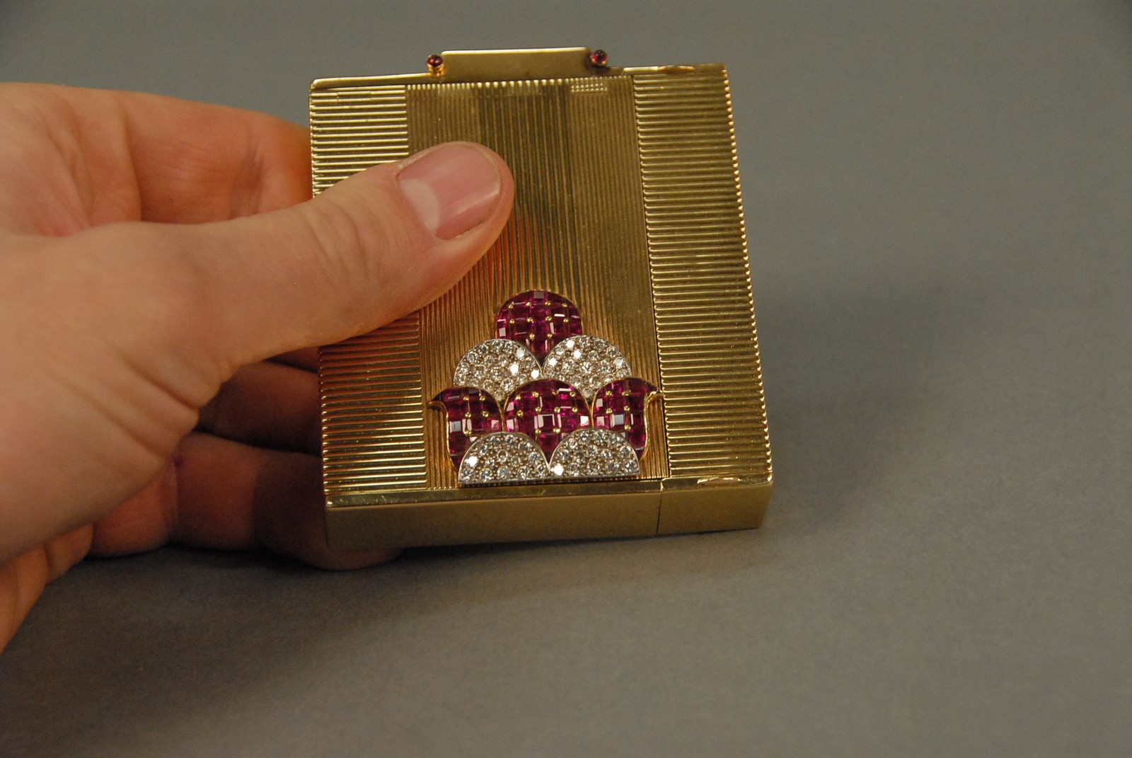 Lot 49: Ostertag Art Deco 18K yellow gold compact having compartments for lipstick, lighter, mirror, powder, watch, and comb, set with 66 rubies and 66 diamonds, each piece having an eagle head touch mark, marked Ostertag Paris Depose 39149, 289.9 grams tota