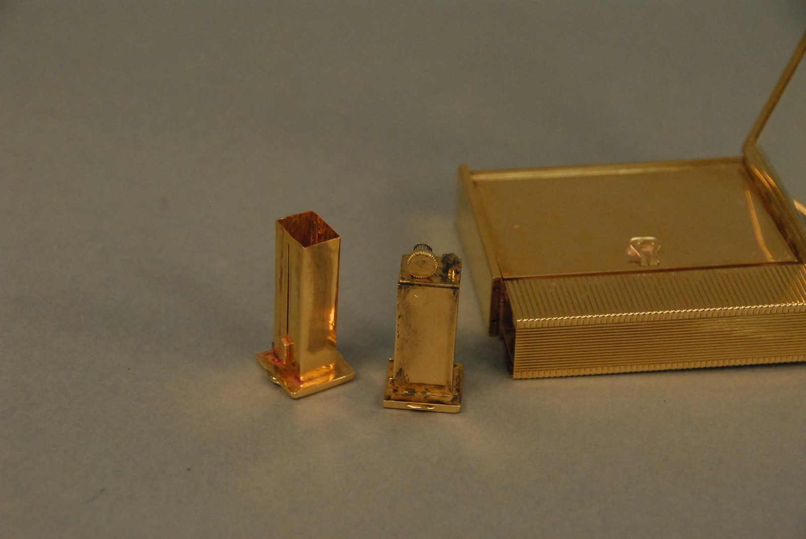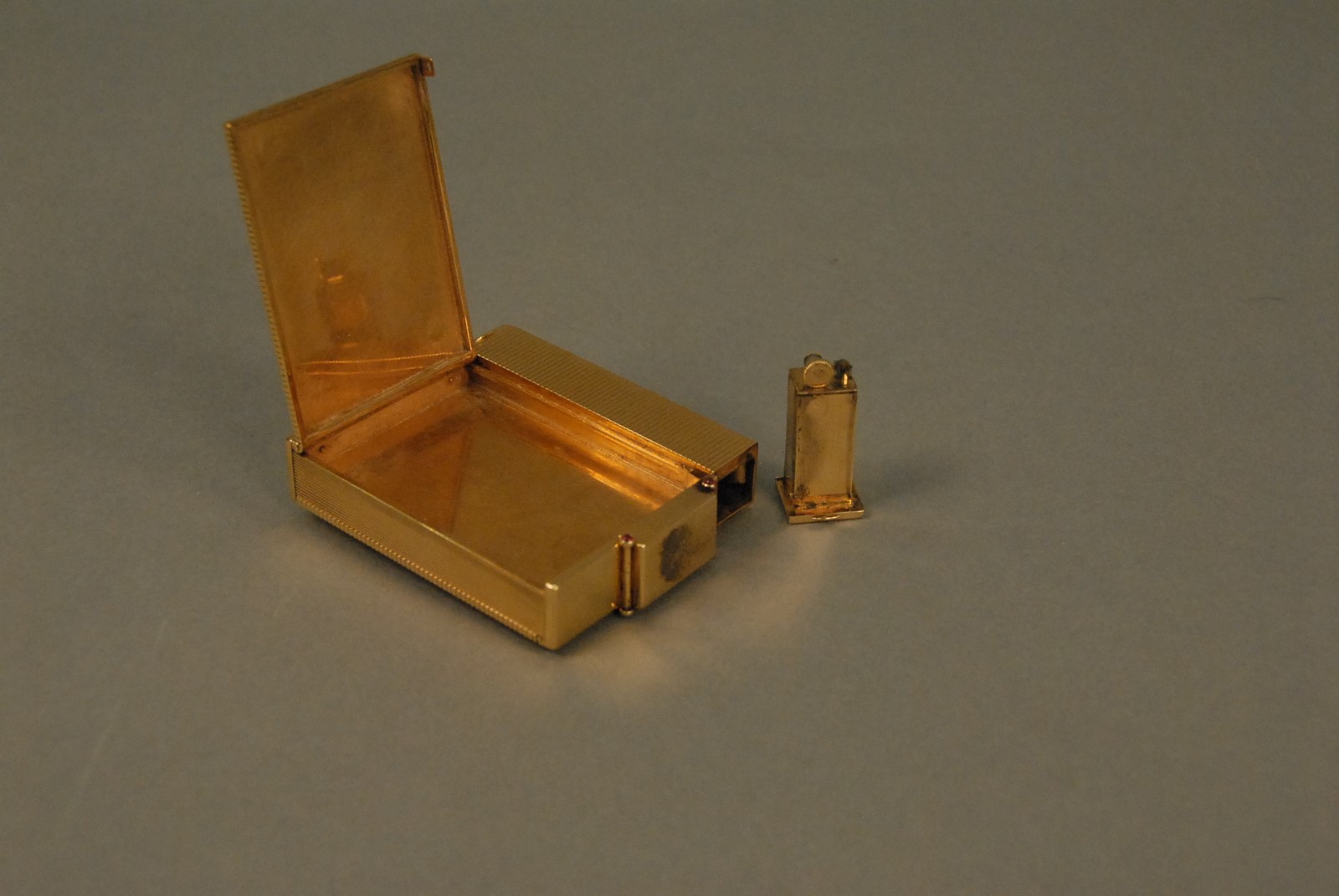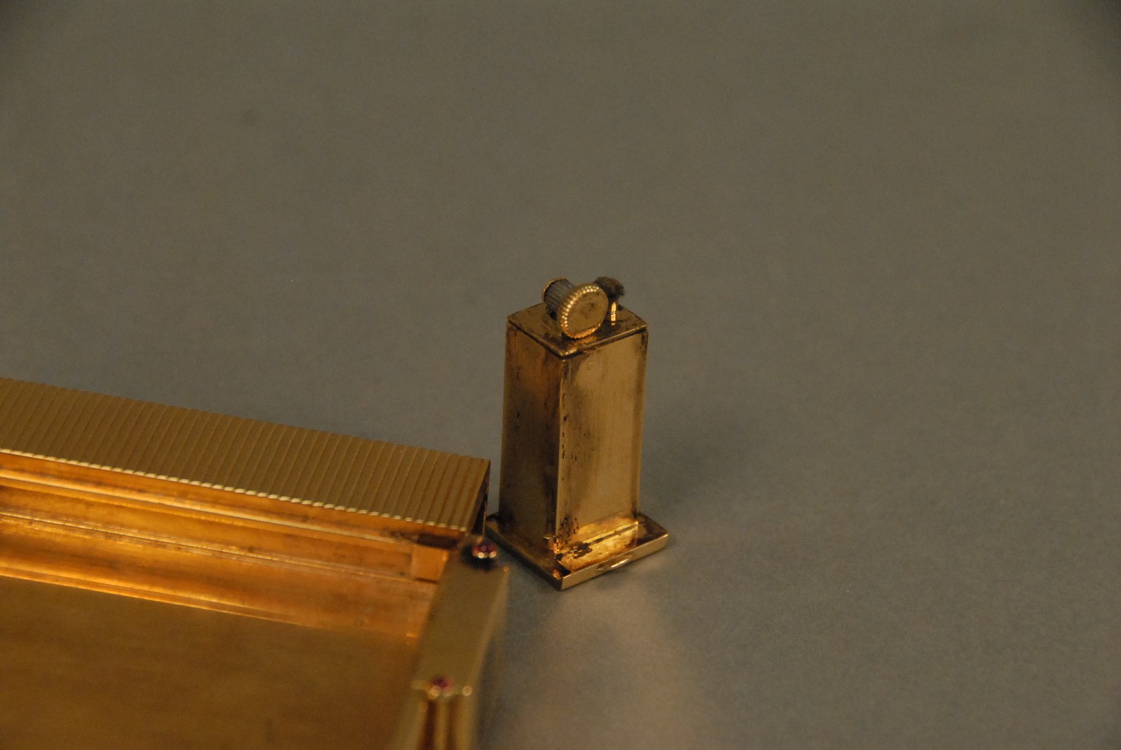 Lot 49: Ostertag Art Deco 18K yellow gold compact having compartments for lipstick, lighter, mirror, powder, watch, and comb, set with 66 rubies and 66 diamonds, each piece having an eagle head touch mark, marked Ostertag Paris Depose 39149, 289.9 grams tota