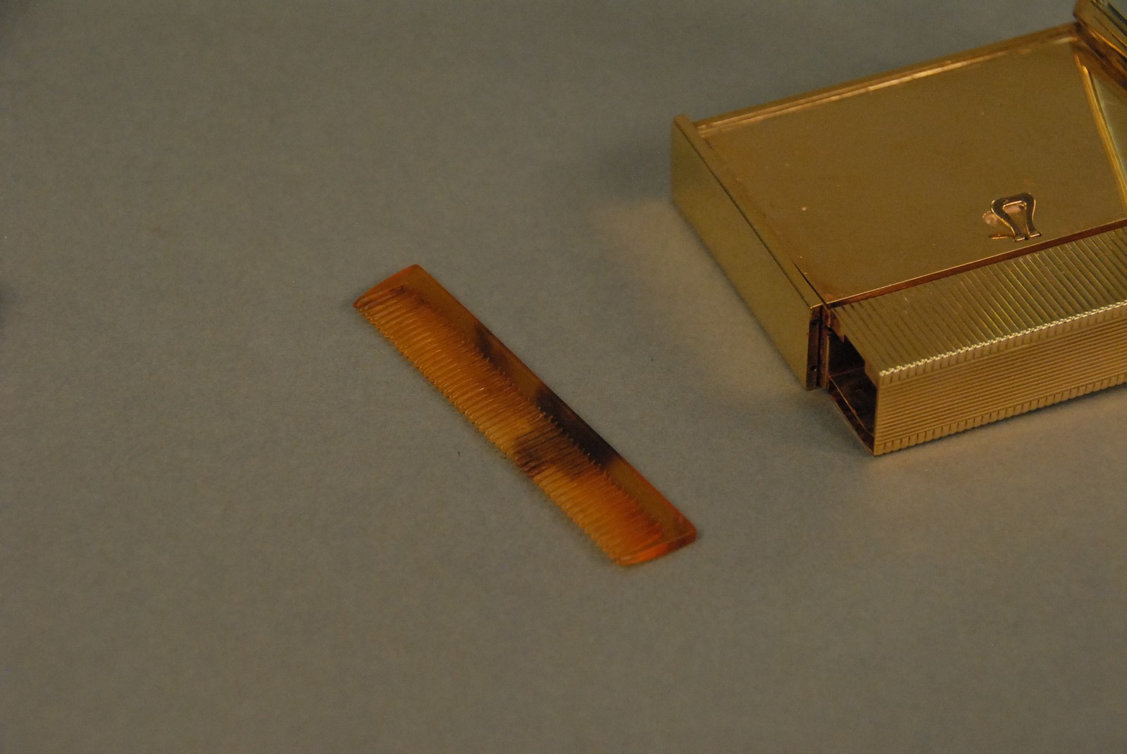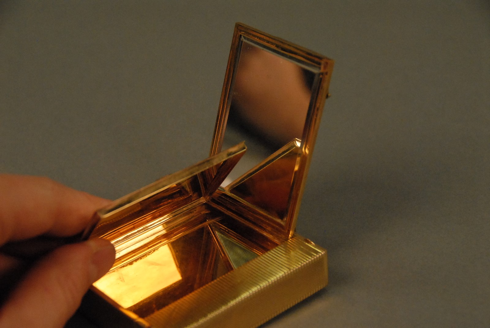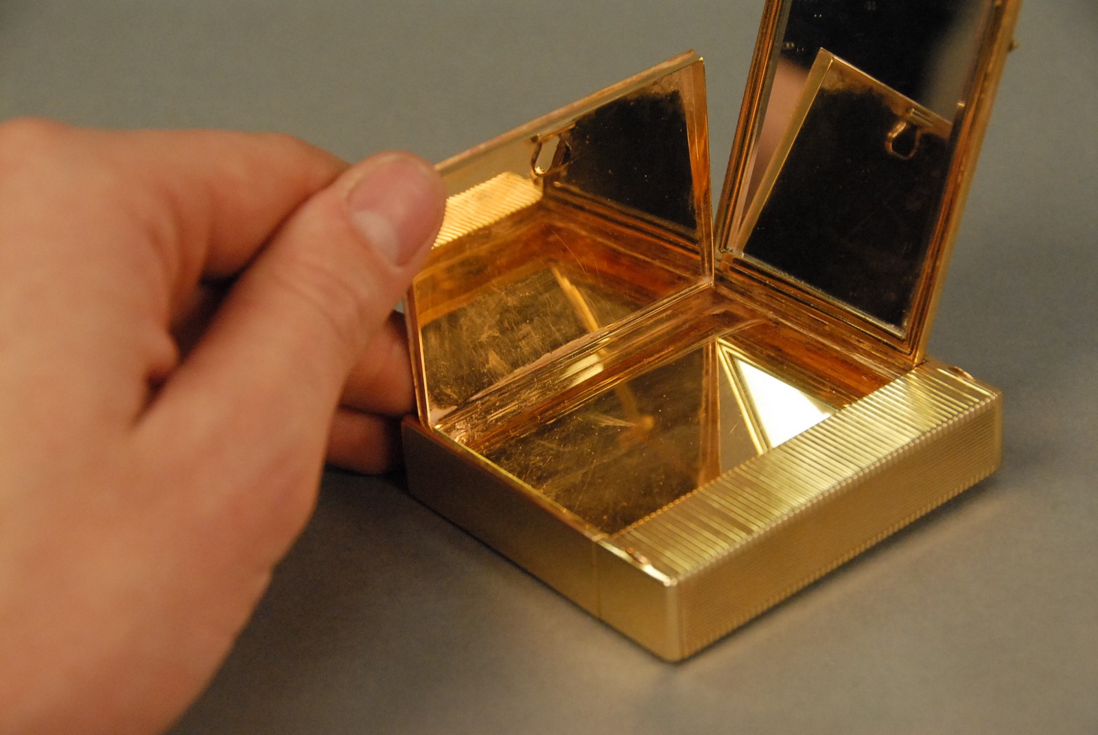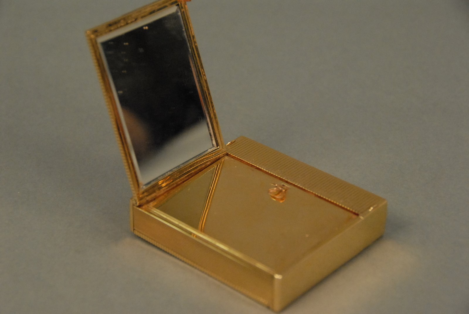Lot 49: Ostertag Art Deco 18K yellow gold compact having compartments for lipstick, lighter, mirror, powder, watch, and comb, set with 66 rubies and 66 diamonds, each piece having an eagle head touch mark, marked Ostertag Paris Depose 39149, 289.9 grams tota