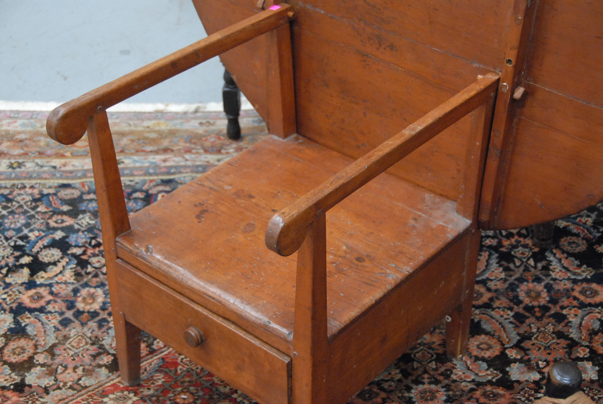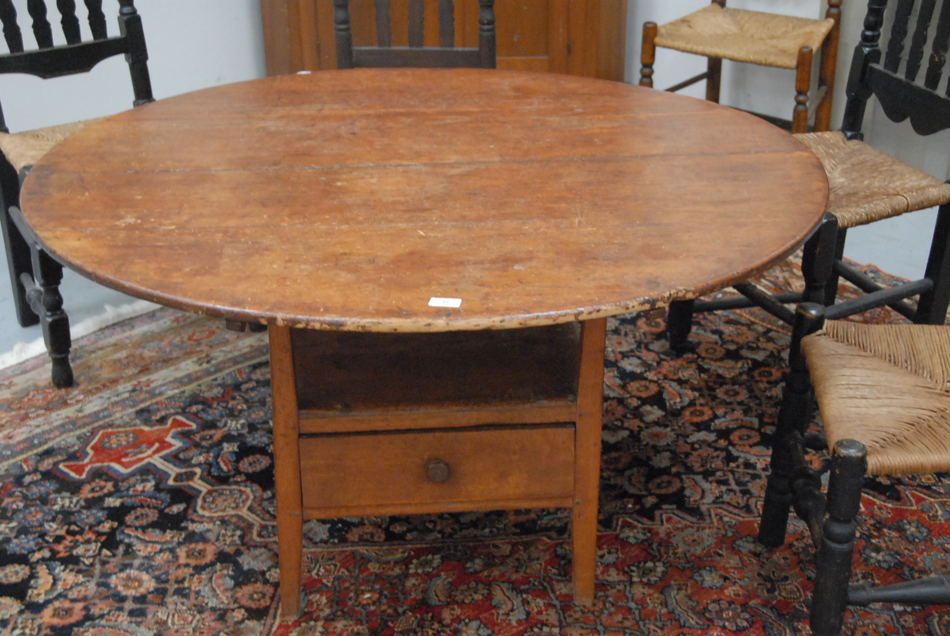 Lot 49: Primitive hutch table with round top on base with seat on square tapered legs, 18th century. dia. 48in., ht. 27in.