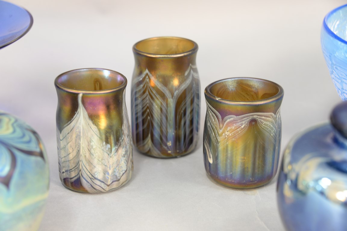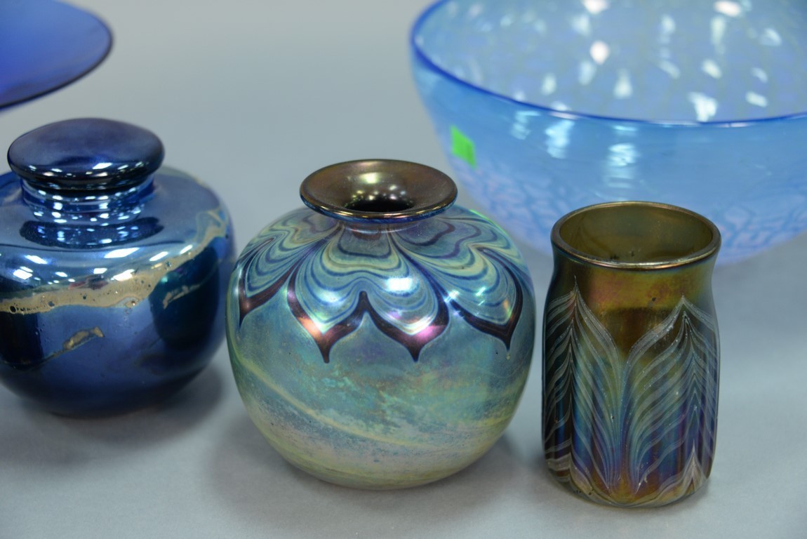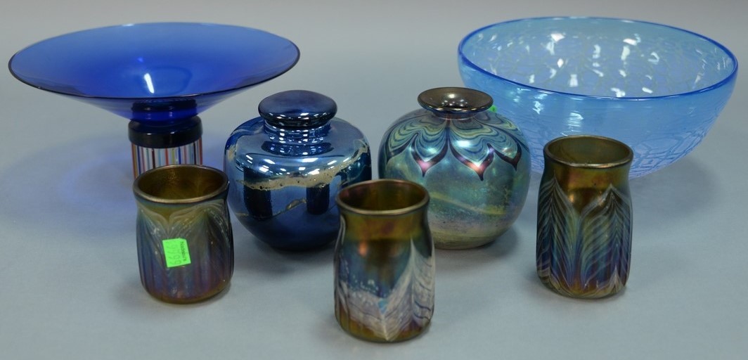 Seven art glass pieces to include art glass compote with multi-color candy cane base, large blue frosted and clear bowl, set of three Elaine Hyde art glass goblets with pulled feather design, Hartman art glass iridescent vase with pulled feather design, and a John Reep art glass jar with cover. ht. 3 1/2in. to 5in.