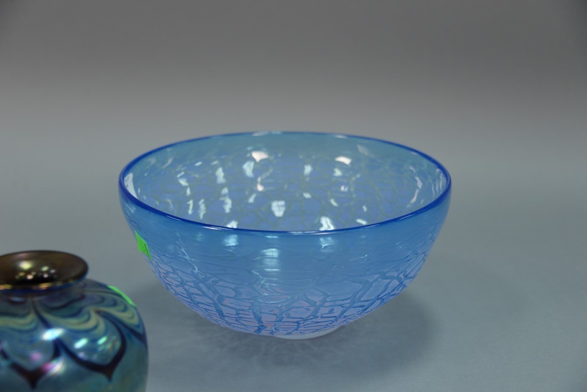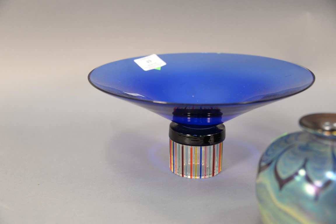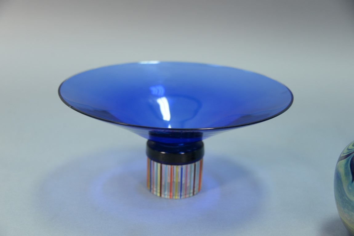 Lot 49: Seven art glass pieces to include art glass compote with multi-color candy cane base, large blue frosted and clear bowl, set of thr…