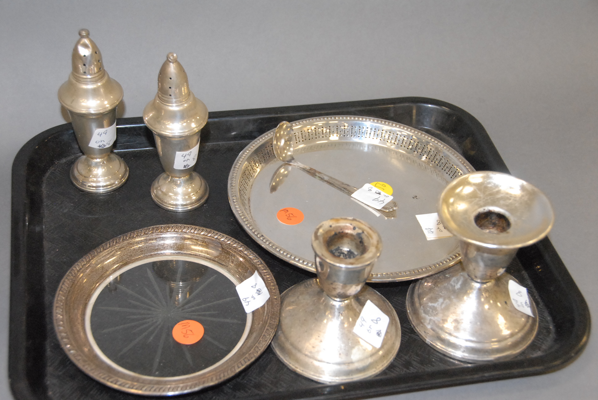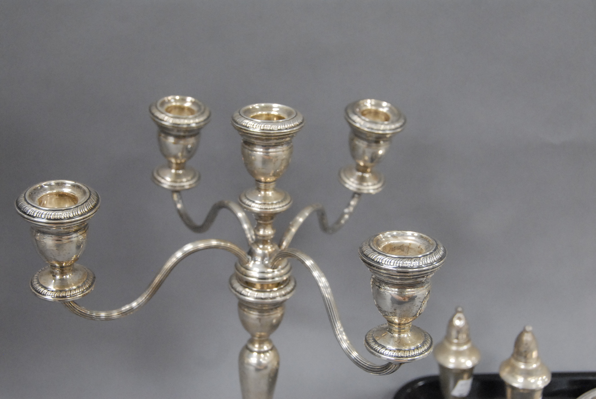 Silver tray lot to include a small plate, sterling silver candelabra, sticks, pepper shakers.
