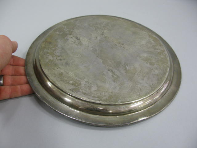 Sterling silver round tray with a coat of arms having shield engraved center marked J.E. Caldwell