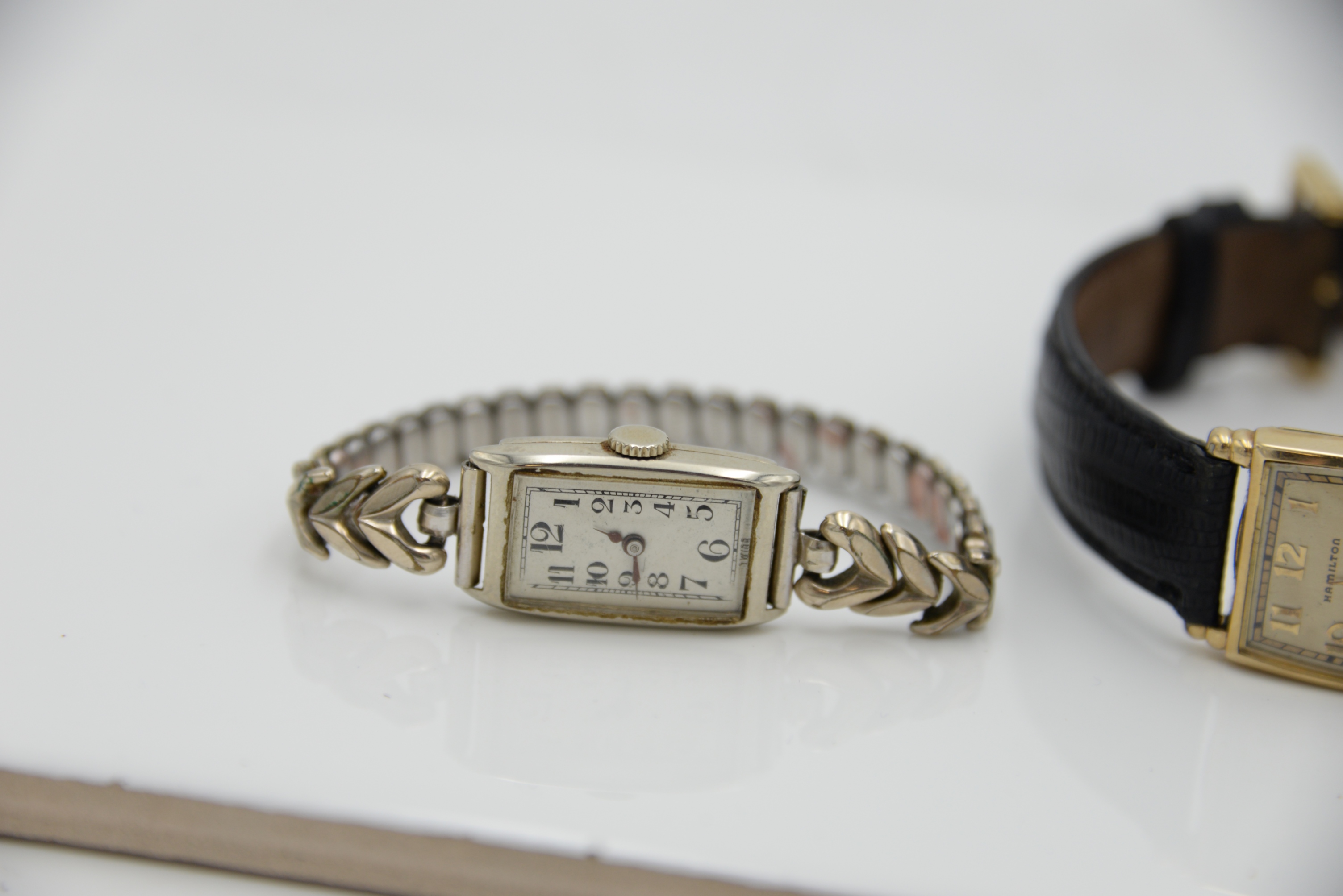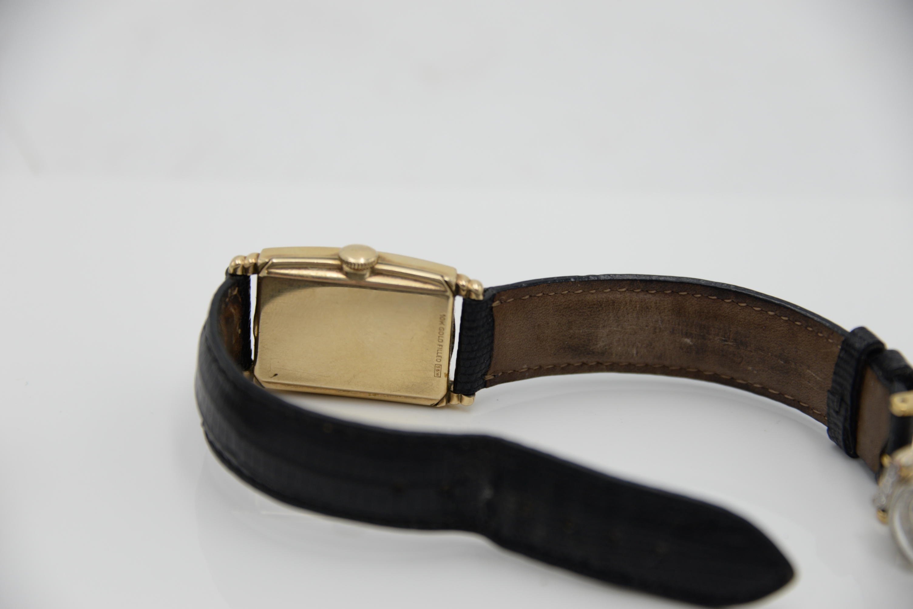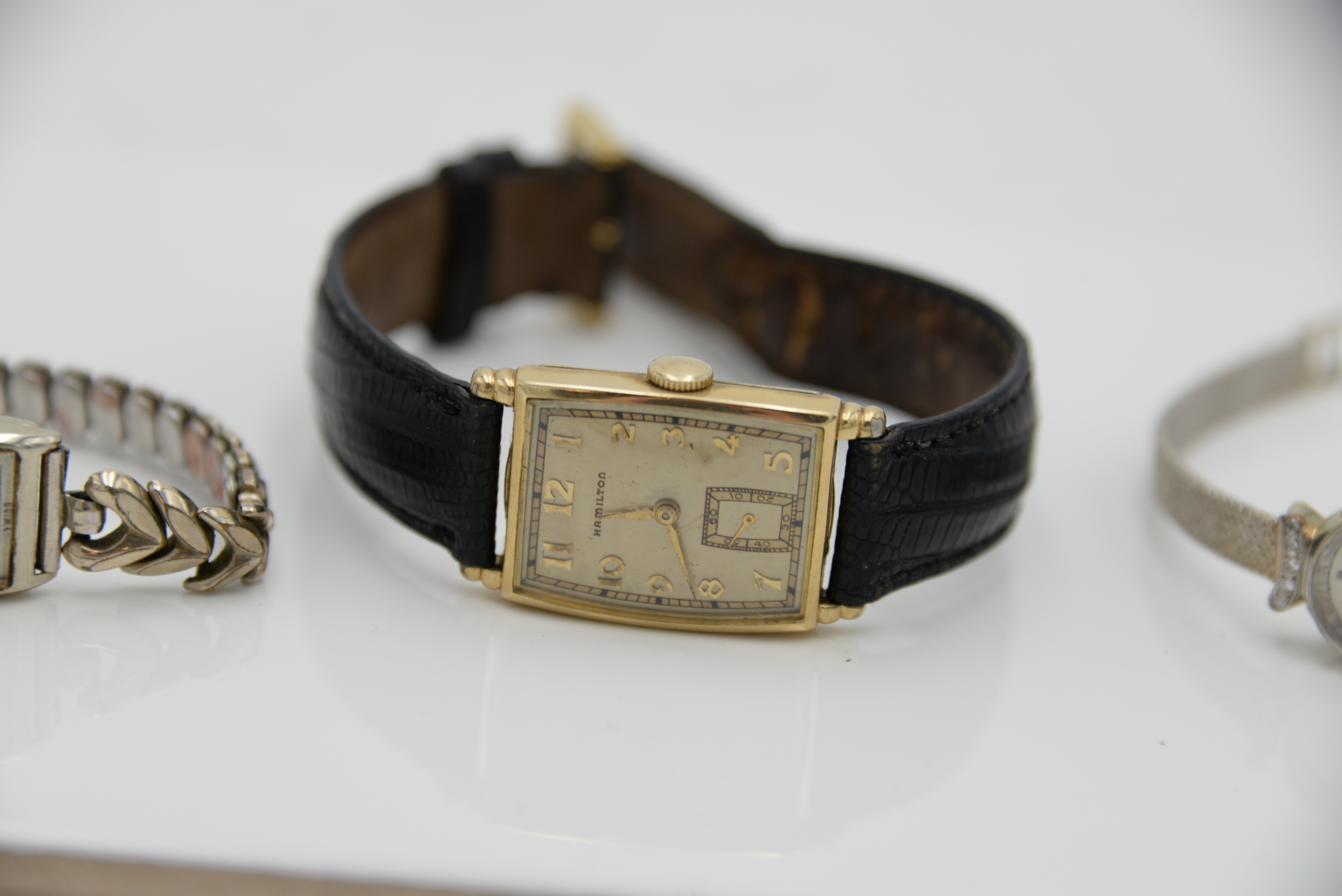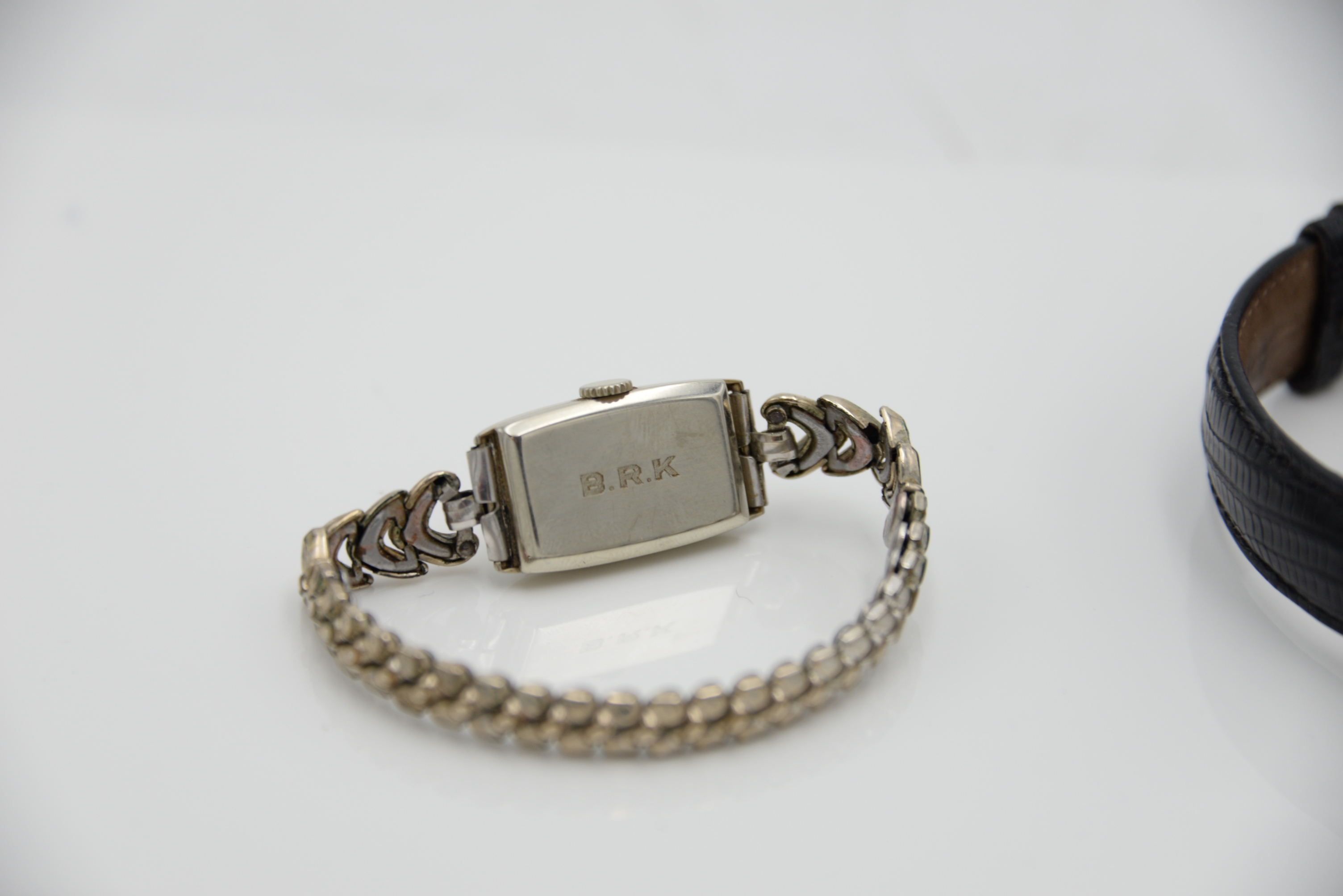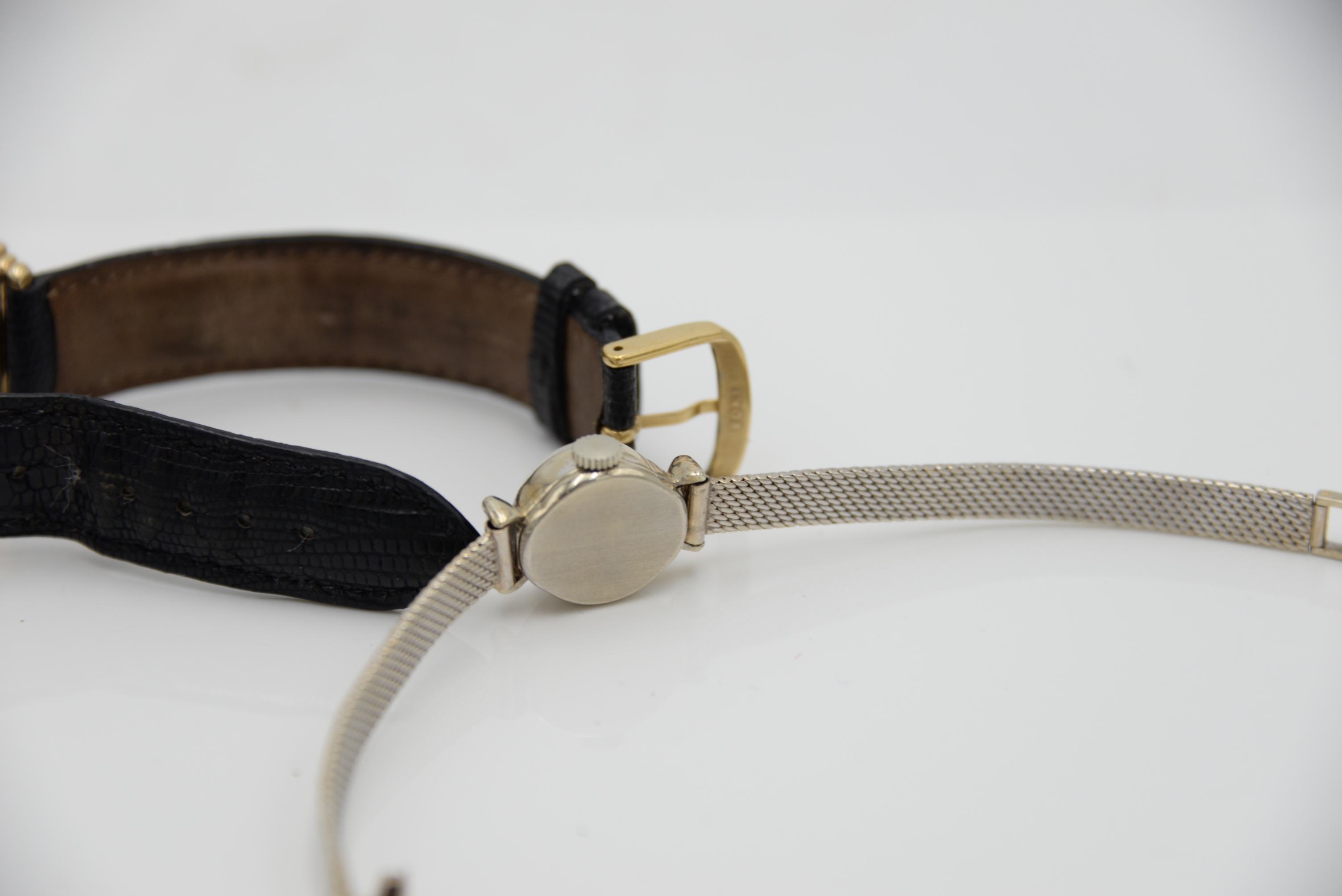 along with a ladies Cabot 14 karat white gold rectangular wristwatch having non-gold bracelet