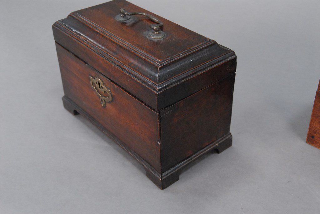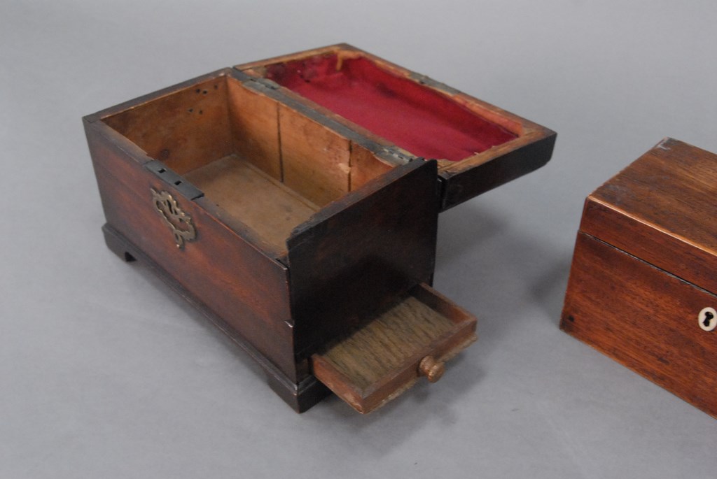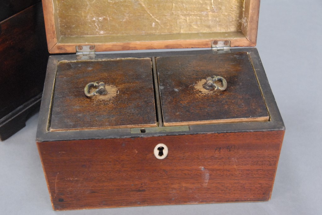 Two piece lot to include a mahogany tea box with two covered compartments inside and mahogany tea box with hidden drawer inside bottom.