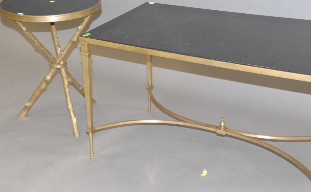 Two slate top tables with metal base one rectangular ht. 20, lg. 36 and one circular ht. 21, dia. 17.