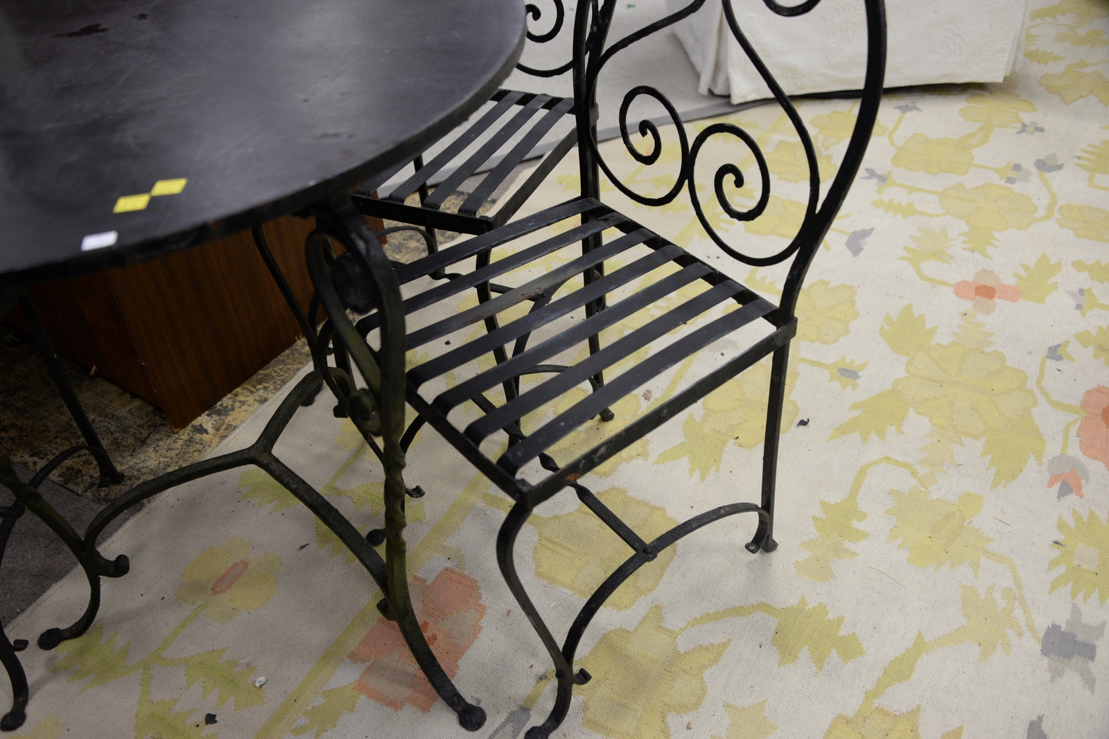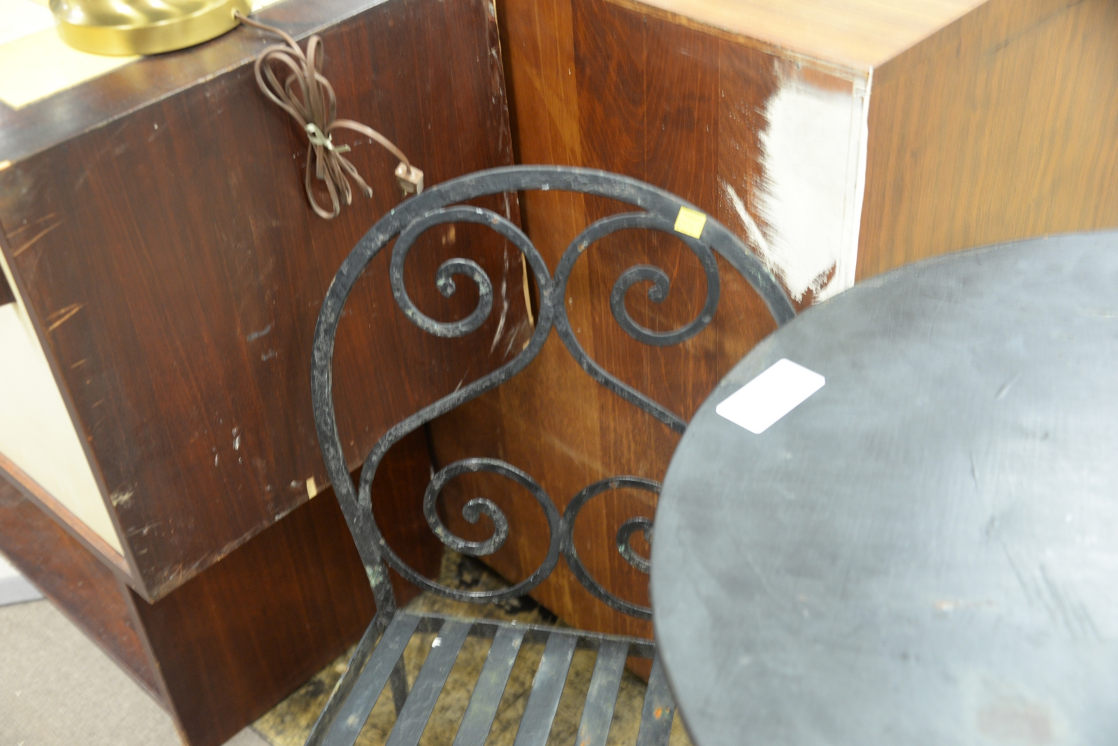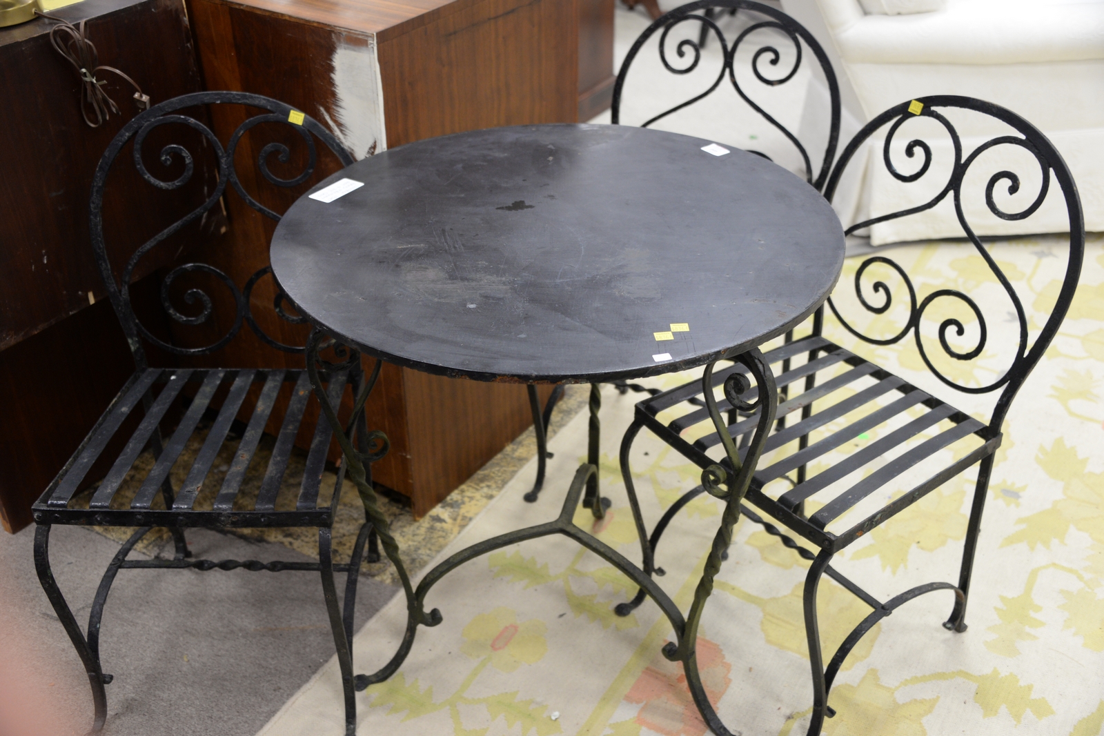 Four piece iron set with metal top table. ht. 29in., dia. 29in.
