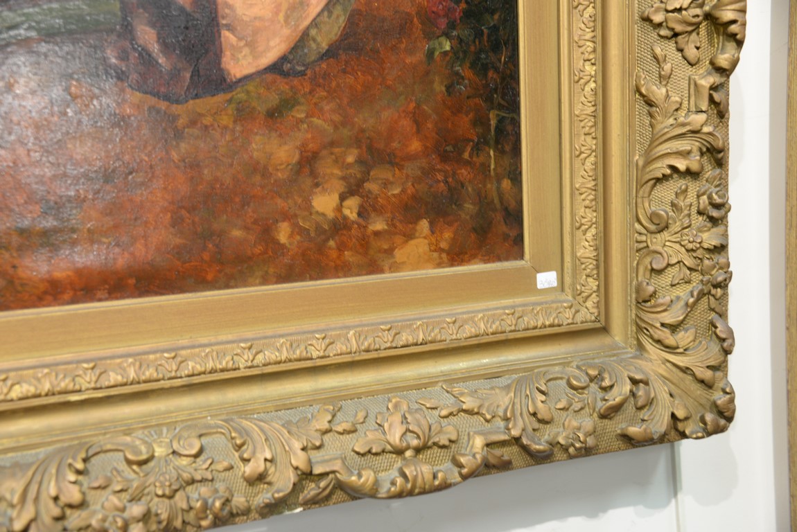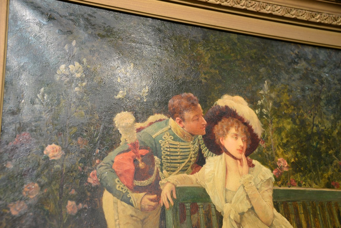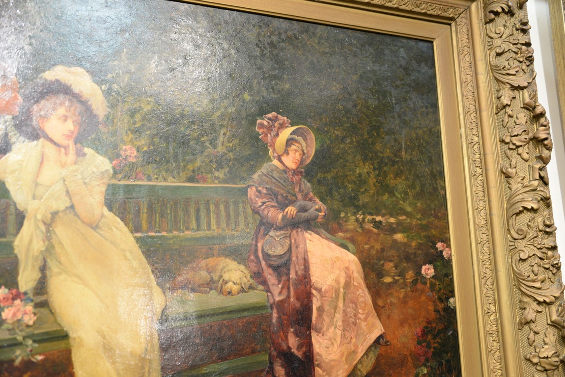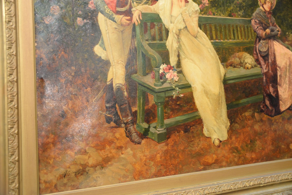 Lot 490: Henry Gillard Glindoni 1852-1913 Romantic Scene Conversing at the Park oil on canvas signed lower left: H. Gillard Glindoni 30…