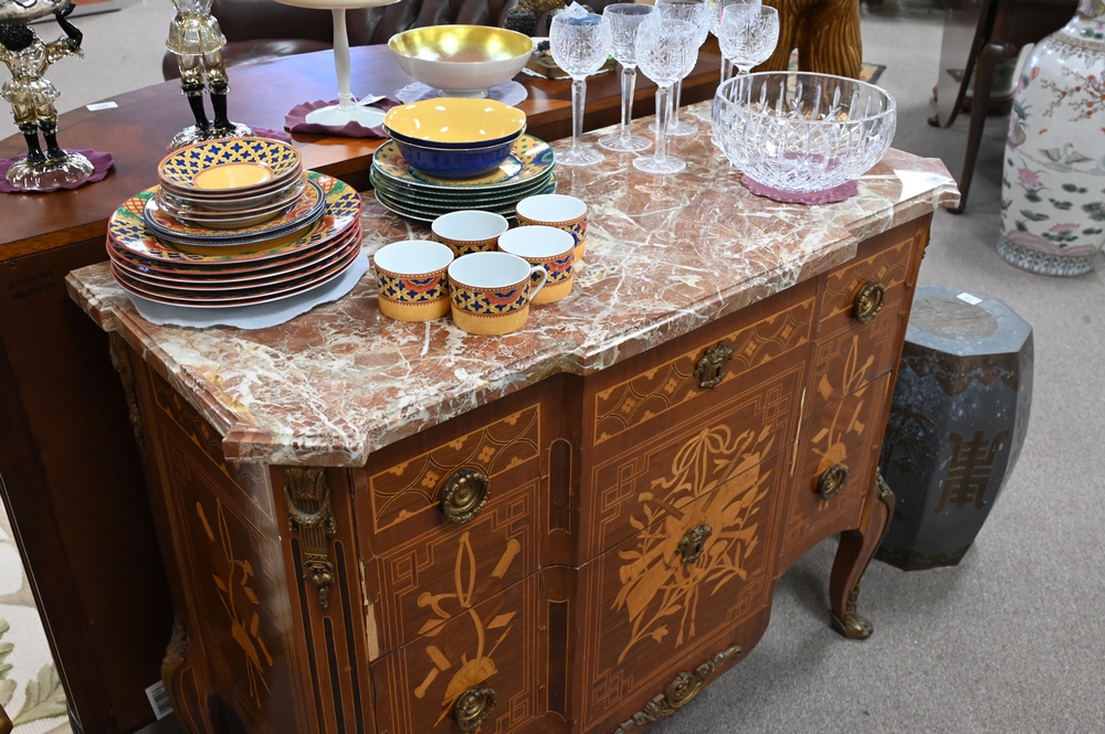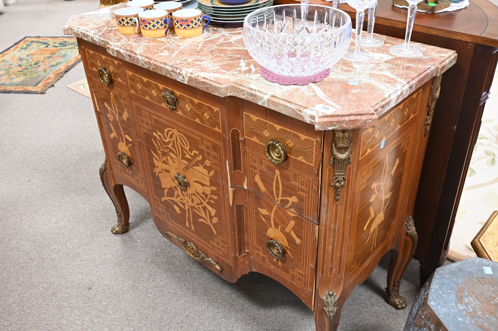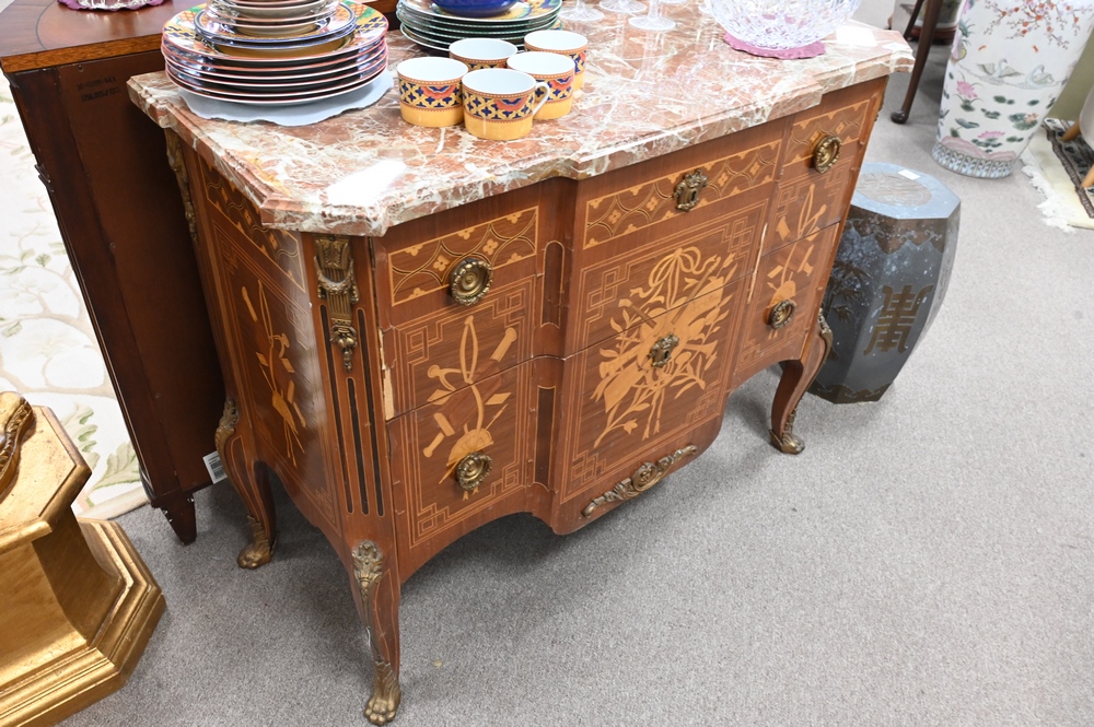 Louis XV Style Commode, having marble top, (veneer chips), height 34 inches, top 19″ x 42″.