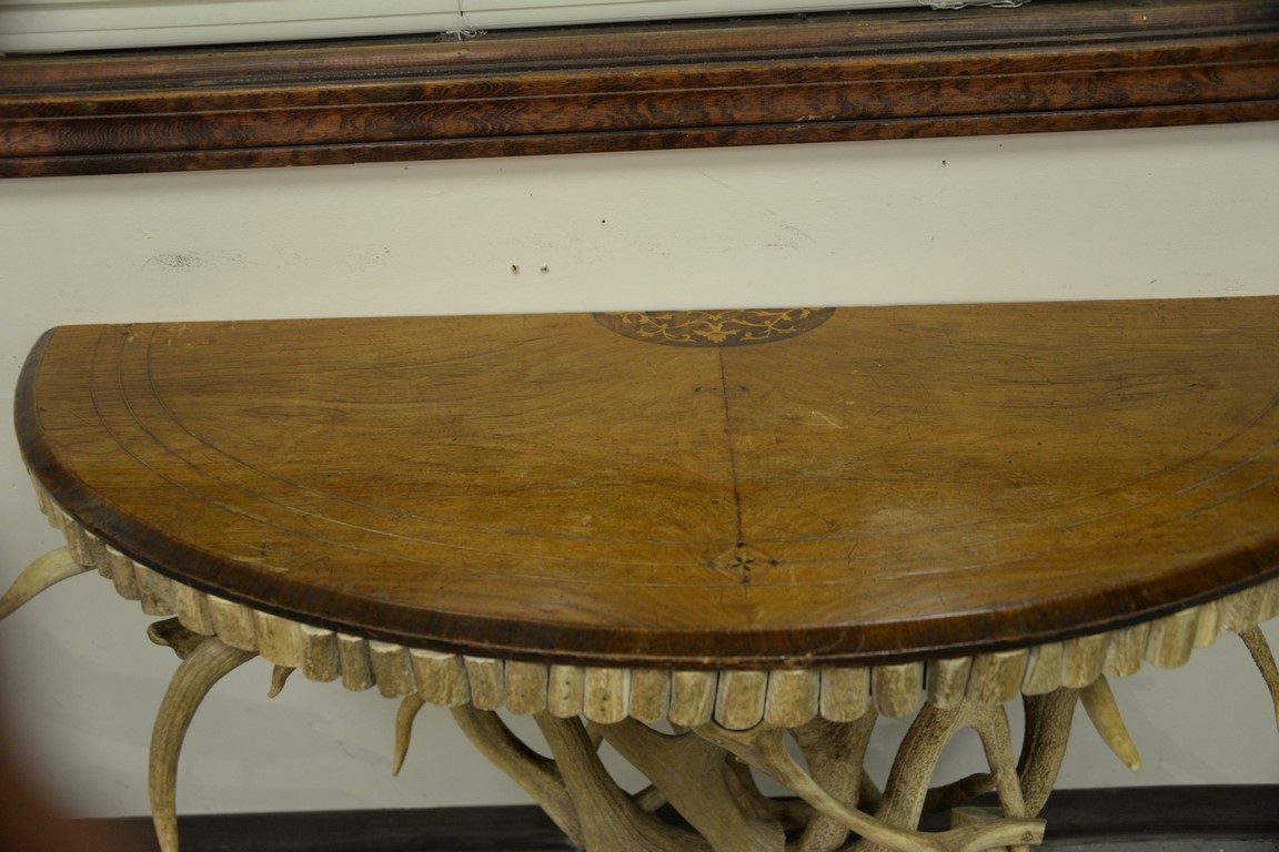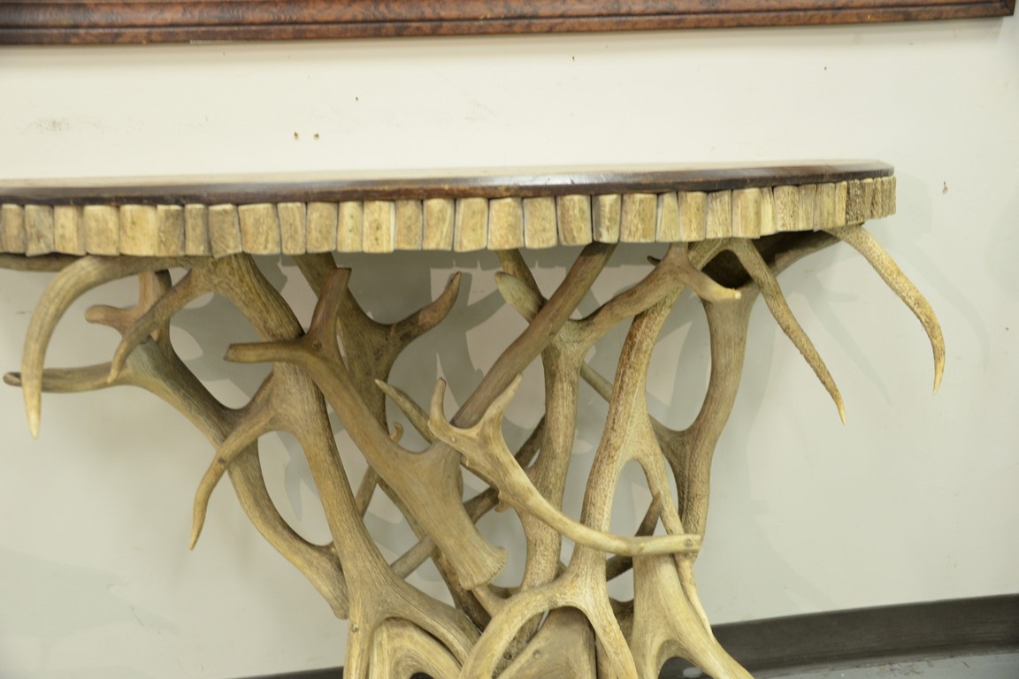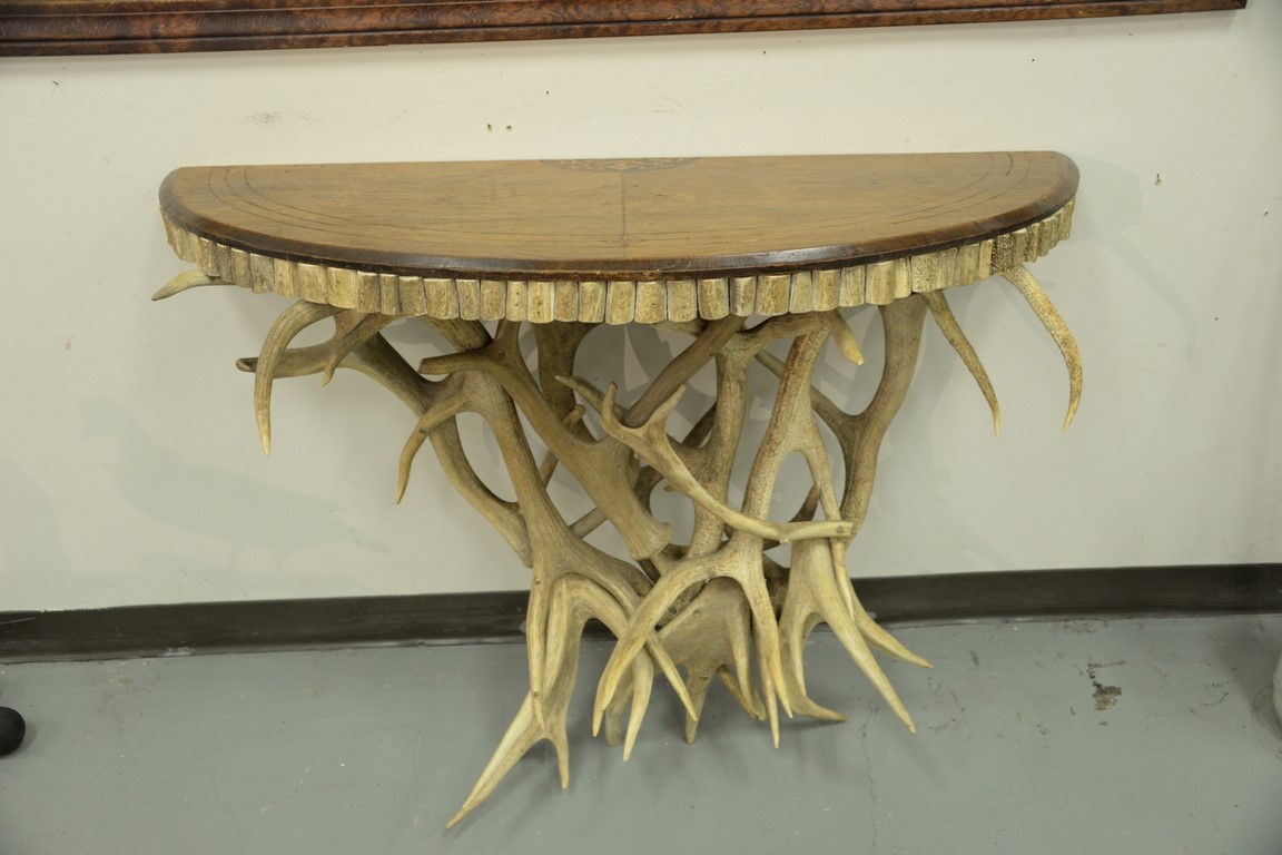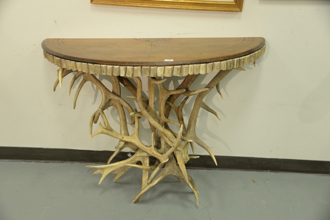 Lot 490: Pair of half round console tables with inlaid top over base made up of multiple antlers. ht. 33 1/2in., wd. 46in.