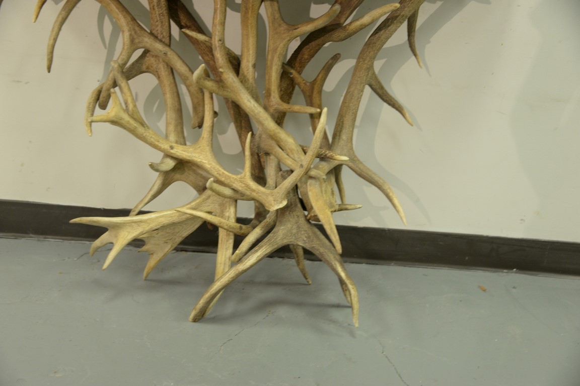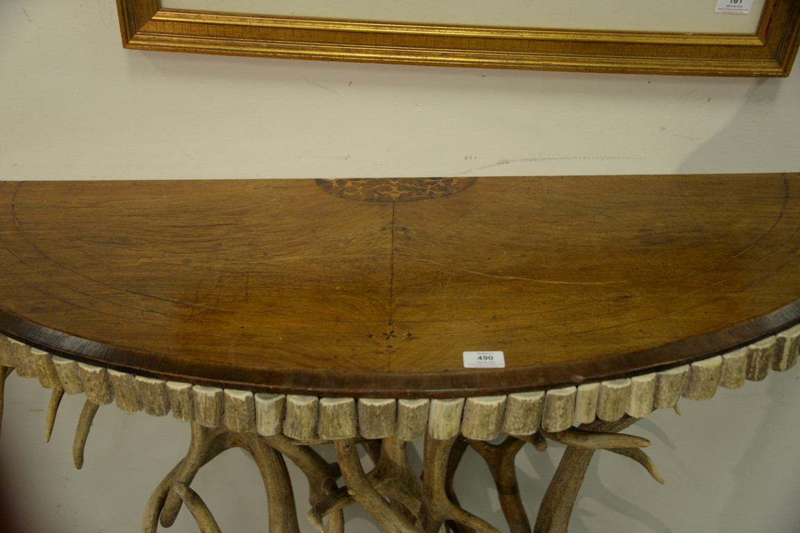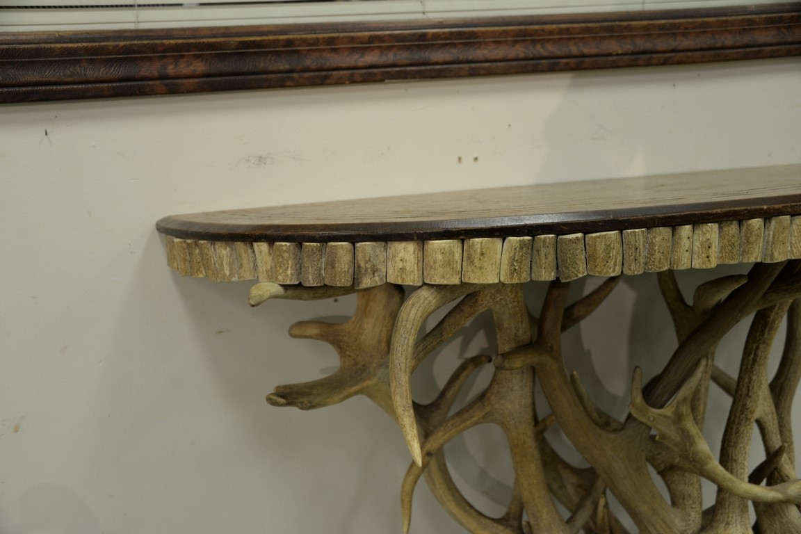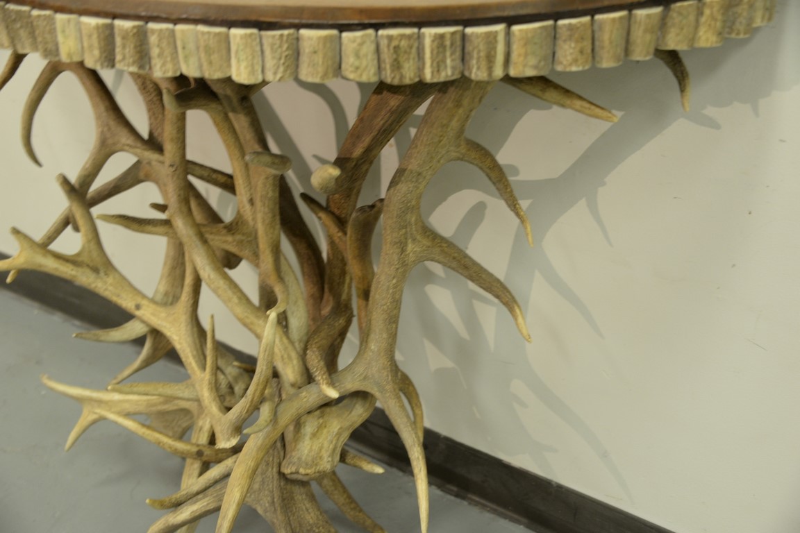 Lot 490: Pair of half round console tables with inlaid top over base made up of multiple antlers. ht. 33 1/2in., wd. 46in.