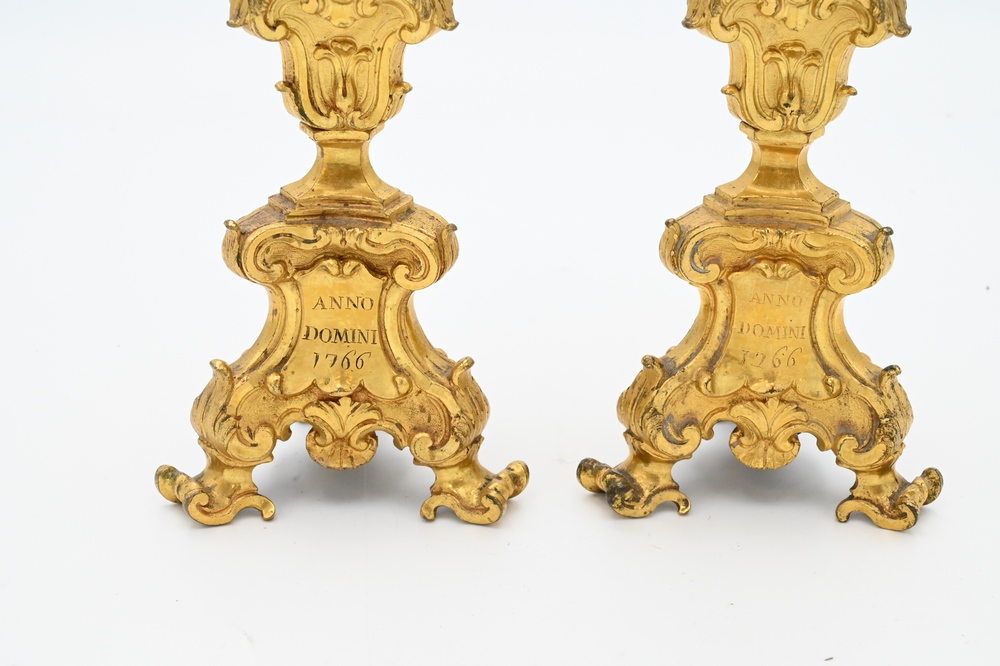 Pair of Small Continental Pricket Candlesticks each on foliage scroll and rocaille base, balster stem with circular drip pan, central pricket engraved “Joannes Maria Riminaldus”; Anno Domini 1766 height 11 3/4 inches Provenance: This is two of four sold at Christie’s, December 9, 2009, lot 529, originally from “The Collection of a Lady”. Property from the Estate of Alexis Gregory, Sold to Benefit the Alexis Gregory Foundation.