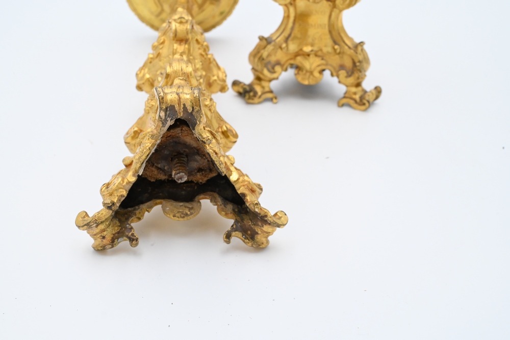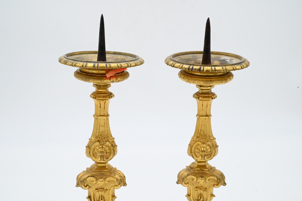Lot 490: Pair of Small Continental Pricket Candlesticks each on foliage scroll and rocaille base, balster stem with circular drip pan, centra…