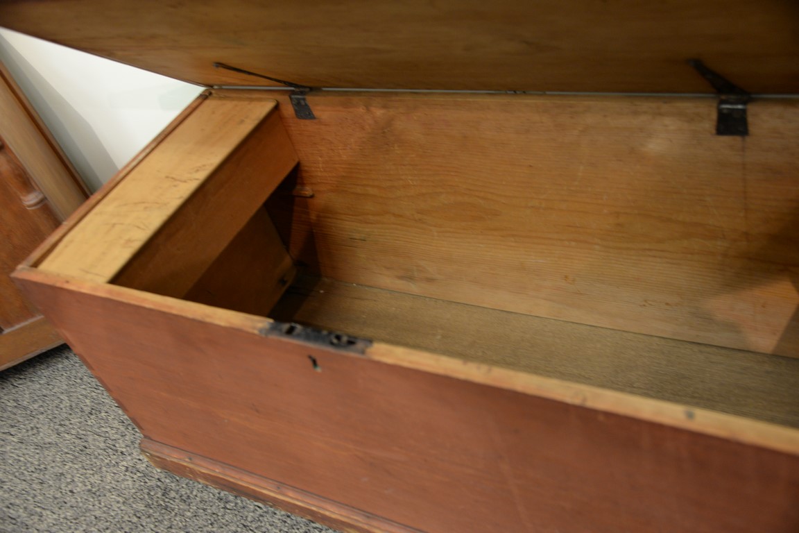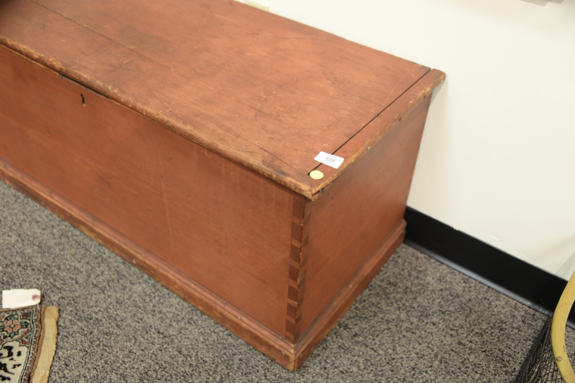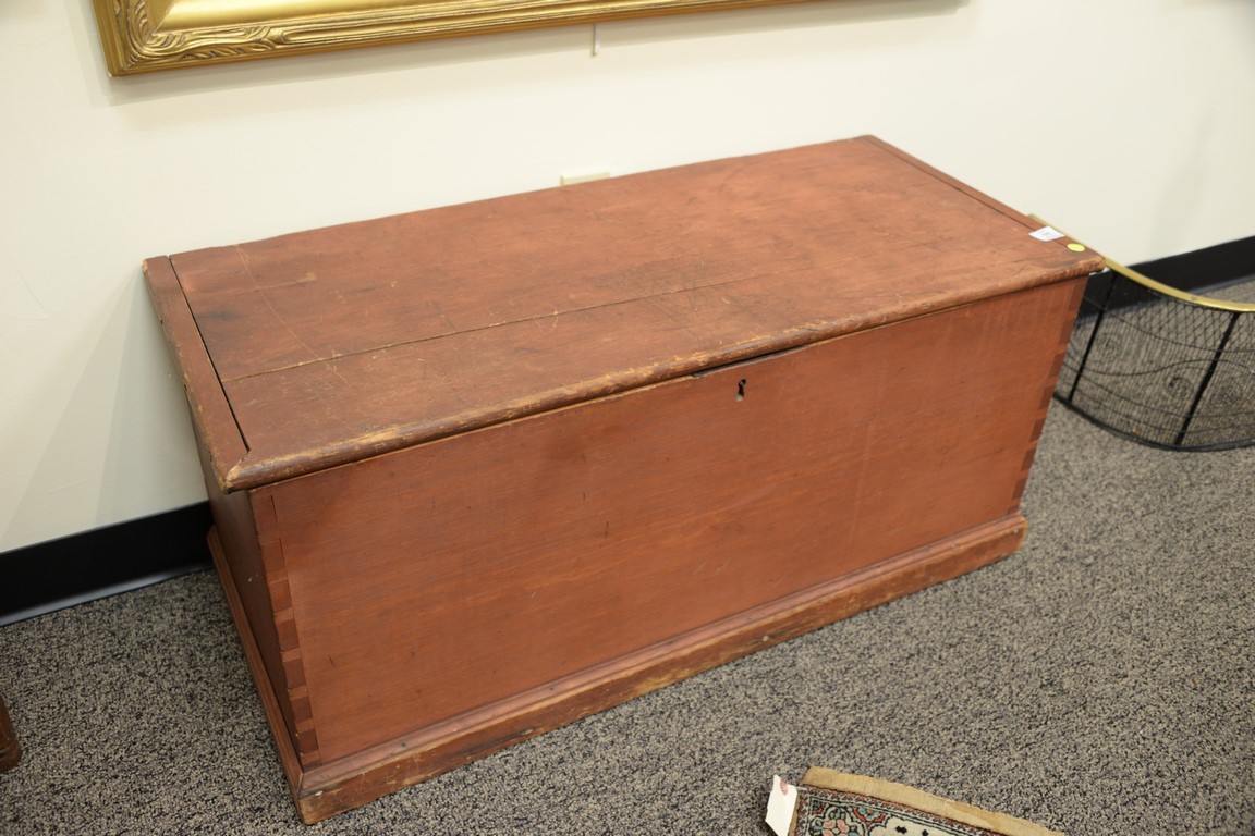 Lot 490: Primitive lift top floor chest with dovetailed corners original hinges in old red finish. height 18 inches, width 39 1/2 inches