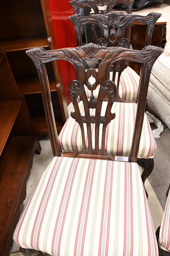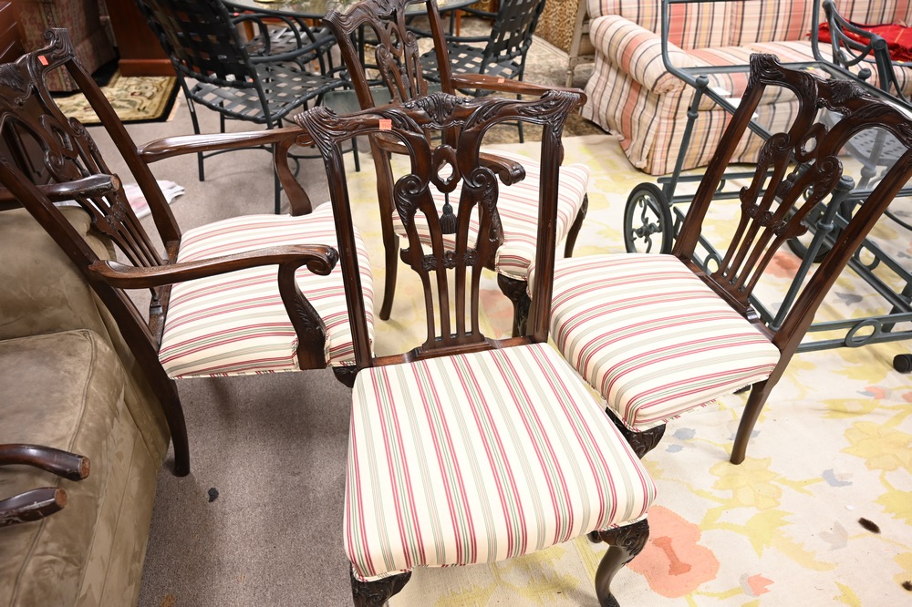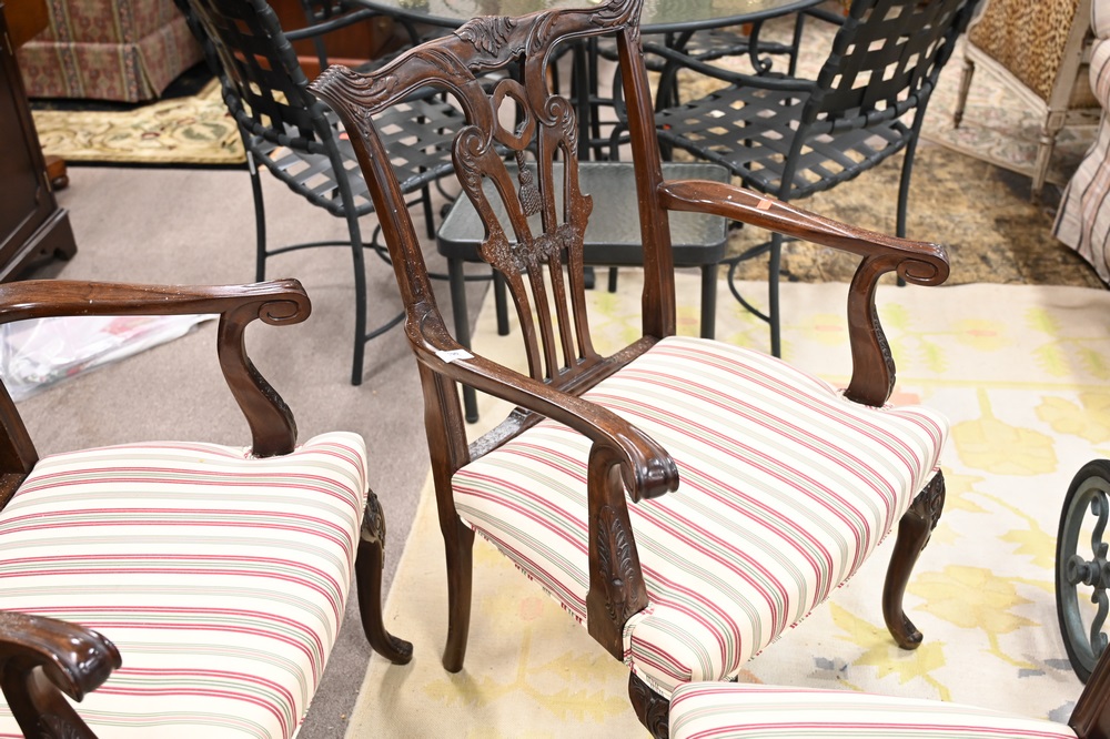 Lot 490: Set of 10 Louis XV Style Dining Chairs, having striped upholstered seats over cabriole legs, seat height 17 1/2 inches.